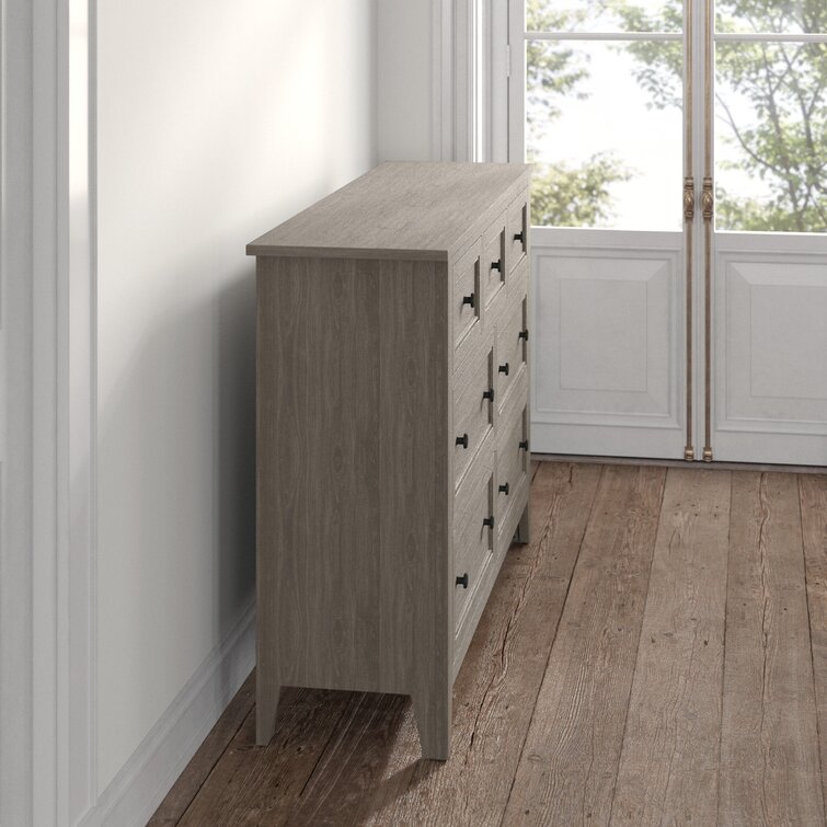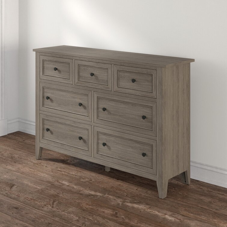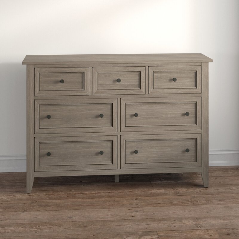 Not enough space for your wardrobe in your closet? Don't worry, this 7-drawer dresser has your back! Crafted from solid wood, this piece features seven drawers (including felt-lined drawers) on ball-bearing glides, so there's plenty of space for slacks, T-shirts, and sweaters. Plus, its weathered finish and clean-lined design with molding detail around the drawers lend it an understated classic look perfect for styles from coastal to French country. Measuring 61.5'' W, this dresser is the perfect size for slipping into most bedrooms. Hand-curated by Kelly Clarkson