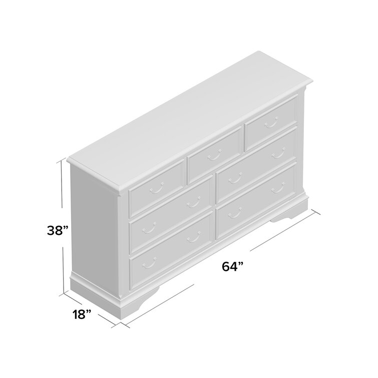 This dresser comes with plenty of room, with the many drawer sizes allowing you to maximize storage. This dresser is 66 inches wide (167.5 cm), 40 inches tall (101.5 cm), and has a depth of 19 inches (48 cm).Smallest Drawer Interior:16.25'' H X 13.5'' W X 6.5'' D.Main Drawer Interior:25.75'' H X 28.3'' W X 7.5'' D