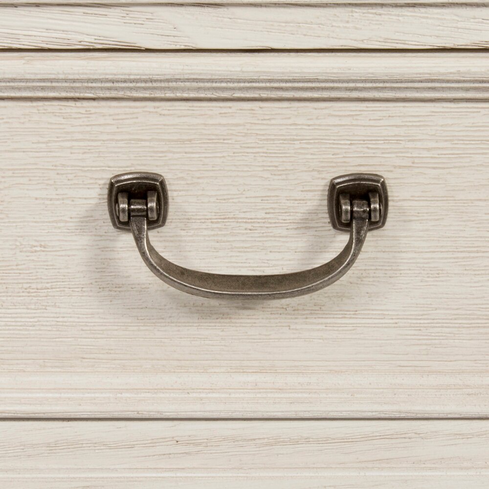 This cottage-style dresser features antique pewter bail hardware that adds to the piece’s rustic appeal.