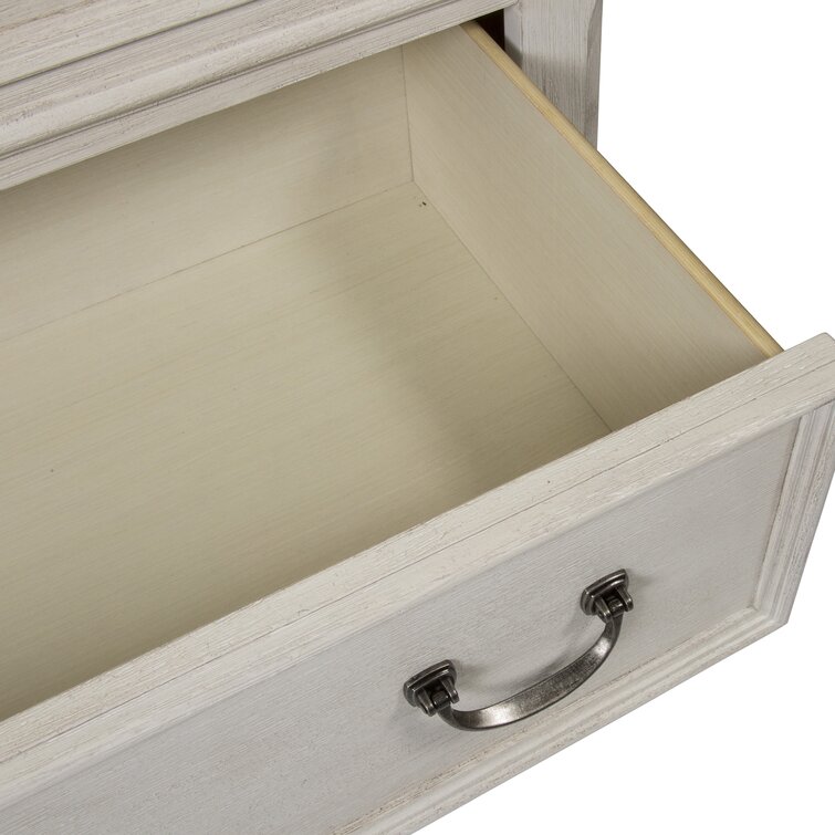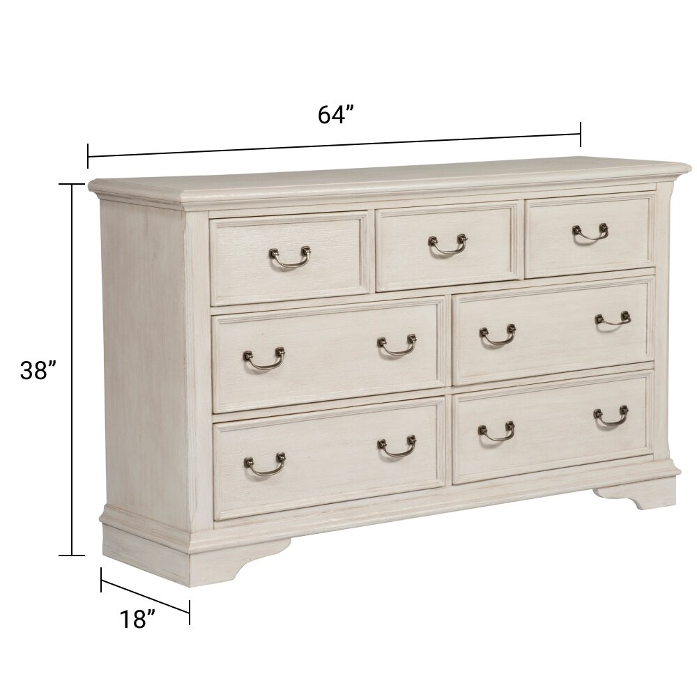 7 Drawer DresserEnhance your room with this timeless 7-drawer dresser, creating a shabby chic interior that all homeowners love. Crafted with pine solids and acacia veneers, this dresser is unique with its antique white finish accented by heavy wire brushing. Enjoy the abundance of storage with the 3 small drawers and 4 larger drawers, each equipped with bottom case dust proofing.