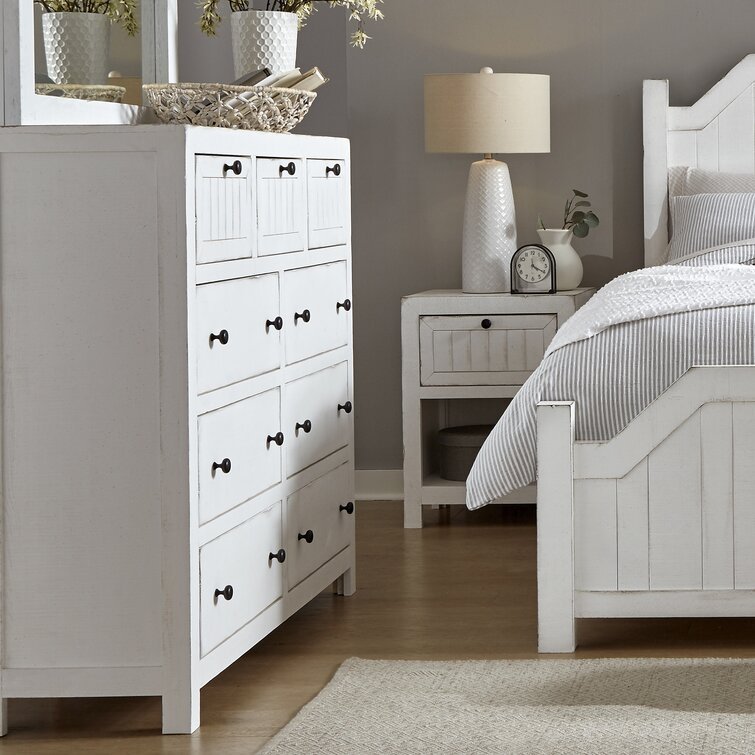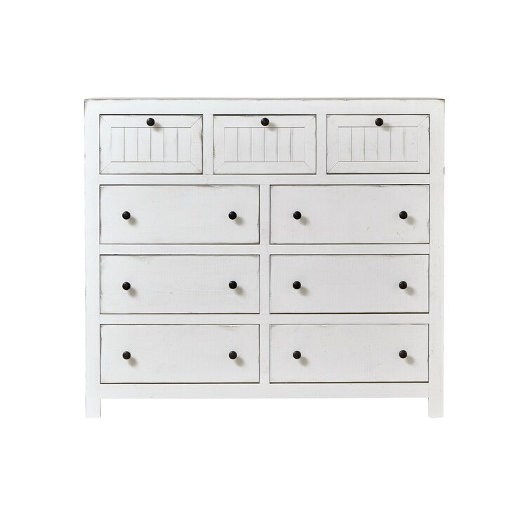This classic 54 wide dresser adds an element of farmhouse style to your bedroom. living room. or home office. It's made of solid wood in a distressed white finish. It features a rectangular shape with three smaller upper drawers and six wide lower drawers. all drawers are fully extendable with metal slides and simple black hardware. The upper drawer features framed. planked fronts. offering a vintage-inspired look. An anti-tip kit is included. for added stability. Plus. this piece comes fully assembled. so you can start using it right away.