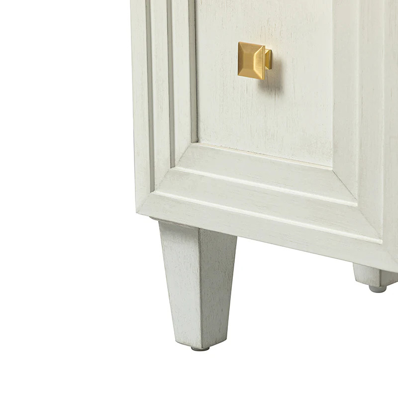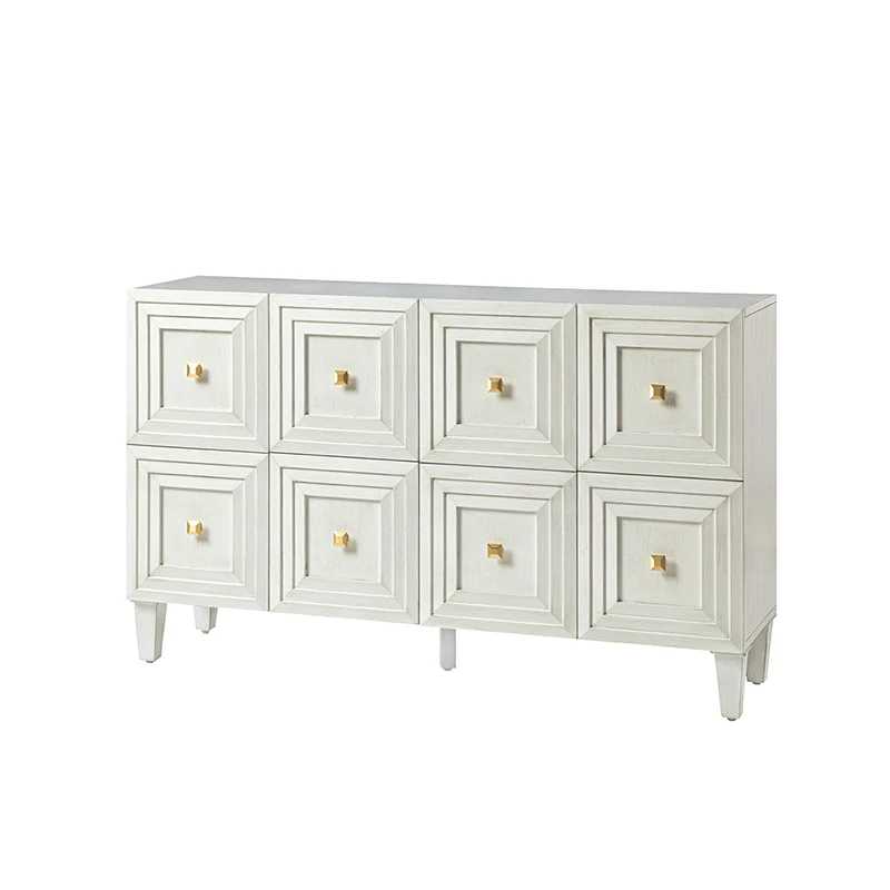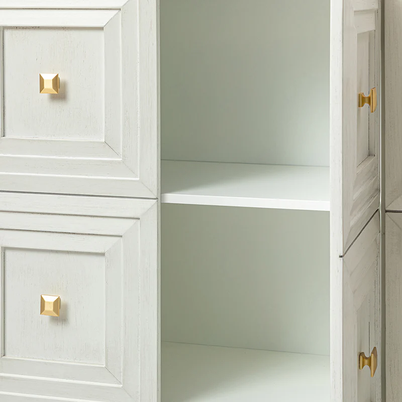 Refreshing your eyes with 4 block-patterned doors, this modern storage sideboard is designed to add a little vibe to the layout of your overall space. Sitting on tapered solid wood legs, this contemporary storage sideboard featuring square patterns adds visual glamour to this understated design. Silver gray hand crafted finish goes well with brass powder coated handles. The interior adjustable shelves offer out-of-sight storage which is perfect for storing dishes, linens, and more. Fitting for various home styles, this credenza sideboard buffet is apt to keep your dining room as well as living room organized and clutter-free. Don't miss out on the chance to add the exquisite sideboard to your home today.