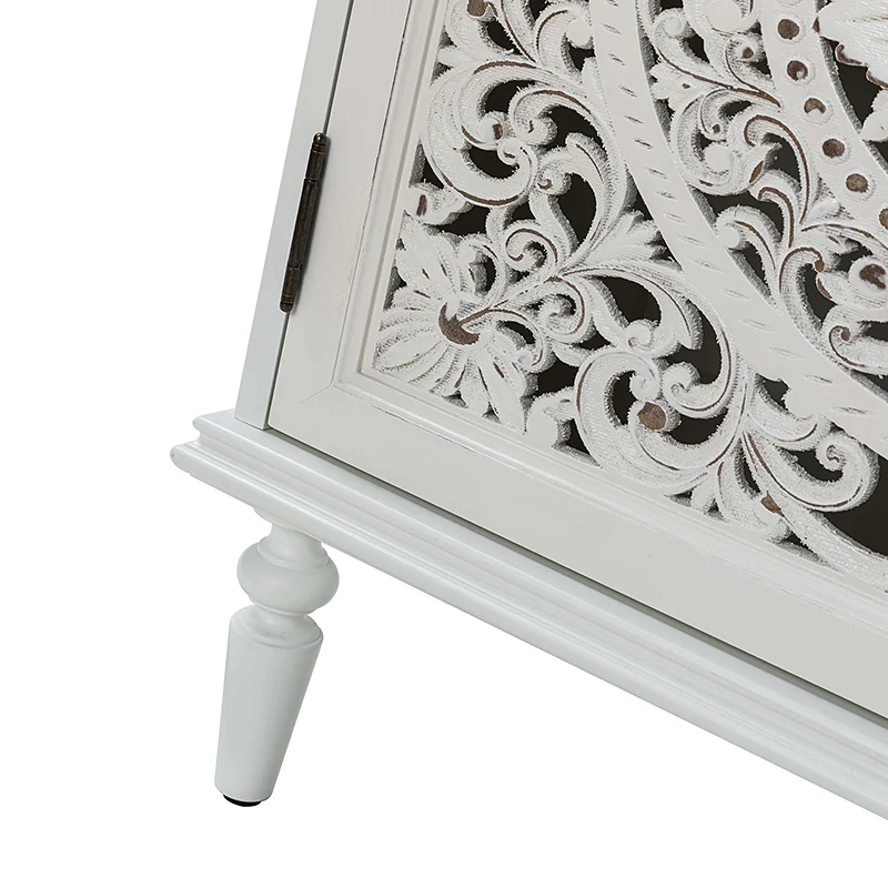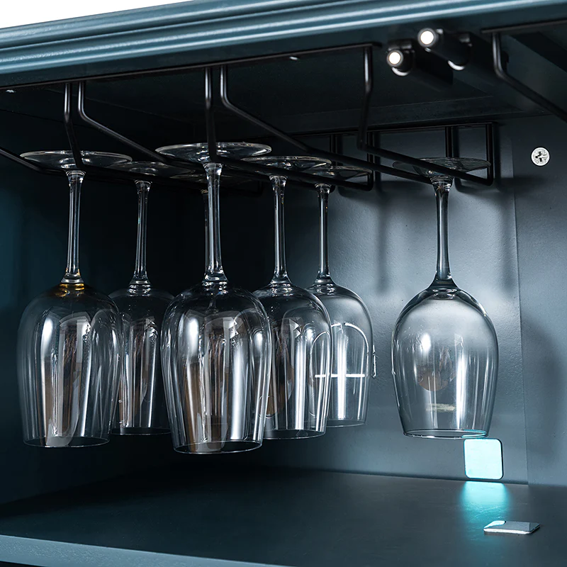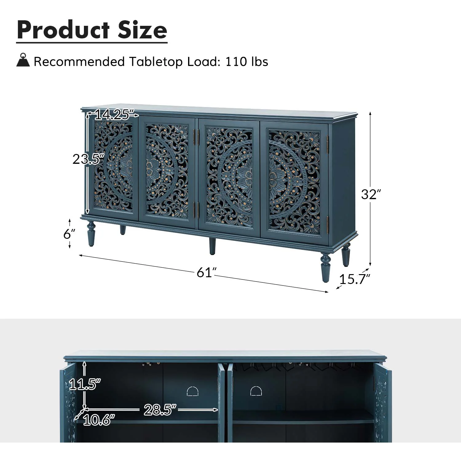 This elegant storage buffet/sideboard is a perfect combination of functionality and style. Crafted from solid hardwood, it features a stunning hollow floral-carved traditional design. There is built-in lighting in this sideboard and buffet, with its recharging LED infrared induction lamp. It helps you find things quicker. With ample storage space, including adjustable shelves and a wine rack capable of holding nine wine glasses, this sideboard effortlessly blends tropical, boho, farmhouse, glam, rustic, lodge, coastal, and French country aesthetics. We offer a range of functional furniture options like sideboards, credenzas, buffet sideboards, hall chests, and cabinets TV stand to use up to TV size 65 inches.