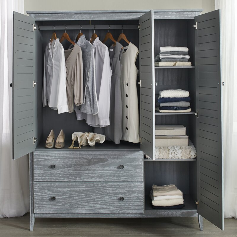 Attractive metal knobs, a rich finish, and elegant Shaker style: this Costal-looking Greenport 3 Door Armoire has what it takes to give your bedroom that refined touch. Its modernized traditional style creates a timeless décor while adding lots of storage with three large Louvered doors and two spacious 8.25” deep drawers. This customizable wardrobe features a sturdy construction that can last for years. Featuring an eco-friendly design, this piece has minimal impact on the environment as all wood comes from renewable forests.