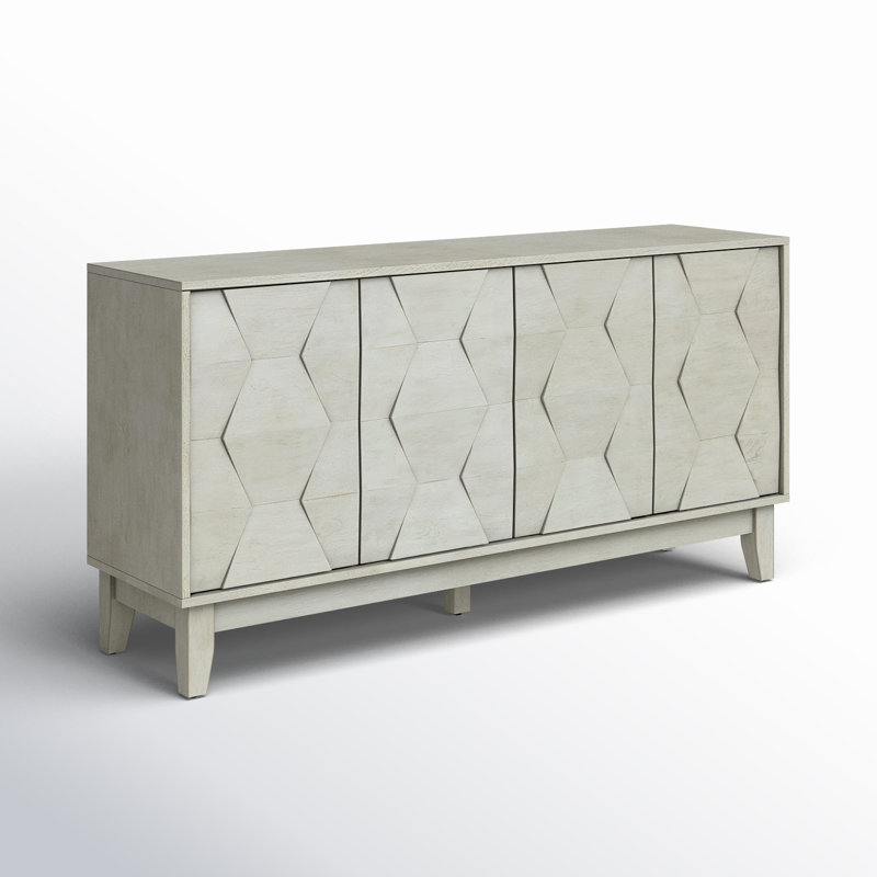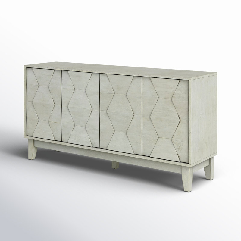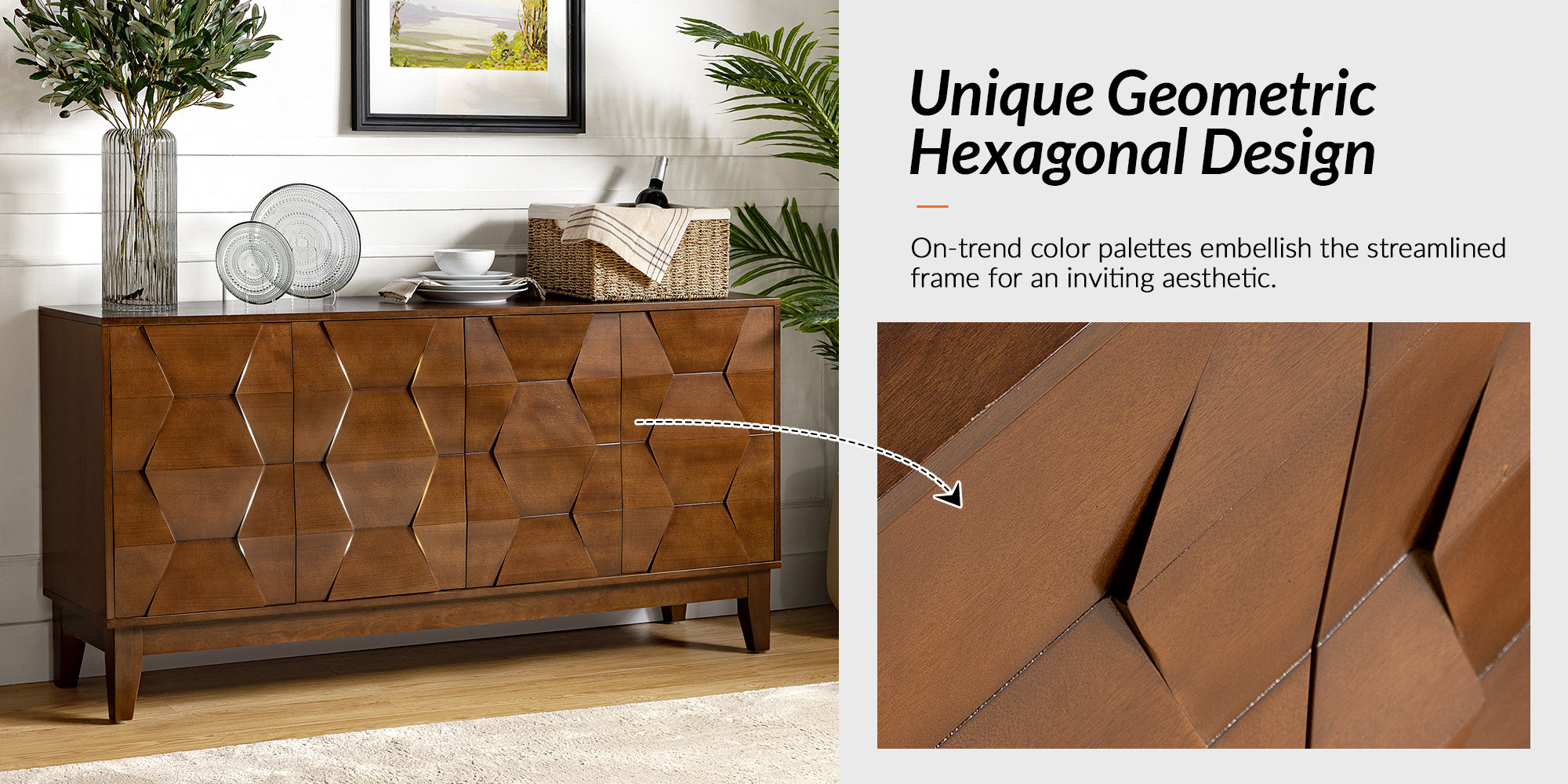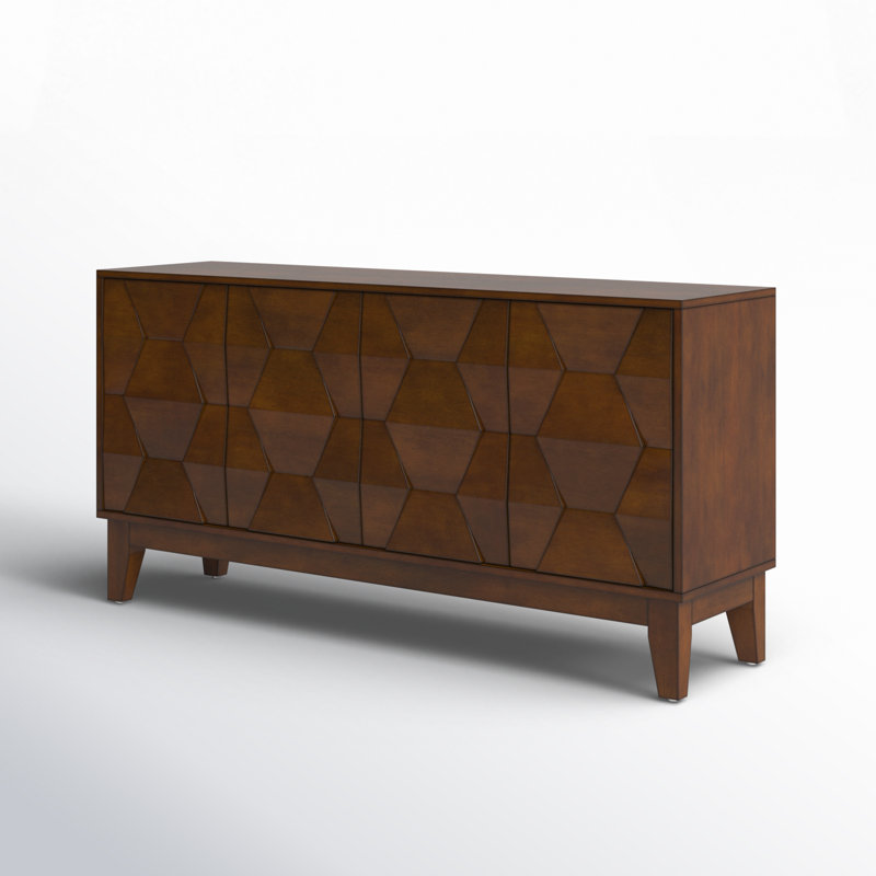 This sideboard makes a style statement with its textured design and mid-century vibe. The spacious 60" wide frame is made from solid and engineered wood, and it rests on four tapered legs that keep sightlines clear. The door fronts feature captivating hexagonal embellishments, adding subtle visual texture and dimension to the overall design. And there's plenty of room inside for all your daily essentials. Use the surface as a coffee or dessert station during holiday parties and get-togethers. Hand-curated by Kelly Clarkson.