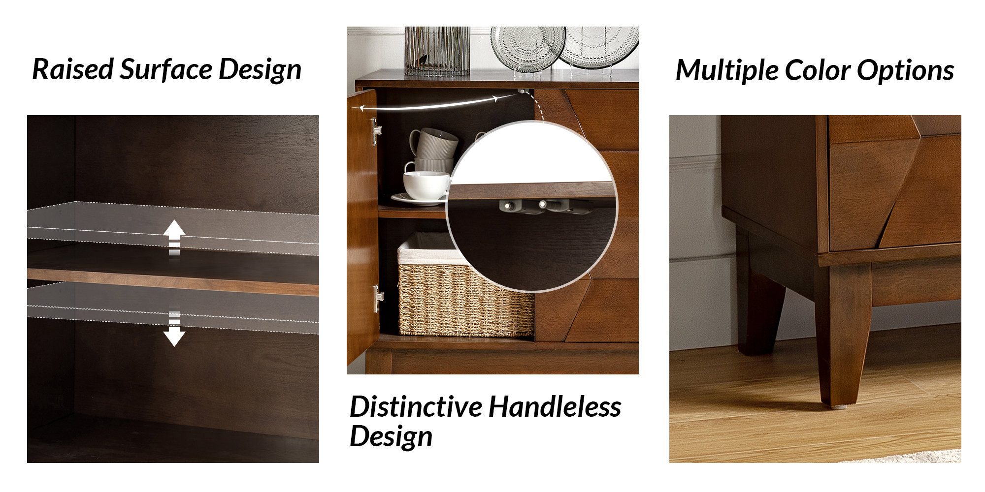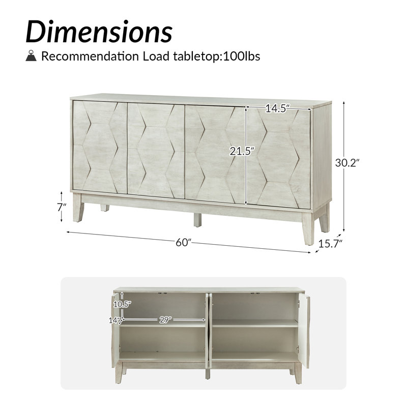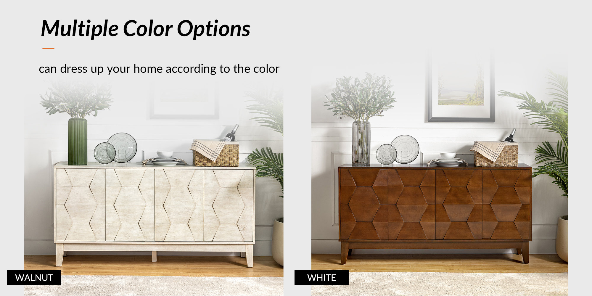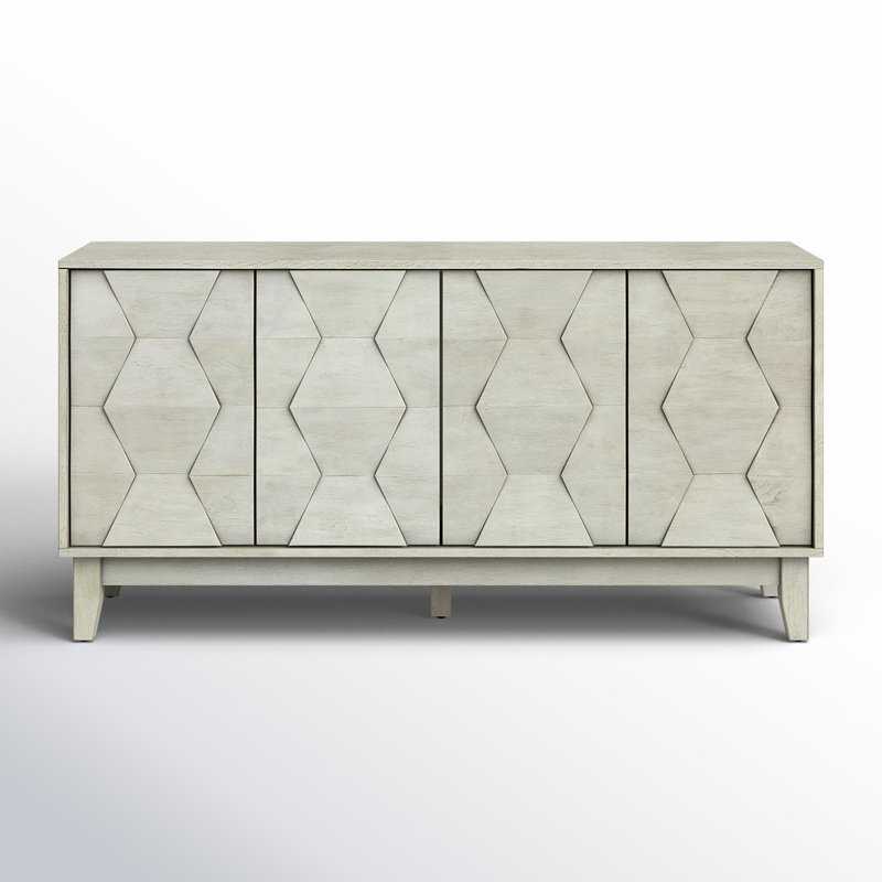 This sideboard makes a style statement with its textured design and mid-century vibe. The spacious 60" wide frame is made from solid and engineered wood, and it rests on four tapered legs that keep sightlines clear. The door fronts feature captivating hexagonal embellishments, adding subtle visual texture and dimension to the overall design. And there's plenty of room inside for all your daily essentials. Use the surface as a coffee or dessert station during holiday parties and get-togethers. Hand-curated by Kelly Clarkson.