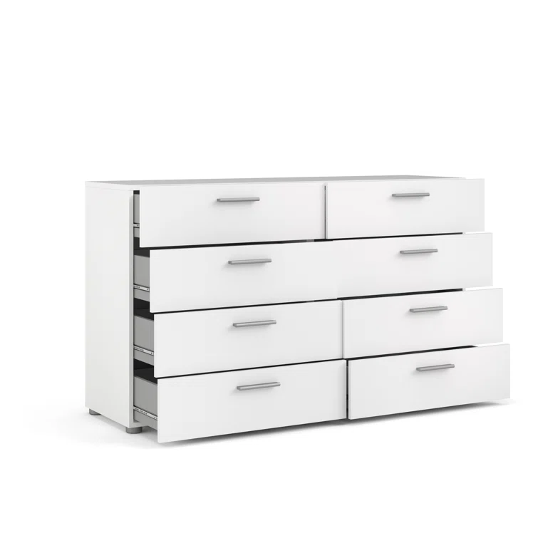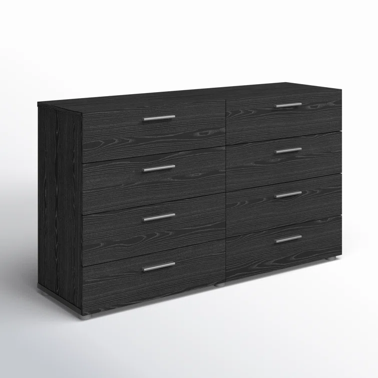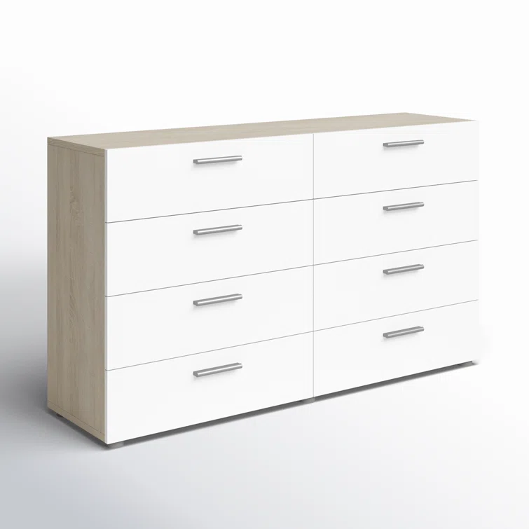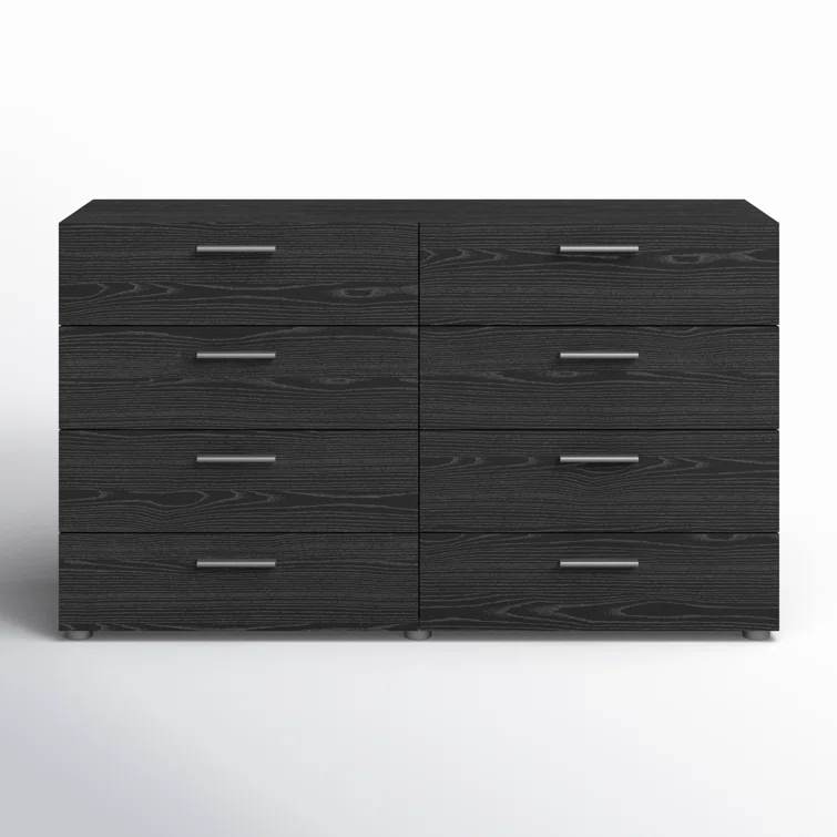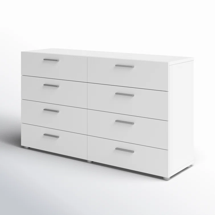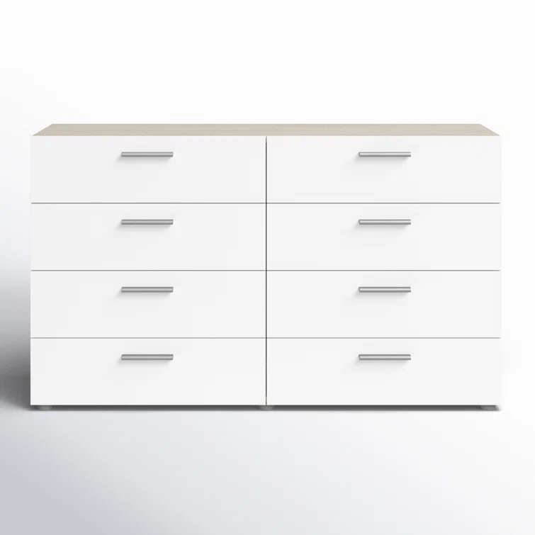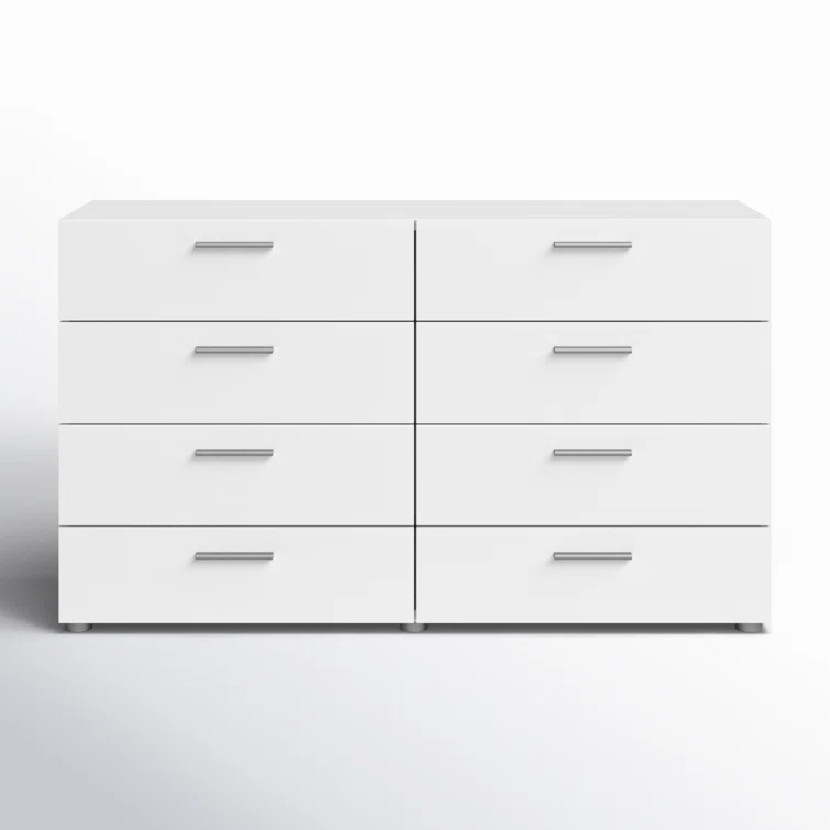 This streamlined double dresser offers essential storage space in your main bedroom or guest room. It features eight drawers with sleek angular bar pulls that open on roller glides, revealing plenty of room for your clothes, extra bedding, and delicates. The 55" wide surface has a spacious design that's just right for a table lamp or a vase of fresh flowers. This dresser is crafted from engineered wood in your choice of neutral hue that complements your modern decor. Plus, it includes wall-mounting hardware for added safety.