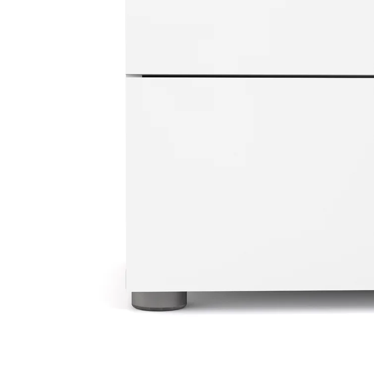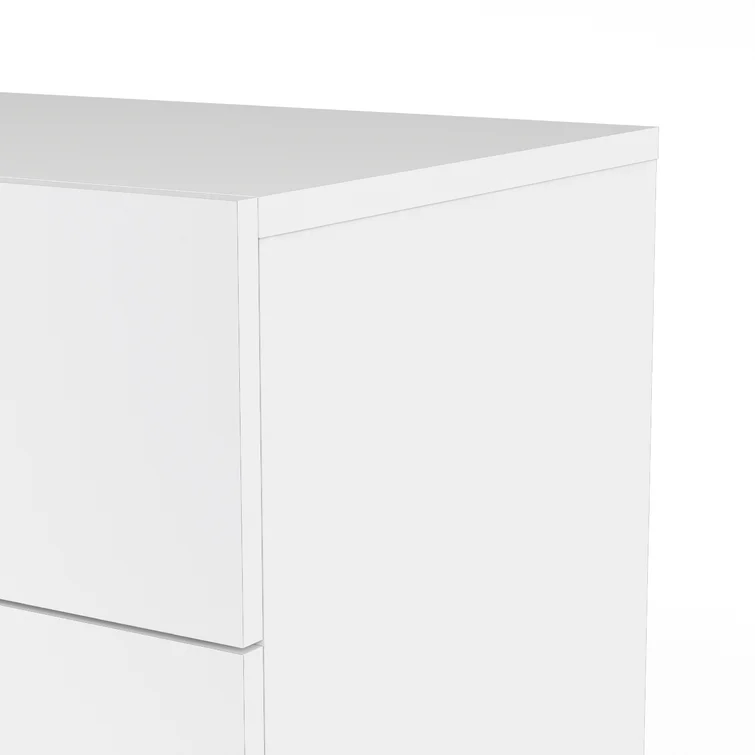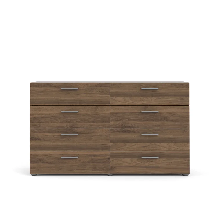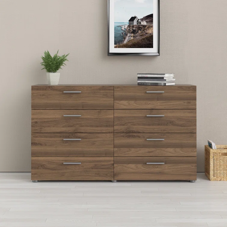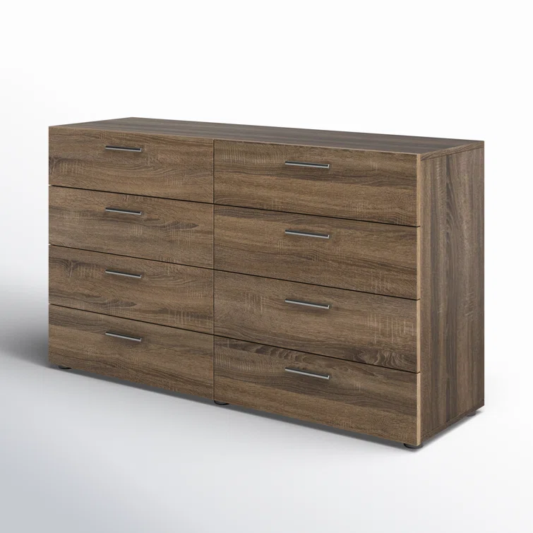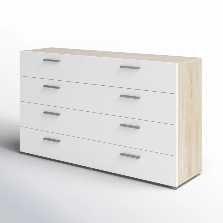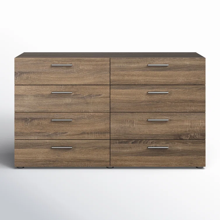 This streamlined double dresser offers essential storage space in your main bedroom or guest room. It features eight drawers with sleek angular bar pulls that open on roller glides, revealing plenty of room for your clothes, extra bedding, and delicates. The 55" wide surface has a spacious design that's just right for a table lamp or a vase of fresh flowers. This dresser is crafted from engineered wood in your choice of neutral hue that complements your modern decor. Plus, it includes wall-mounting hardware for added safety.