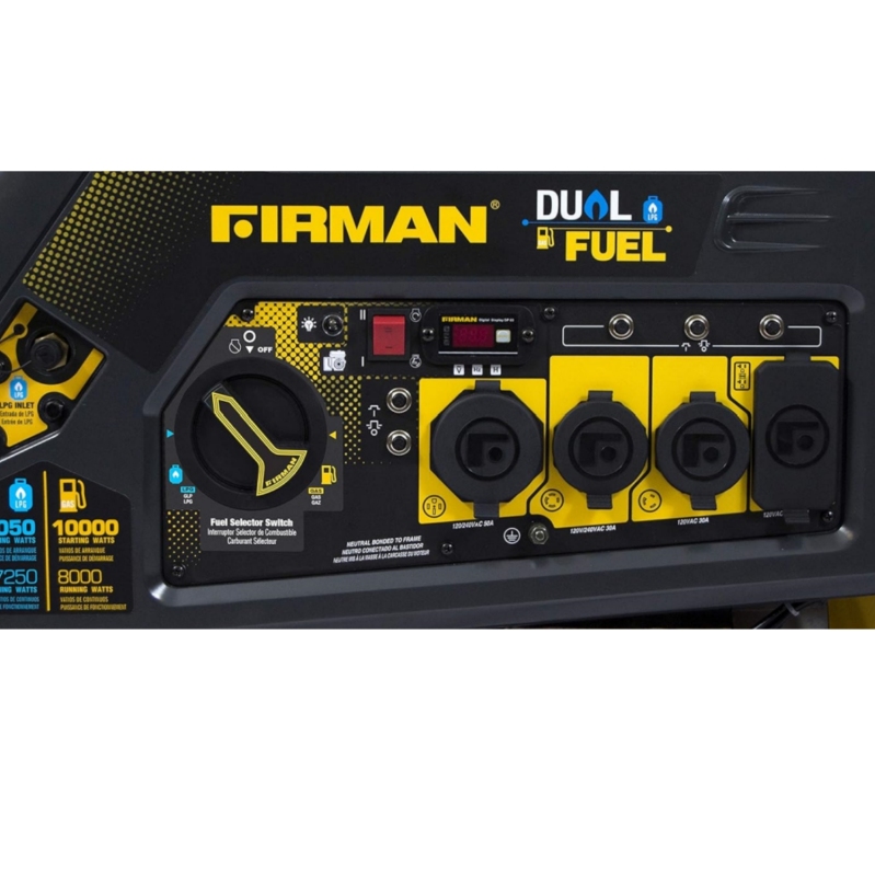 Providing the best electrical solutions, FIRMAN brings an innovative yet portable generator that gives you power on demand. Packed with numerous features like Volt-Lock automatic voltage regulator, an integrated gasoline fuel gauge, a multi-featured control panel, 3-in-1 Data-Minder, our generator is ideal for everyone. With an 8-gallon tank, the portable generator can run up to 12 hours at an AC voltage of 120/240V. Never face power outage issues anymore with this dual-fuel generator.