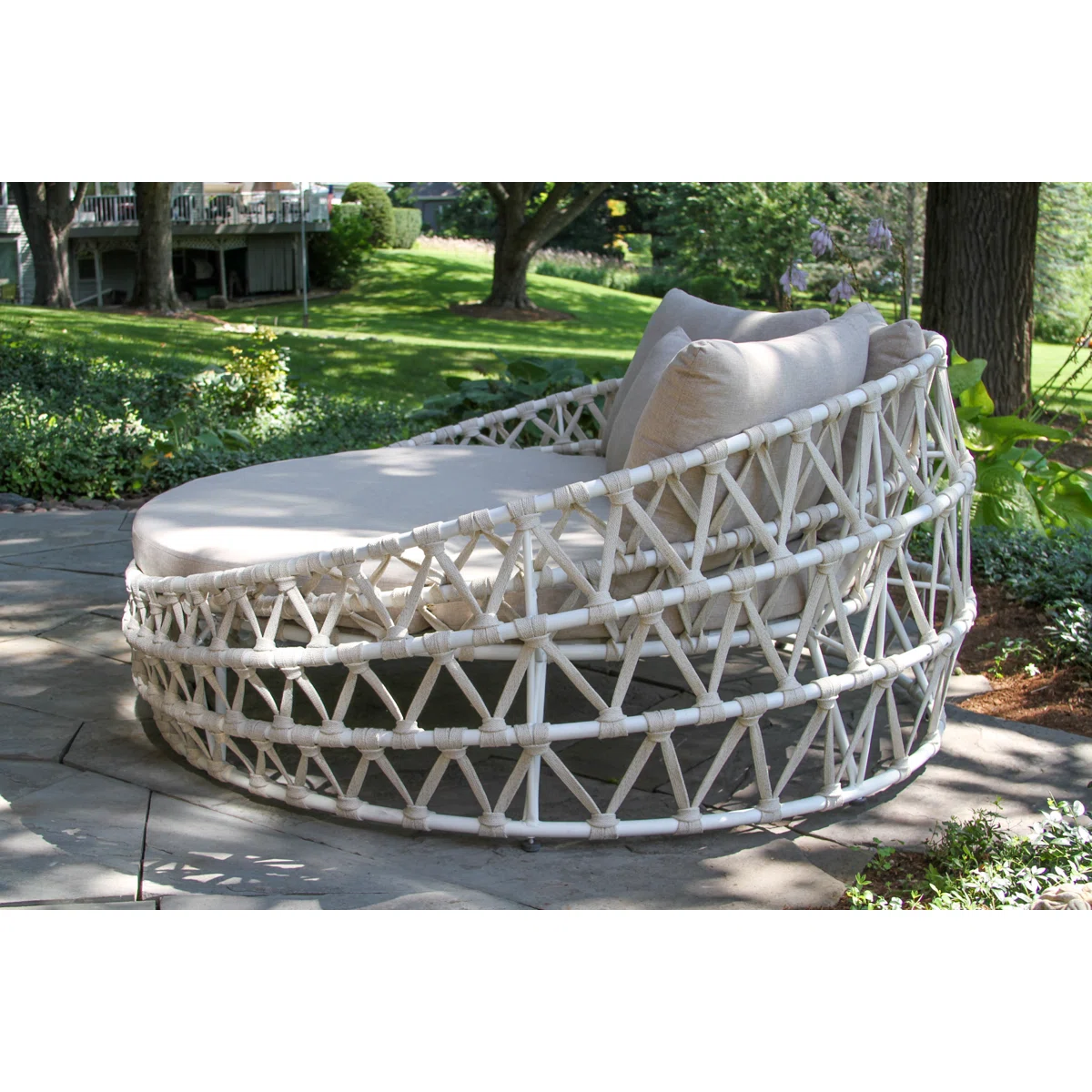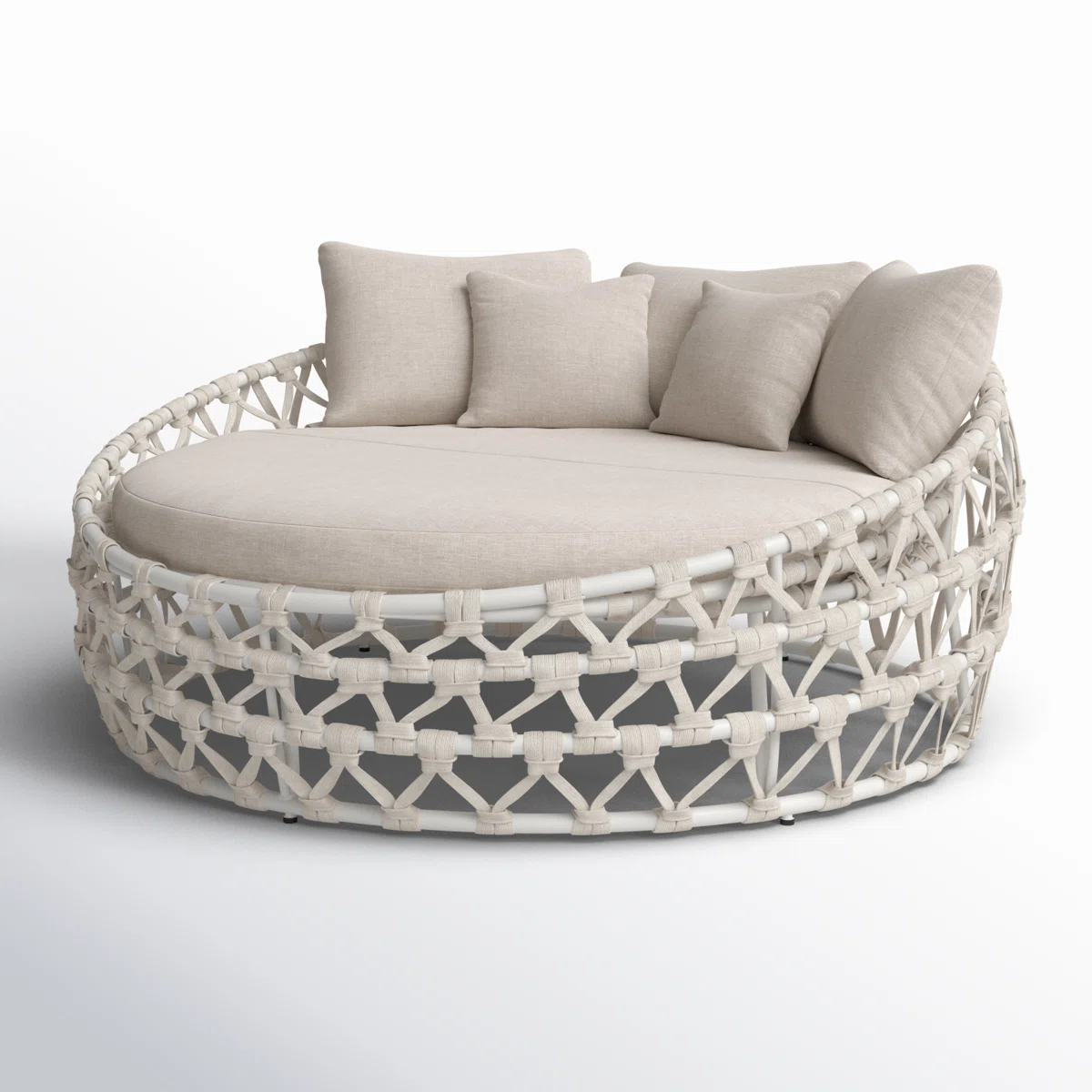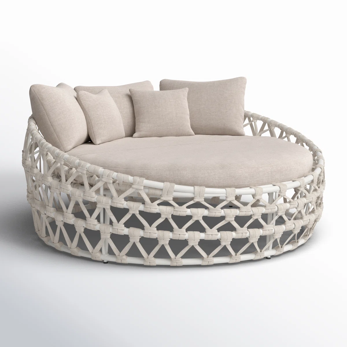 Elevate your outdoor sanctuary with this breezy patio daybed, a harmonious blend of coastal style and plush seating. Crafted with a powder-coated aluminum frame that effortlessly defies the elements, this daybed is finished with nautical-grade white rope detailing for a touch of texture next to the pool or on your porch. The round bed base offers seating for two, making it an ideal spot for lounging in the sun or enjoying a good book. Plus, it comes with off-white, fade- and weather-resistant cushion, complete with removable covers for easy cleaning. To keep this bed looking good, we recommend storing it away when it's not in use.