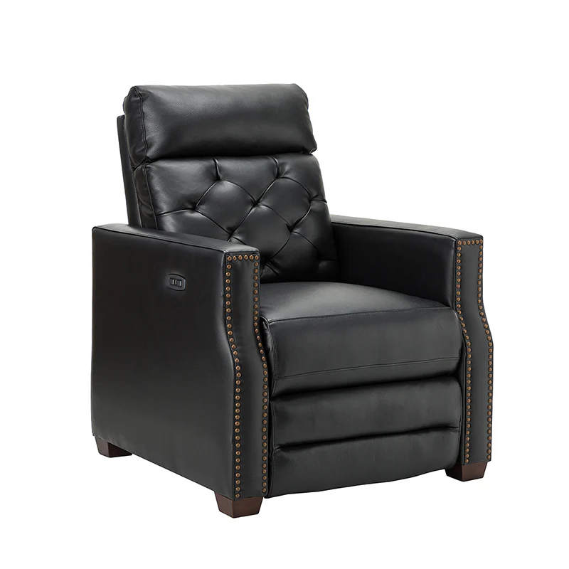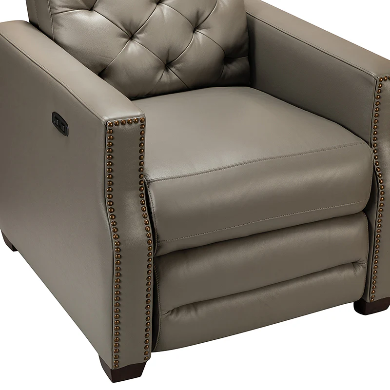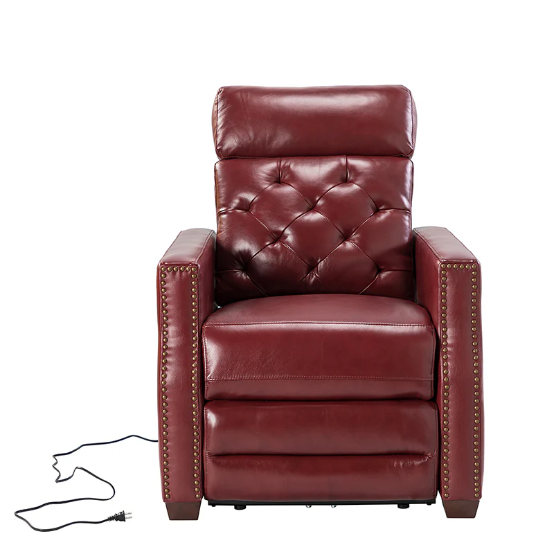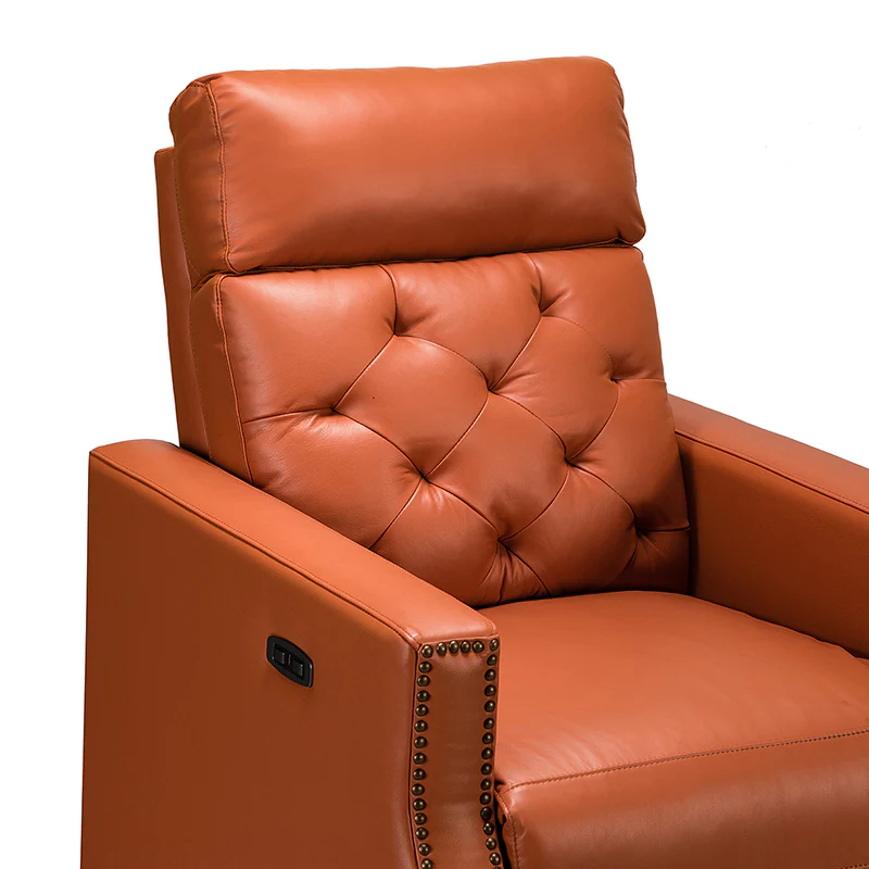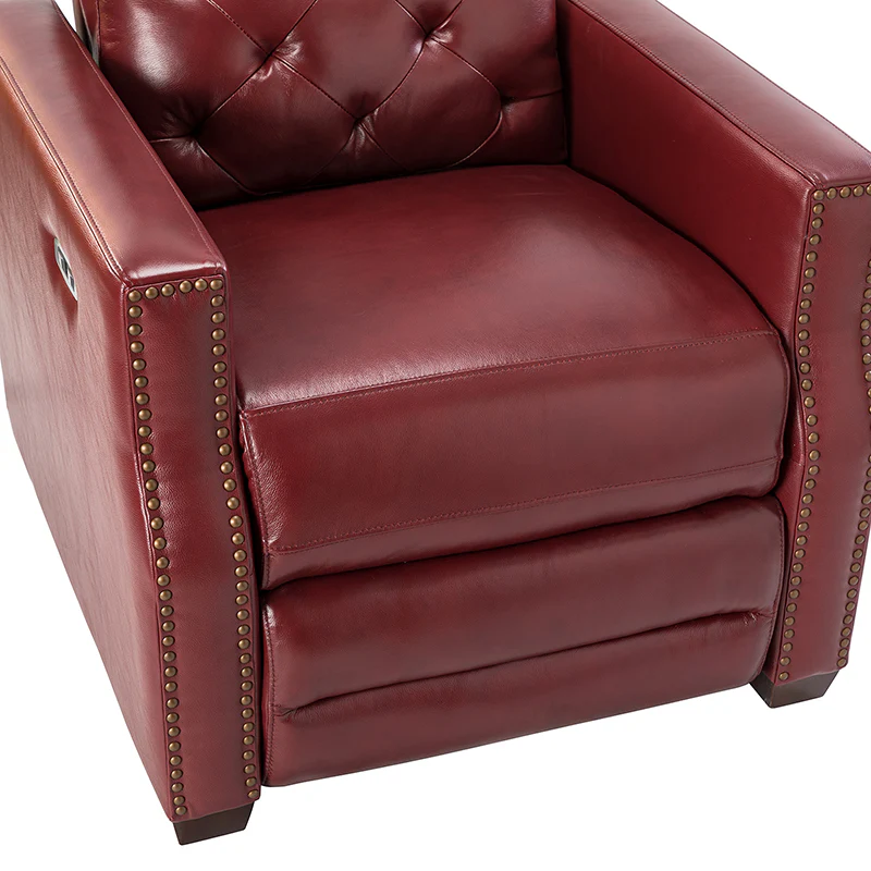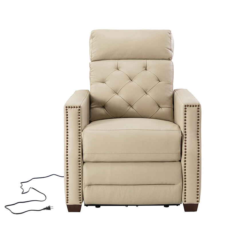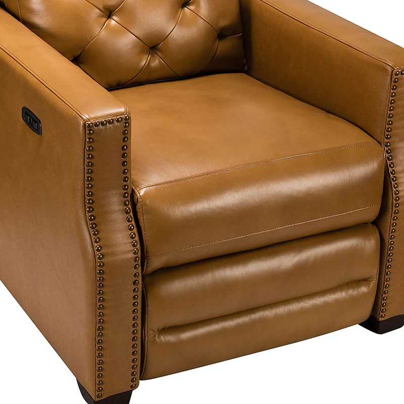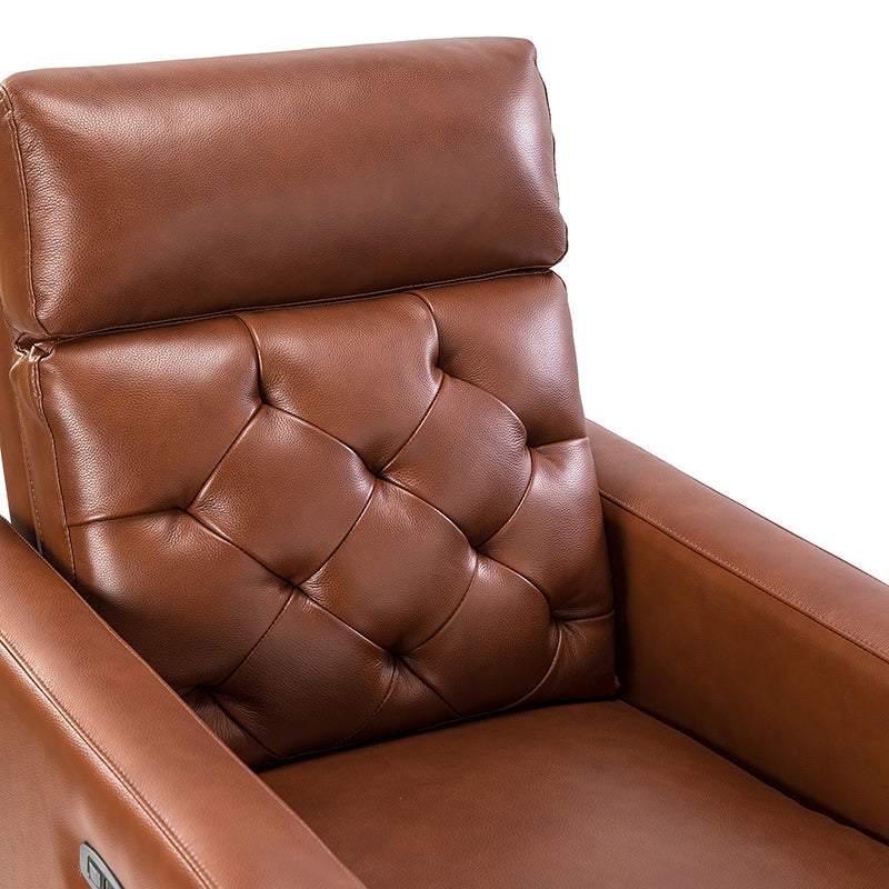 Whether catching your favorite shows after a long day or kicking back with the latest bestseller on your day off, this power cigar recliner offers the perfect perching point in your home. Its unique tufted backrest, foam, and polyester fiber-filled frame exude ease and comfort when both upright and in the reclining position, while the built-in sinuous spring increases stability. Crafted from solid and manufactured wood and upholstered with luxurious breathable genuine top layer leather, this comfy power recliner shows a modern appearance for simple yet fashionable charm in any living room while the arms are highlighted by delicate nailhead trim that adds many distinct characters. Including a 2.1-meter-long wire to connect the electricity, it provides an adjustable reclining angle of a maximum of 150 degrees and paired USB port, you can fix it at any angle within the range and enjoy its convenient charging function. Cooperating with the hidden footrest to relax your joints after a long day of work, it¡®s the best place to rock away from the day's pressure after work.