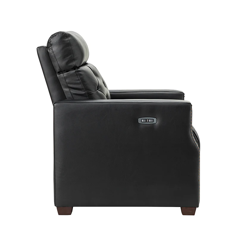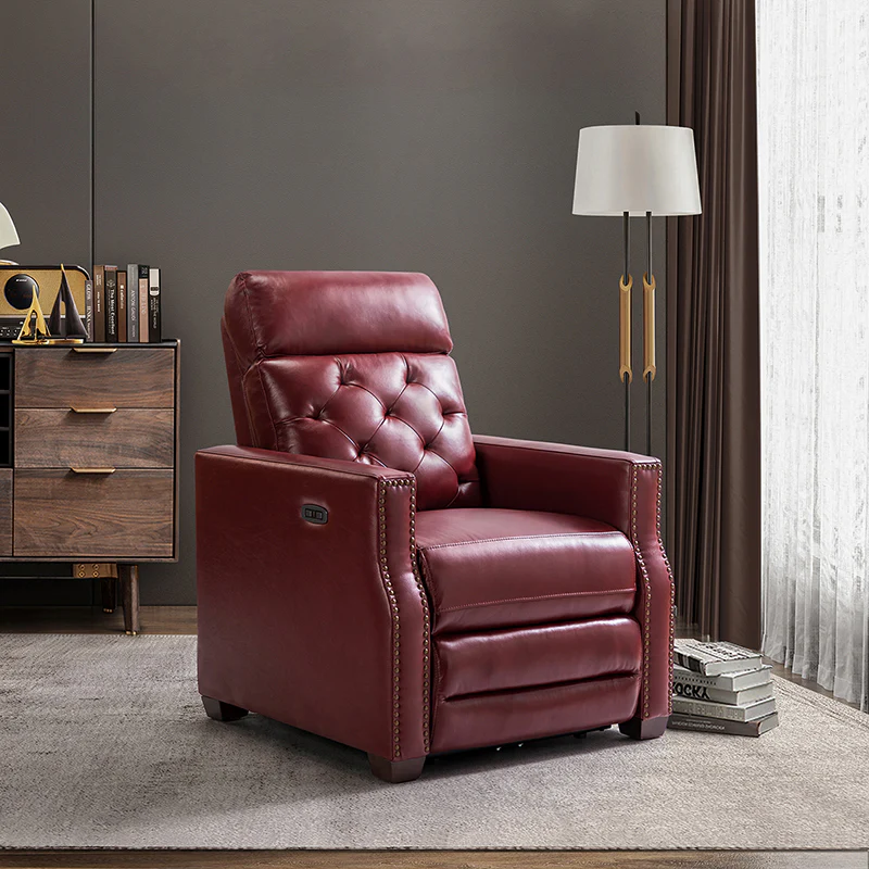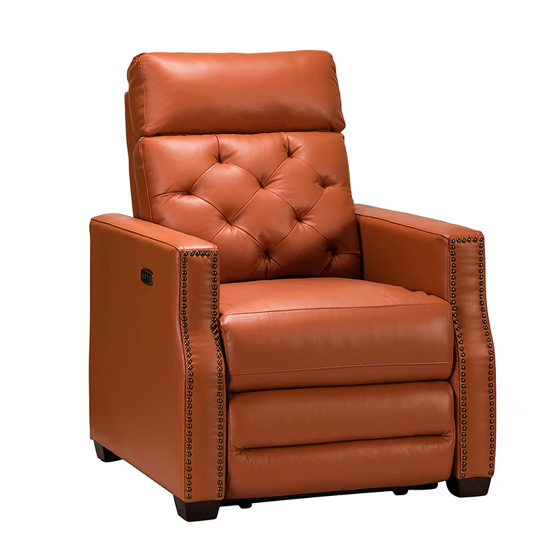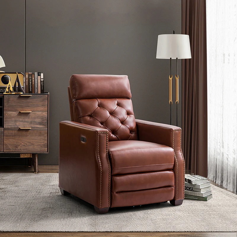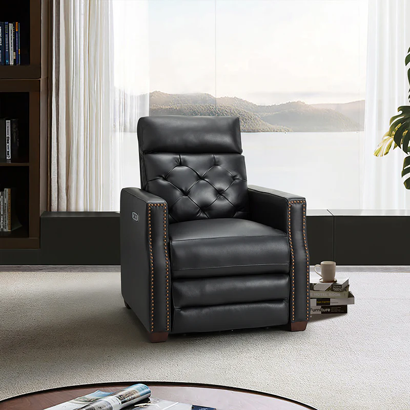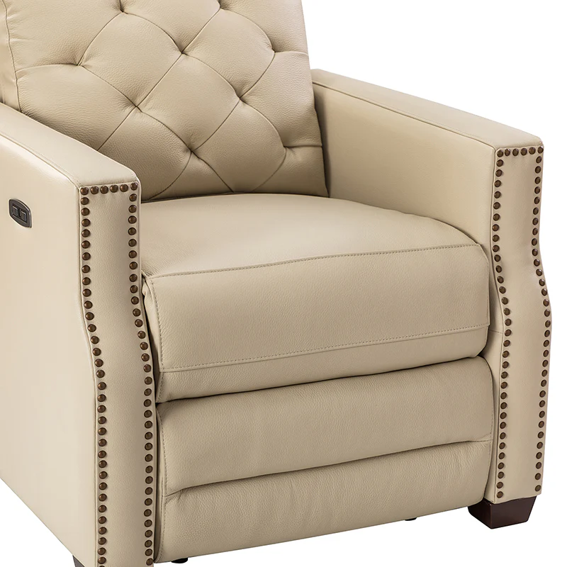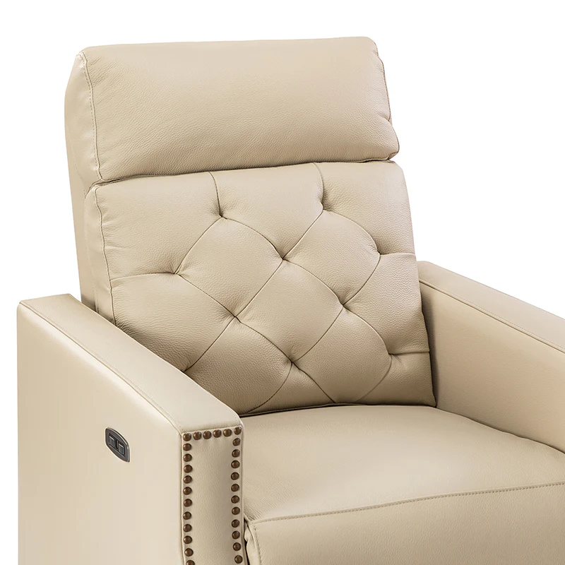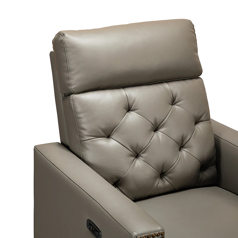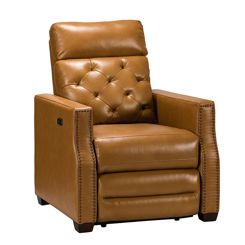 Whether catching your favorite shows after a long day or kicking back with the latest bestseller on your day off, this power cigar recliner offers the perfect perching point in your home. Its unique tufted backrest, foam, and polyester fiber-filled frame exude ease and comfort when both upright and in the reclining position, while the built-in sinuous spring increases stability. Crafted from solid and manufactured wood and upholstered with luxurious breathable genuine top layer leather, this comfy power recliner shows a modern appearance for simple yet fashionable charm in any living room while the arms are highlighted by delicate nailhead trim that adds many distinct characters. Including a 2.1-meter-long wire to connect the electricity, it provides an adjustable reclining angle of a maximum of 150 degrees and paired USB port, you can fix it at any angle within the range and enjoy its convenient charging function. Cooperating with the hidden footrest to relax your joints after a long day of work, it¡®s the best place to rock away from the day's pressure after work.