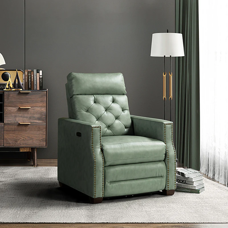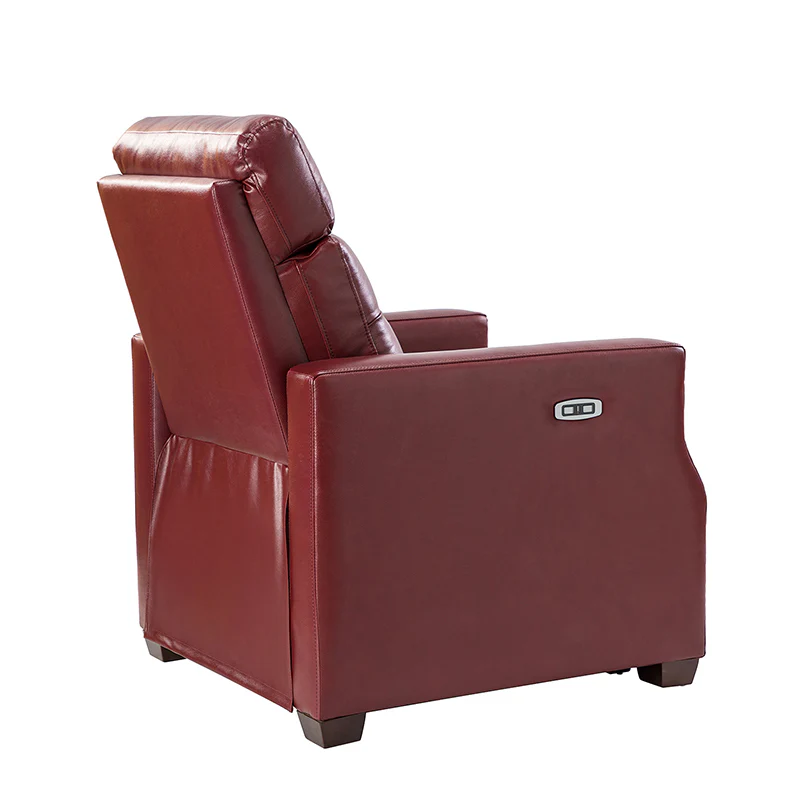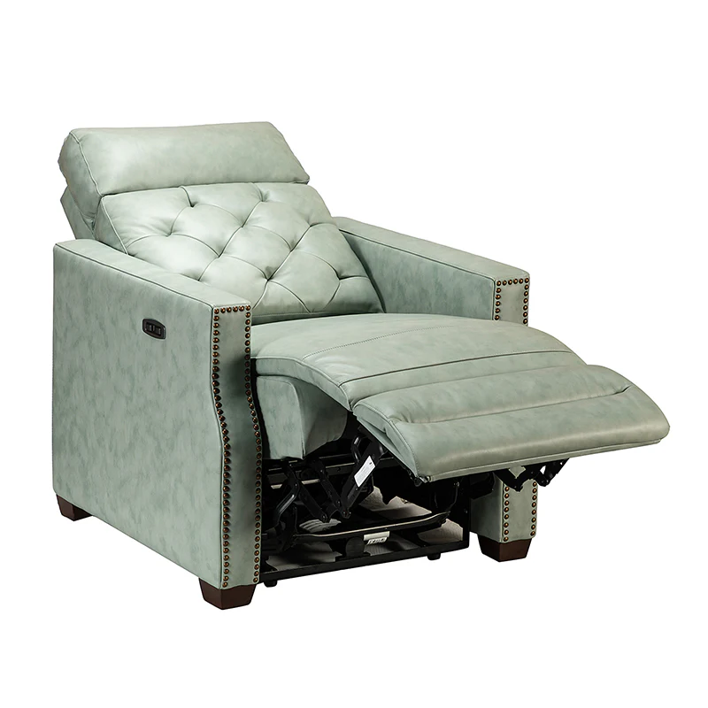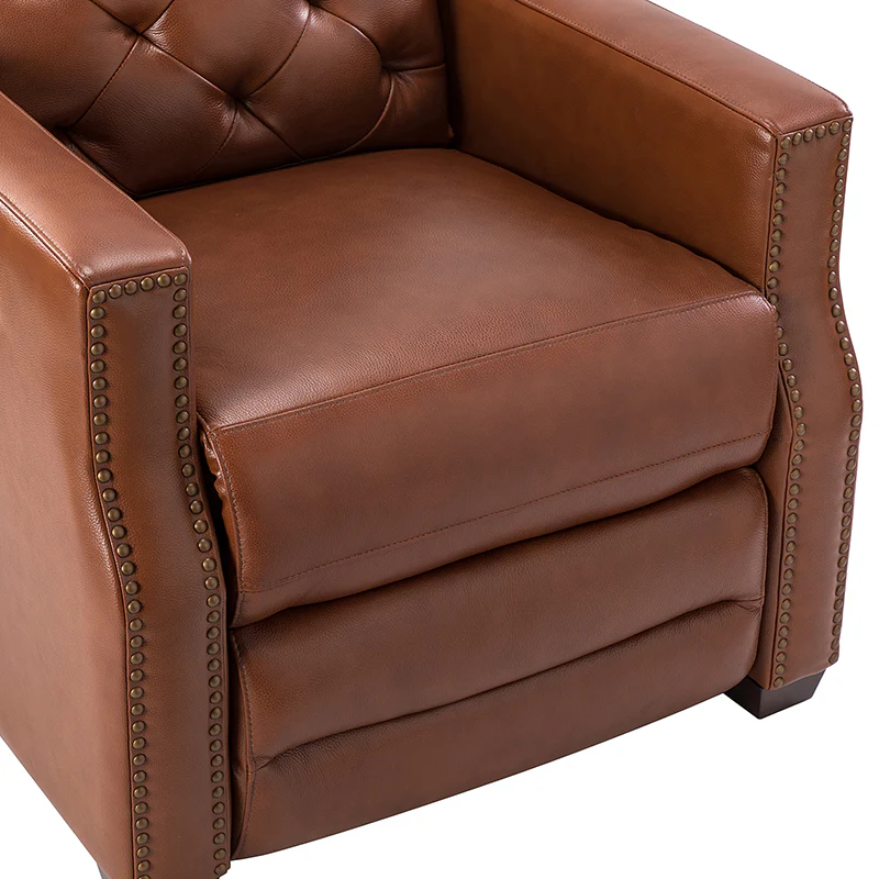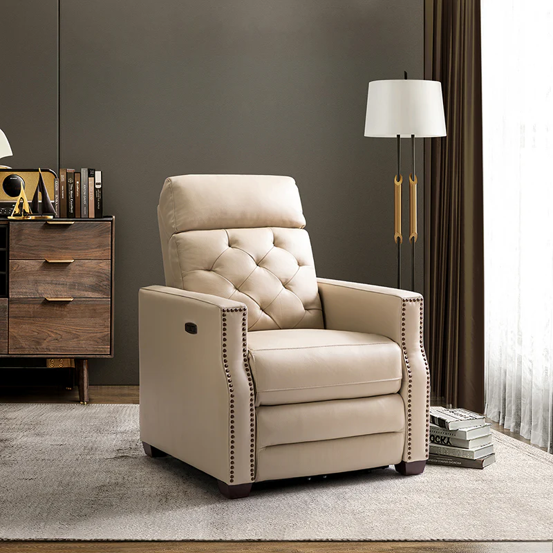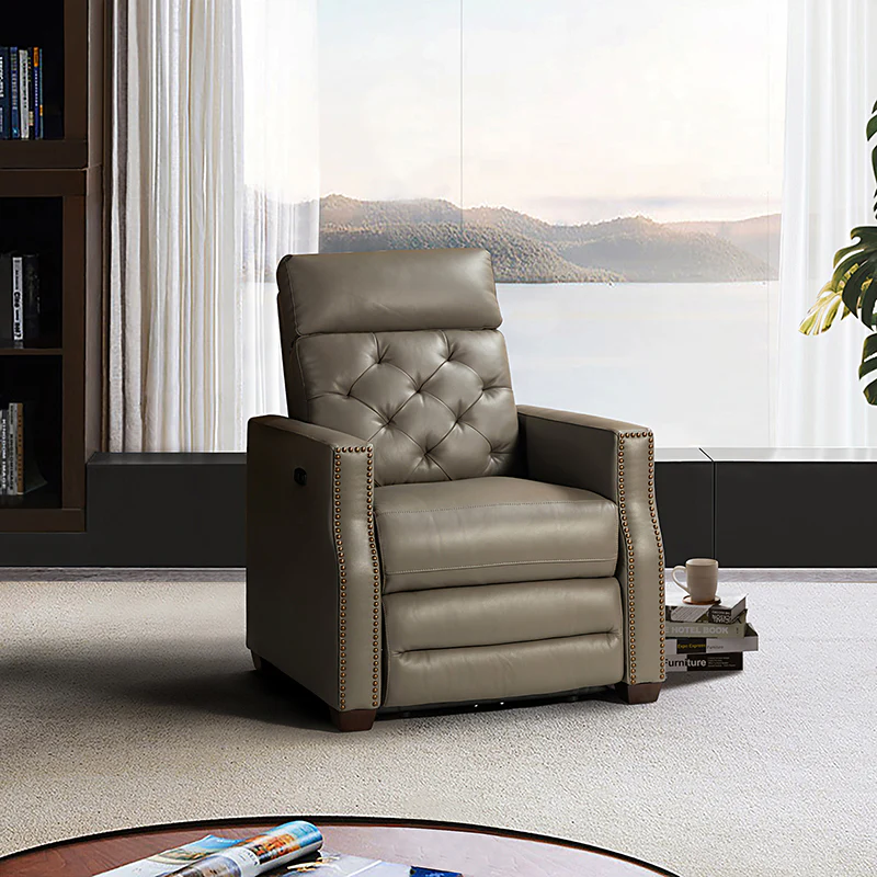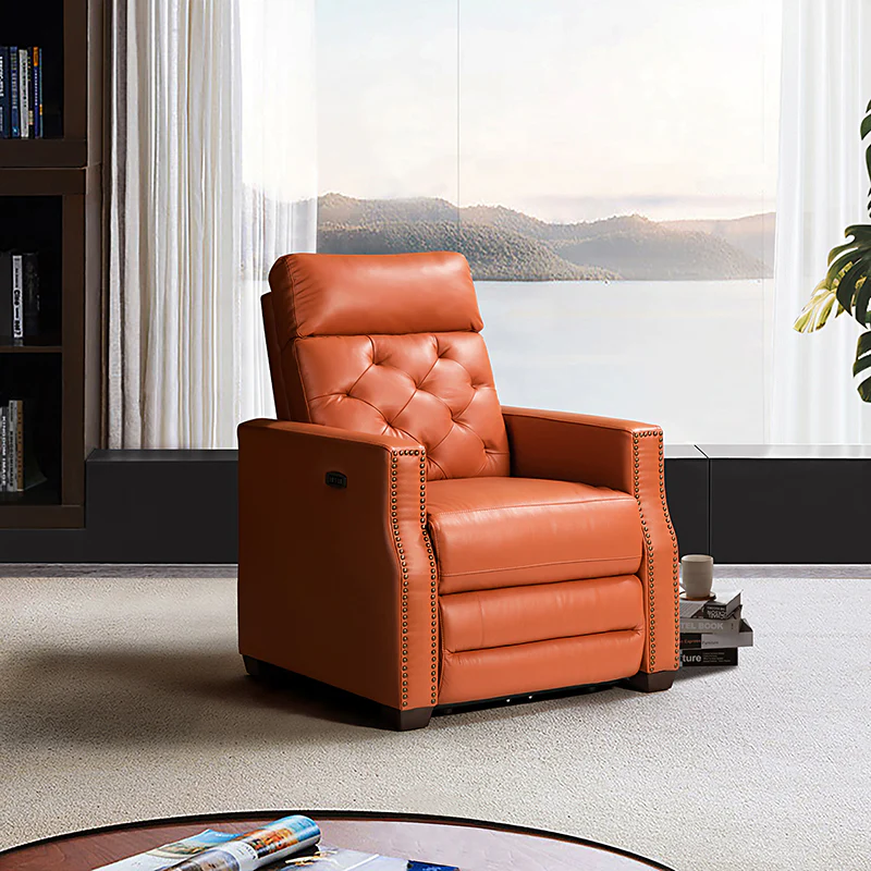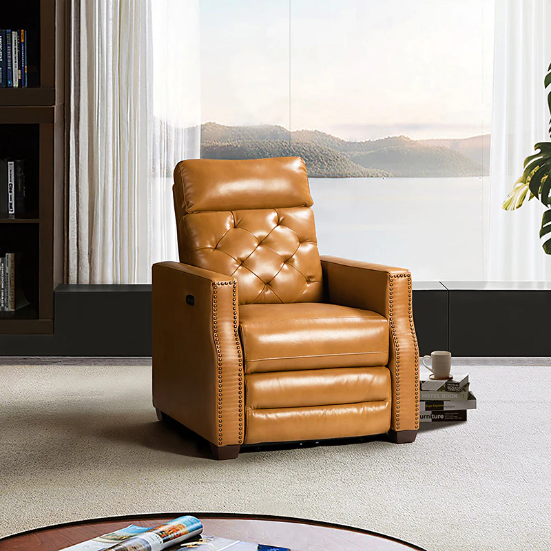 Whether catching your favorite shows after a long day or kicking back with the latest bestseller on your day off, this power cigar recliner offers the perfect perching point in your home. Its unique tufted backrest, foam, and polyester fiber-filled frame exude ease and comfort when both upright and in the reclining position, while the built-in sinuous spring increases stability. Crafted from solid and manufactured wood and upholstered with luxurious breathable genuine top layer leather, this comfy power recliner shows a modern appearance for simple yet fashionable charm in any living room while the arms are highlighted by delicate nailhead trim that adds many distinct characters. Including a 2.1-meter-long wire to connect the electricity, it provides an adjustable reclining angle of a maximum of 150 degrees and paired USB port, you can fix it at any angle within the range and enjoy its convenient charging function. Cooperating with the hidden footrest to relax your joints after a long day of work, it¡®s the best place to rock away from the day's pressure after work.