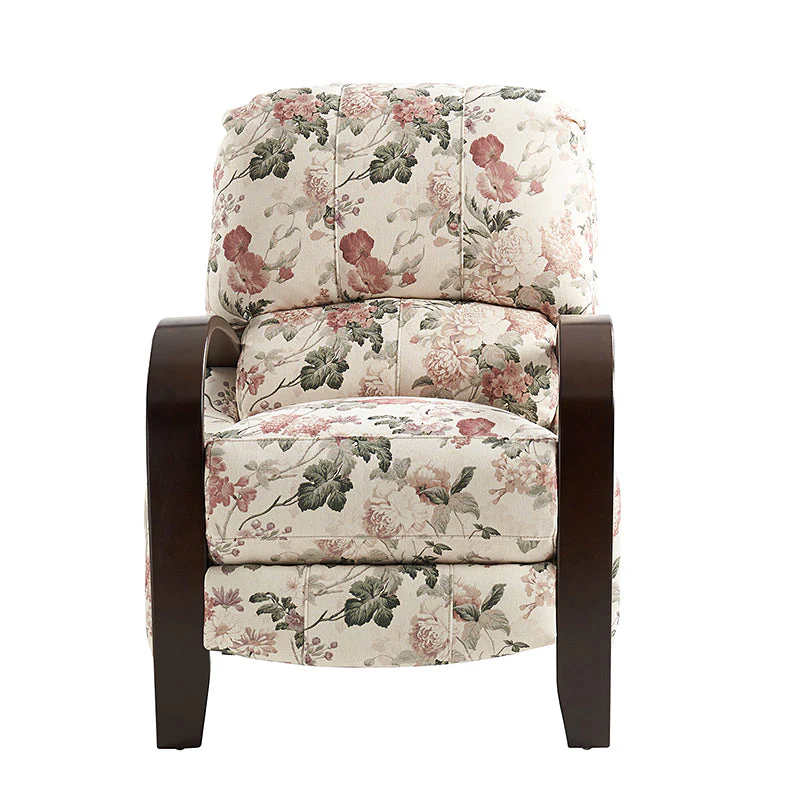 Whether you're looking to complete your living room ensemble or add a touch of luxury to your master suite, this manual cigar recliner serves as the ideal retreat. Its plush cushioned back, foam, and polyester fiber-filled frame promise relaxation whether you're sitting upright or reclining, while the built-in sinuous spring enhances stability. Crafted from solid and manufactured wood, its floral fabric and elegantly curved arms exude a modern aesthetic, effortlessly blending into any decor scheme. Offering a reclining angle of 140 degrees, this recliner with wooden arms delivers both comfort and style in equal measure. Backed by quality and featuring understated colors, it's a suitable addition to any home decor style.