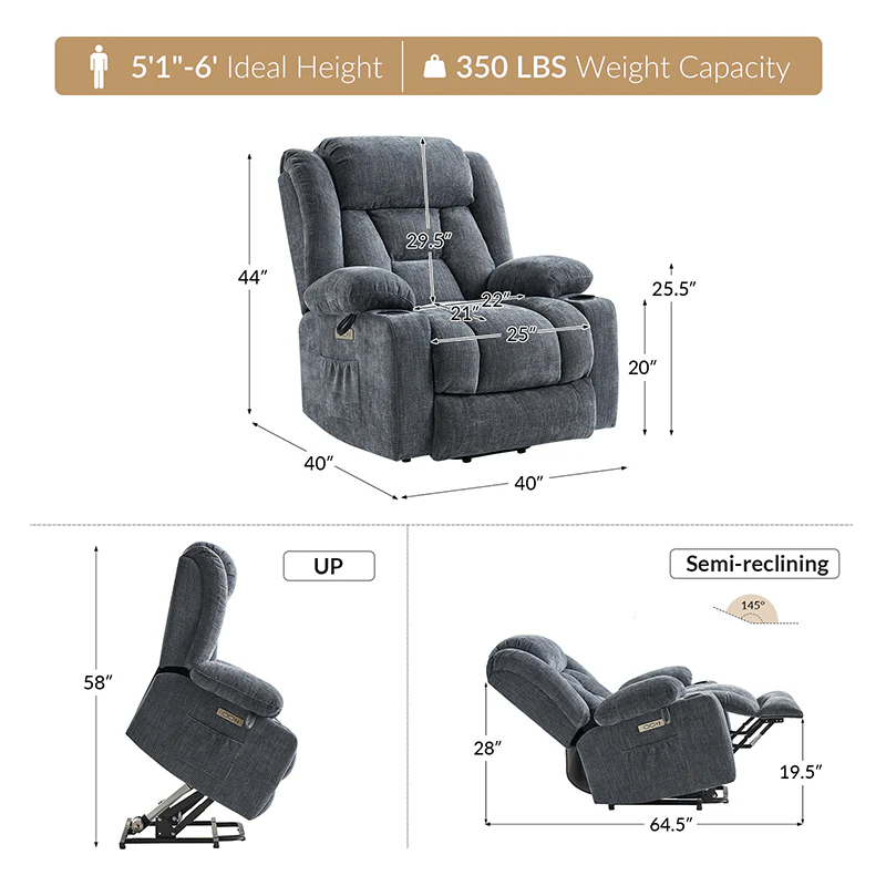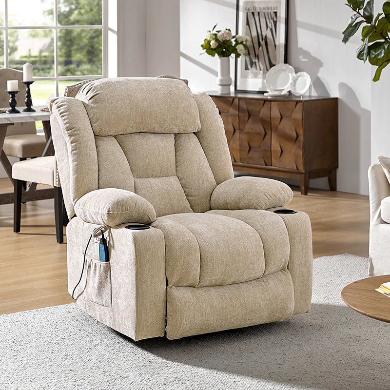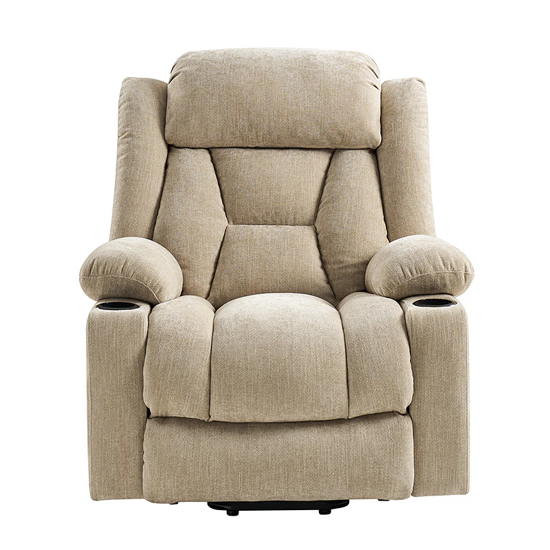 Experience unparalleled modern comfort with the Ethel LuxLift Max Recliner. Wrapped in plush flannel, it offers luxurious softness and ultimate relaxation. The chair features soft armrests for additional support, a convenient coaster to keep your beverages within reach, and built-in massage heating to soothe your body after a long day. Designed for practicality, it includes a side storage pocket for easy access to essentials. The oversized dimensions provide ample space for you to unwind in absolute comfort. Elevate your relaxation experience with the Ethel LuxLift Max Recliner, where style meets functionality.