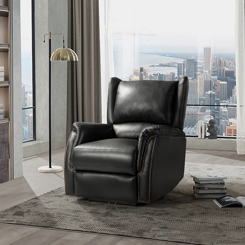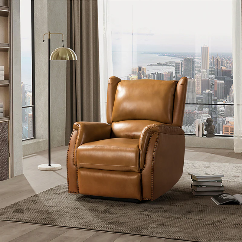 A versatile addition to complete your seating arrangement, this power recliner offers the perfect perching point in your home. Creative wingback design and retro yet chic nailhead trim lines add a hint of trendy aesthetic while the thick foam and soft polyester fiber upholstery bring a comfortable sitting feeling. This cigar recliner is luxurious genuine leather-wrapped and sturdy wood blended with a metal constructed, durable enough to be used for a long term. Providing a reclining angle of a maximum of 150 degrees and a convenient USB port, you can fix it at any angle within the range and enjoy its ultimate comfort. Controlled by the side button, this stunning accent reclines to create the perfect spot for reading, napping, or watching the game.