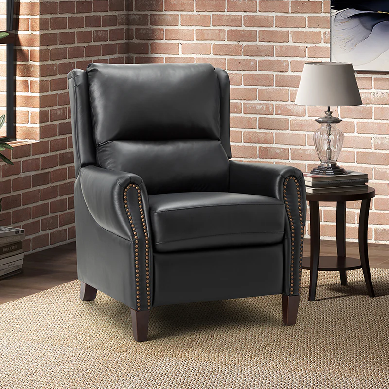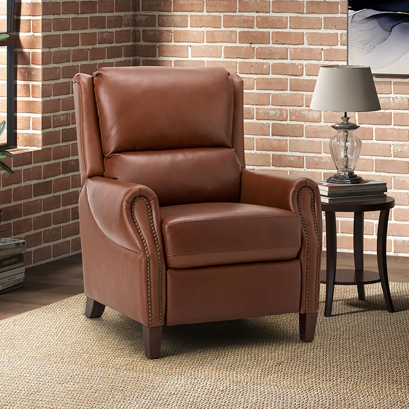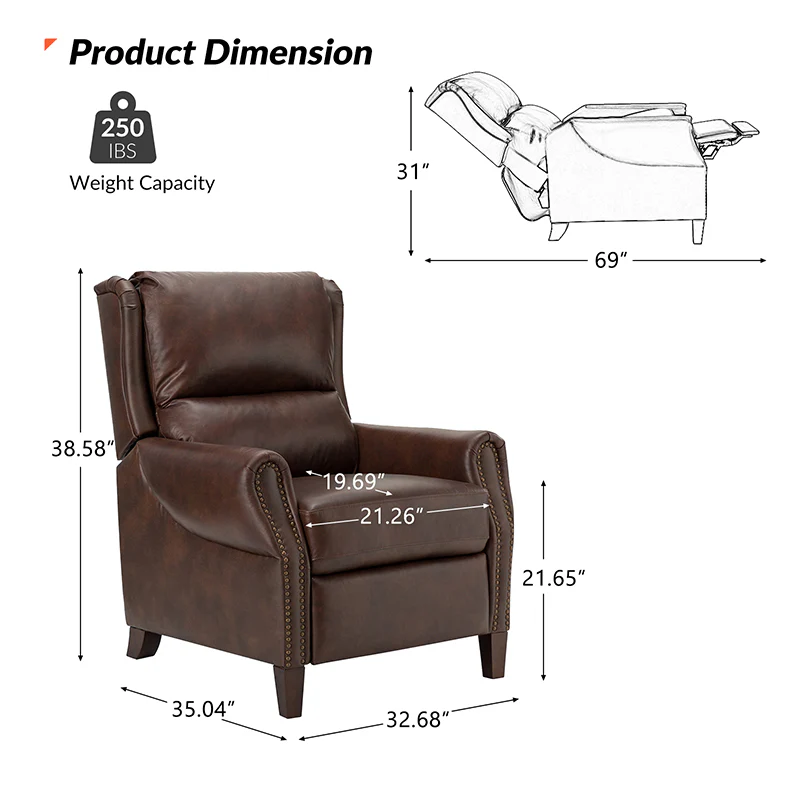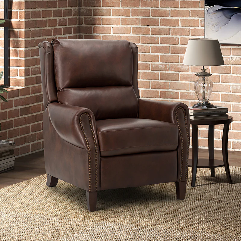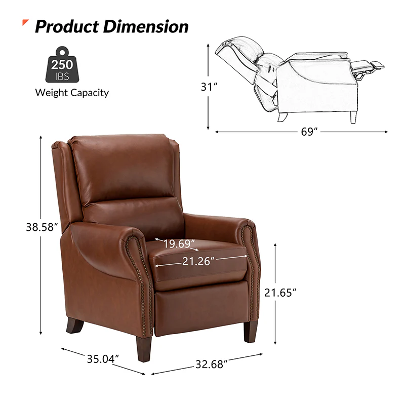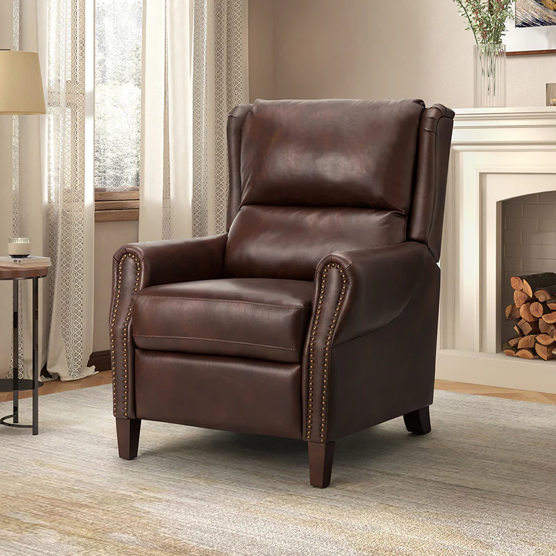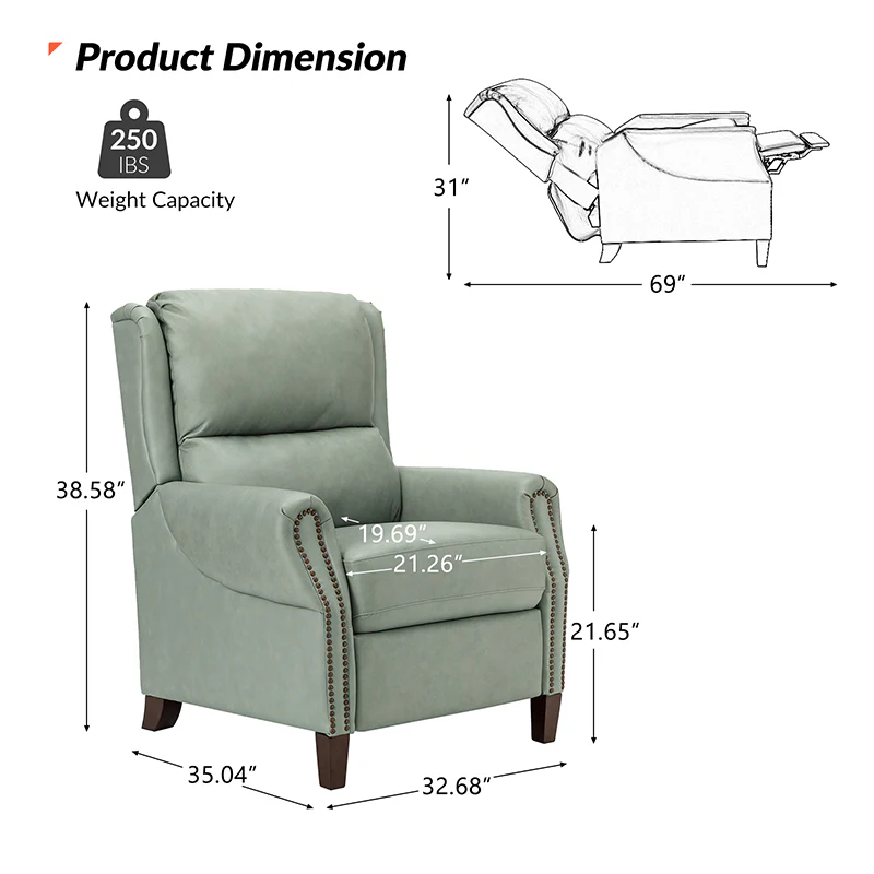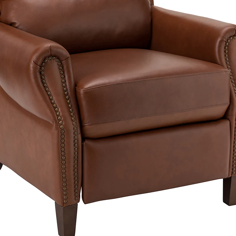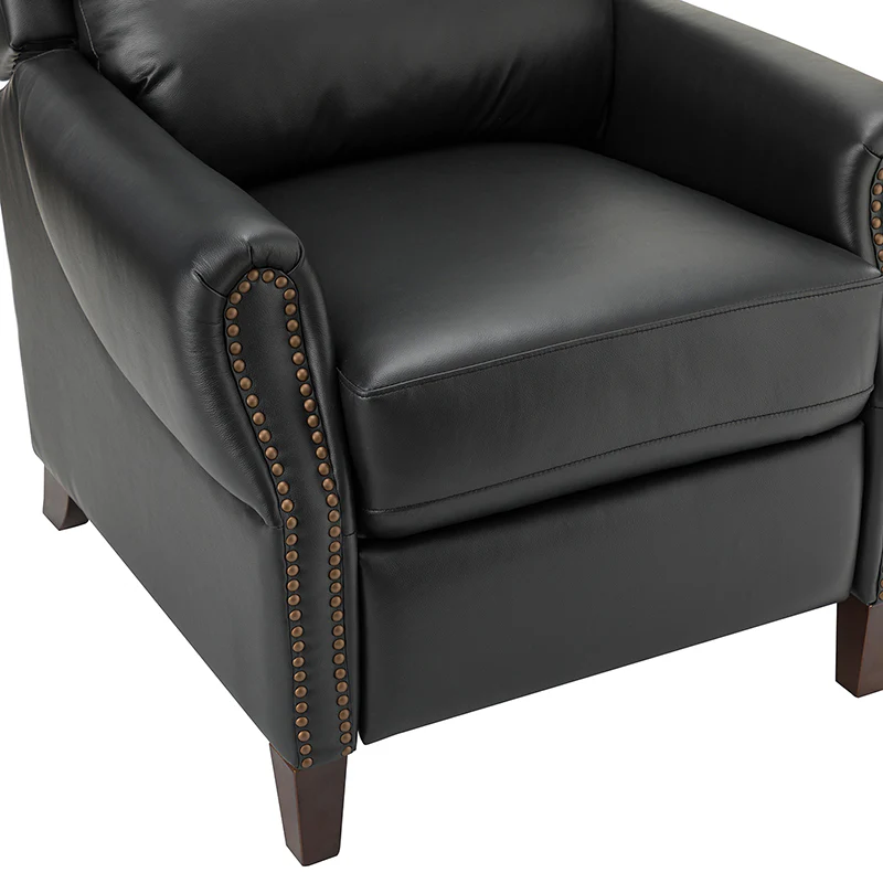 This recliner is perfect for you to enjoy your leisure time. Create a comfortable reading corner with a recliner that accentuates the beauty of the room. This recliner features a nailhead trim that is striking and adds an extra vintage touch. With its built-in sinuous S-spring and thick foam, it will immerse you in incredible comfort and you won't want to get up again. Tired from a long day at work or if you want to take a nap, then lean back and this recliner can easily recline, allowing the footrest to rise and comfortably support your legs. Four solid wood legs firmly support the entire frame, so you do not have to worry about its weight capacity. Come and have a recliner of your own!