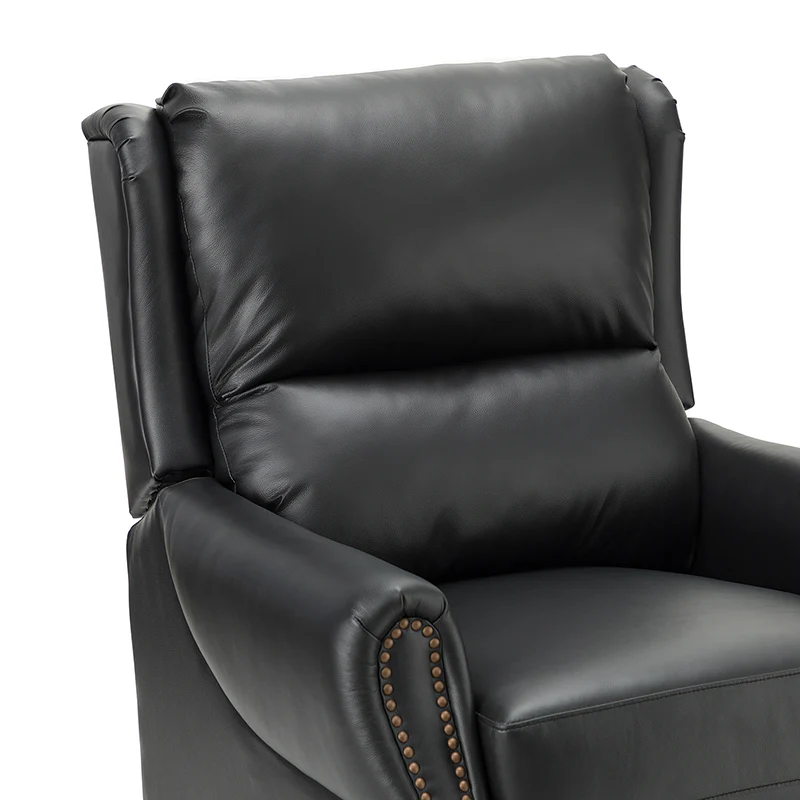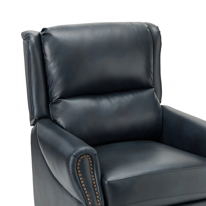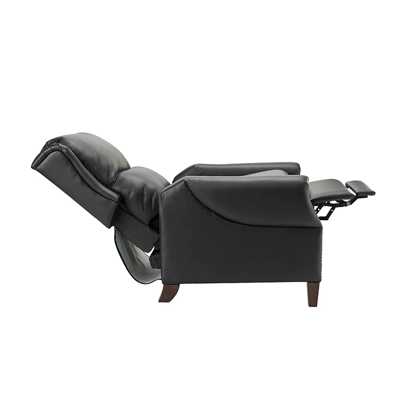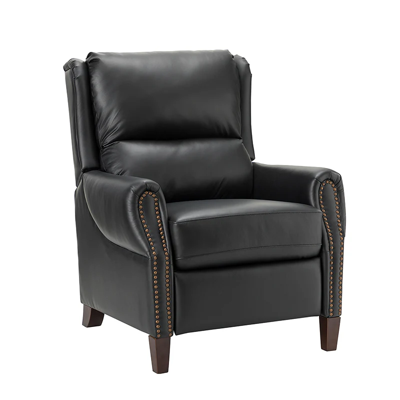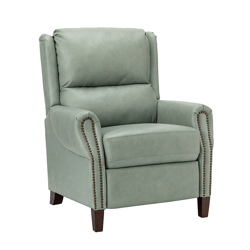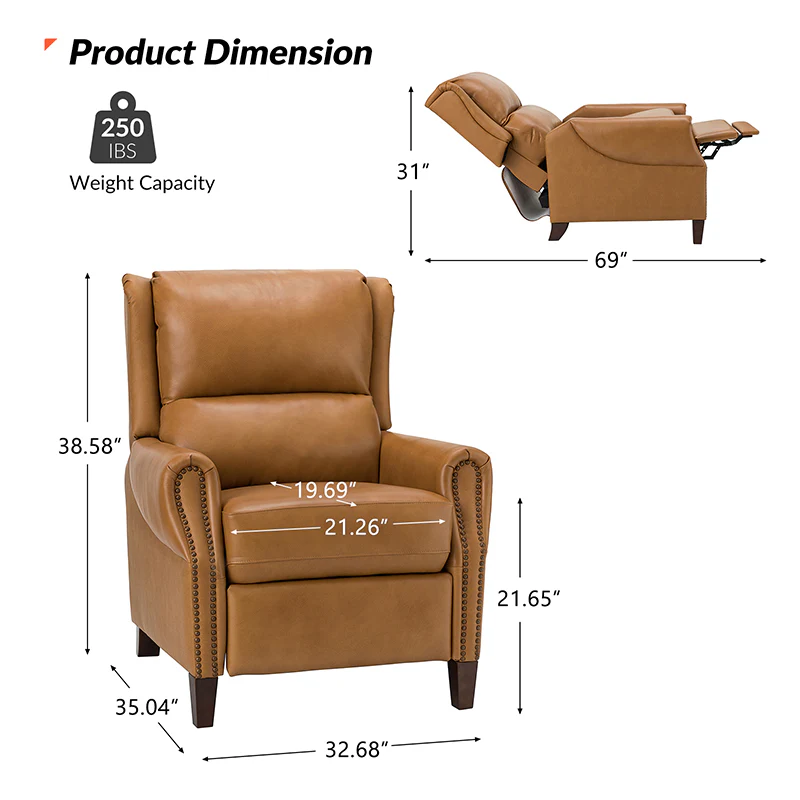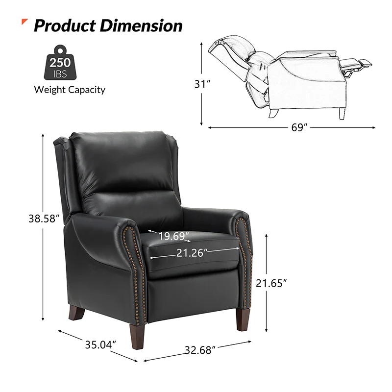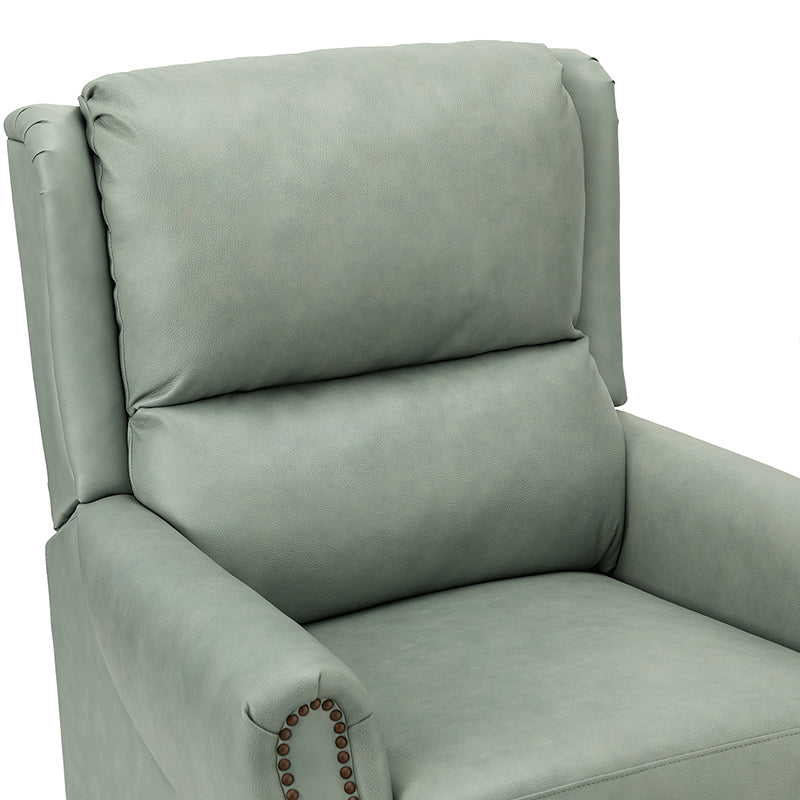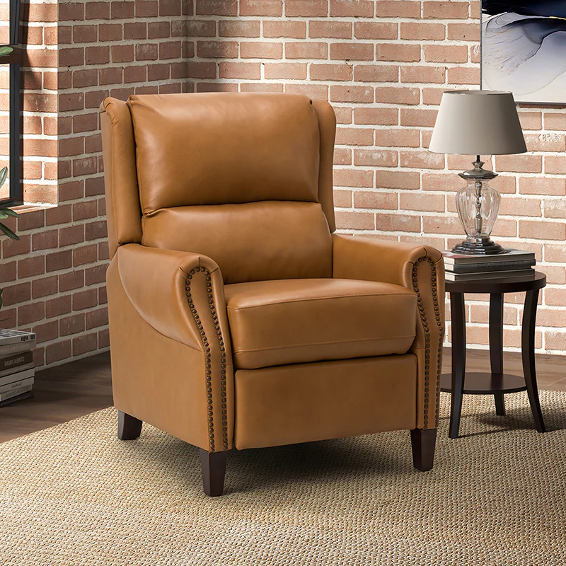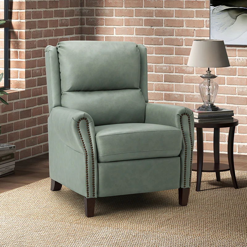 This recliner is perfect for you to enjoy your leisure time. Create a comfortable reading corner with a recliner that accentuates the beauty of the room. This recliner features a nailhead trim that is striking and adds an extra vintage touch. With its built-in sinuous S-spring and thick foam, it will immerse you in incredible comfort and you won't want to get up again. Tired from a long day at work or if you want to take a nap, then lean back and this recliner can easily recline, allowing the footrest to rise and comfortably support your legs. Four solid wood legs firmly support the entire frame, so you do not have to worry about its weight capacity. Come and have a recliner of your own!