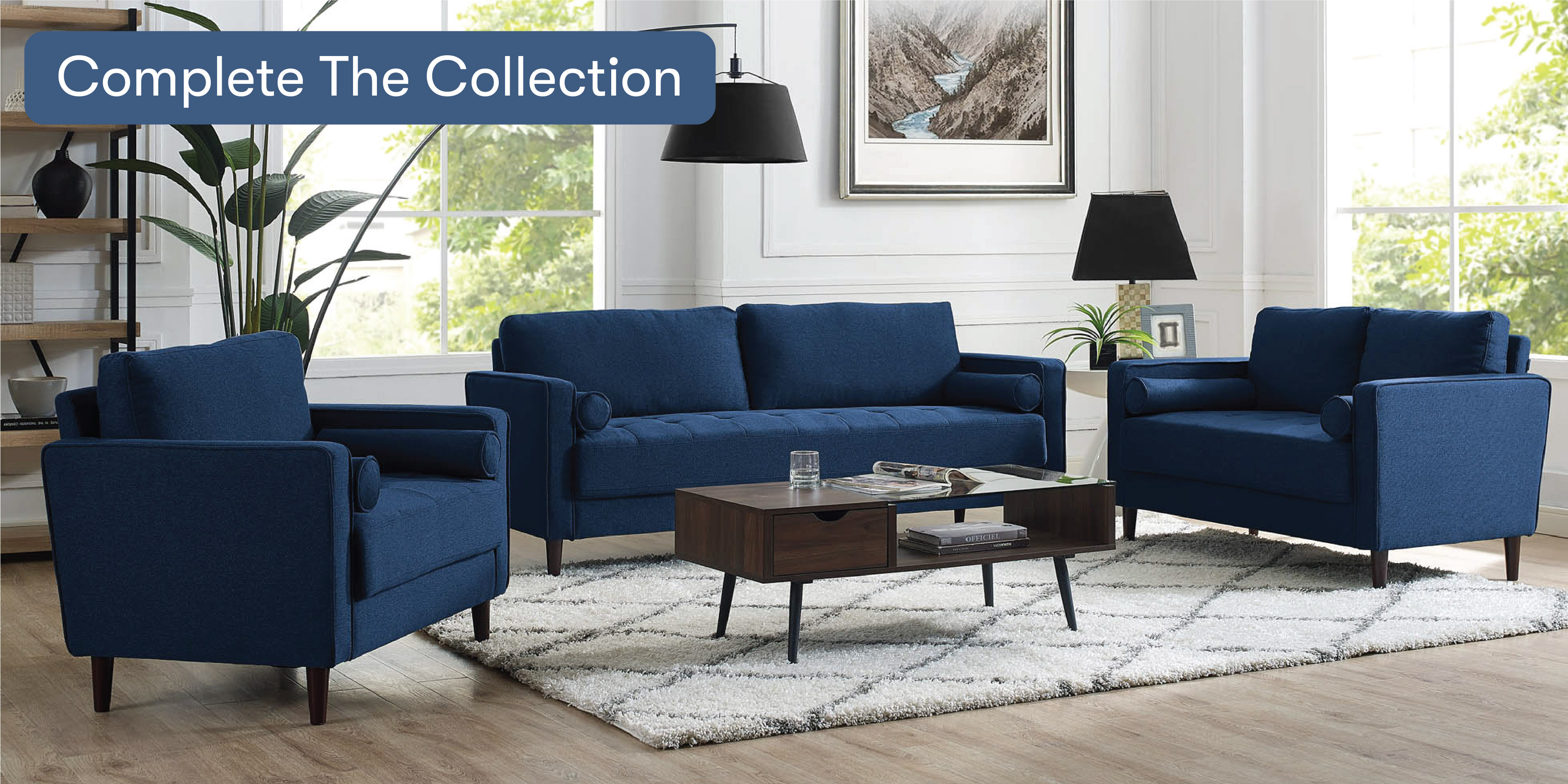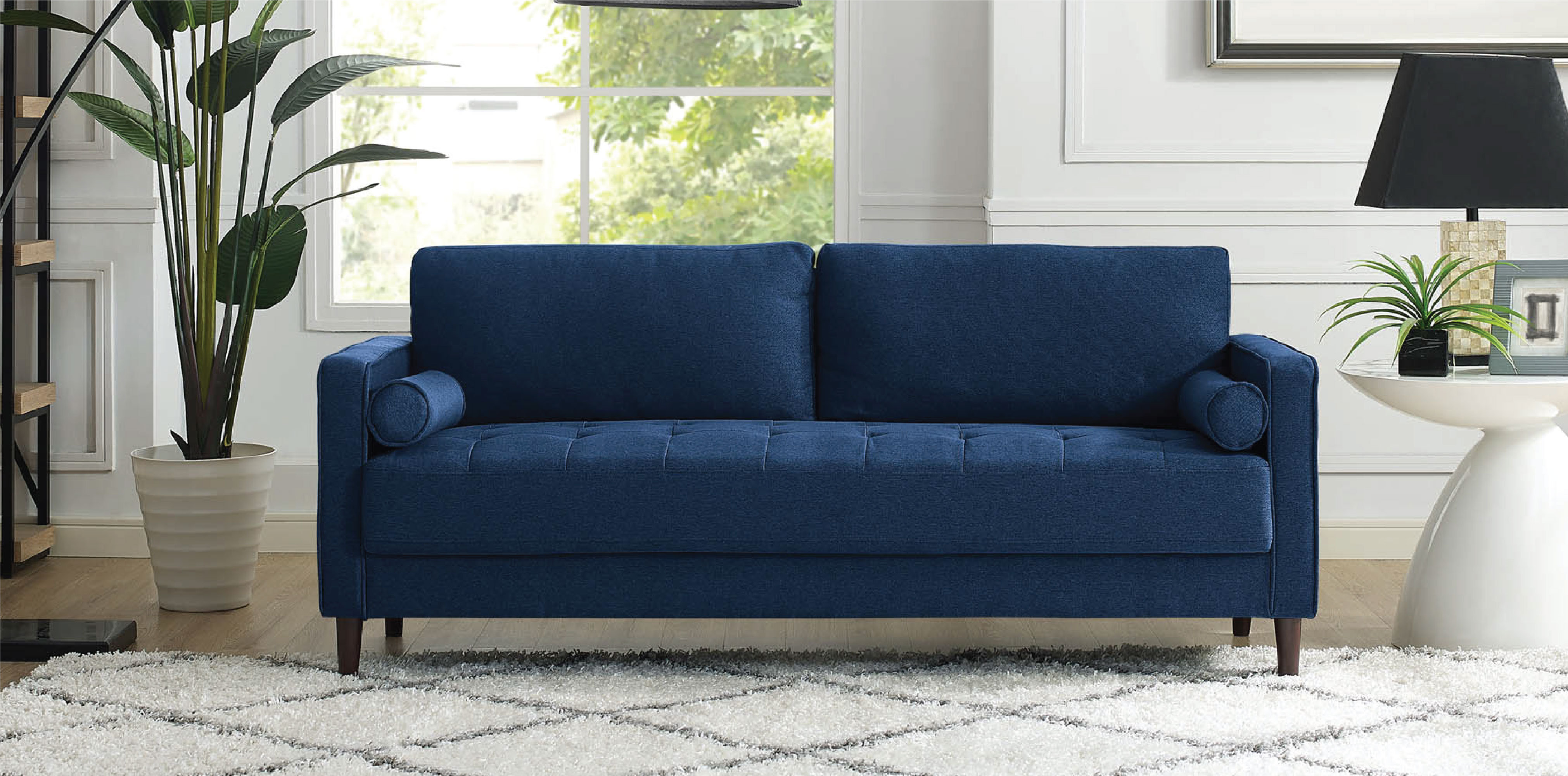 Simple assembly; Pocket coil comfort; Upholstered in a textured woven fabric; Button tufted seat cushions; Two accent pillows included.
