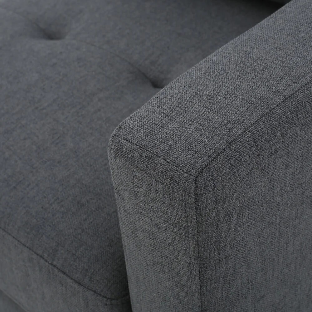 Made of polyester fabric, foam, and birch wood Set includes 1 right armchair, 1 left armchair, 1 corner chair, 2 armless chairs Your choice of a dark blue, light grey, or deep red upholstery Dark brown leg finish Attached, hook-and-loop cushion seats Separate pieces attach with locking hooks Removable, zippered seat covers Weighs 188 lbs. altogether