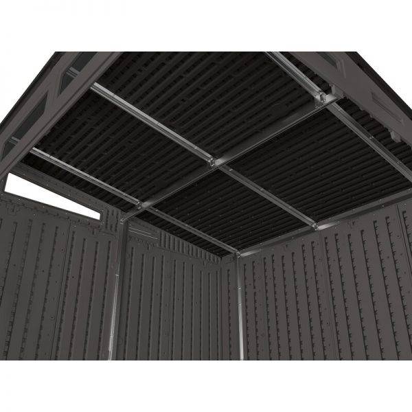 The modernist storage shed is ideal for storing all your outdoor equipment, whether small or large. The reinforced resin floor was built to withstand heavy loads, including tractors, mowers and other lawn or outdoor equipment. Sturdy double doors allow you to access your items easily, and is equipped with pad-lcokable metal handles (resin handle, metal slide latch) for added security (lock not included). The metal reinforced, multi-wall resin panel construction provides additional strength and stability to the unit to withstand the elements all year long.