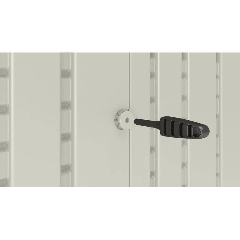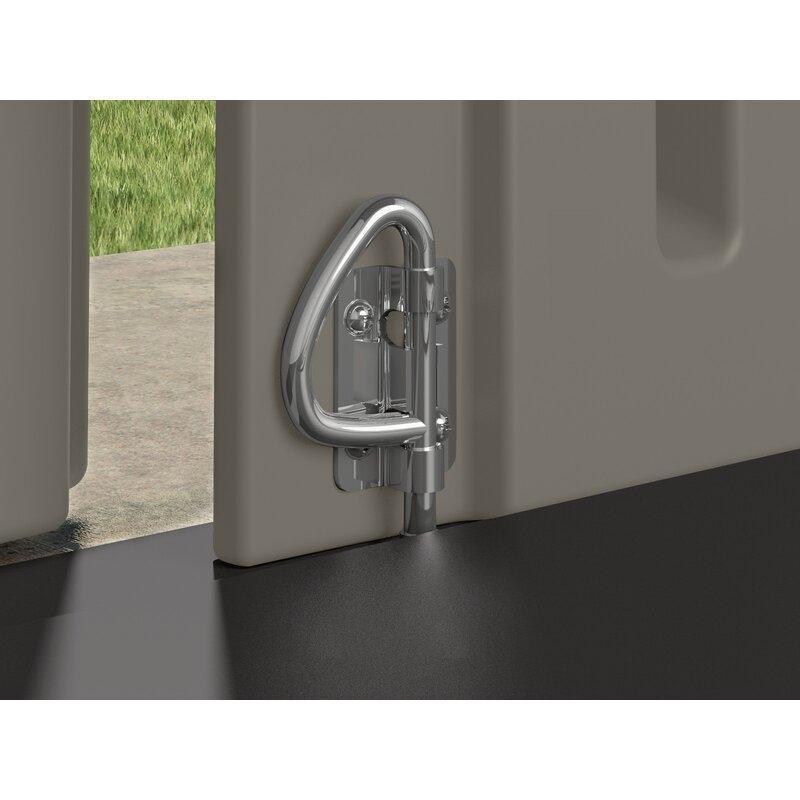 Description Make outdoor organization simple with this product. The capacity provides ample space to store large outdoor items such as garbage cans and recycling bins, long-handled garden tools, ladders, bikes, and more. It's durable, multi-wall resin construction is the weather, water, and UV-resistant and can withstand adverse weather conditions and wind gusts up to 60 mph. The double doors provide a wide opening to access items in the shed, and a padlock can be used to lock the unit for extra security (lock not included). The built-in vents allow for proper airflow, and multiple windows provide natural light and visibility into the shed. The reinforced floor provides extra support for heavier items such as tractors and ride-on lawnmowers with recommended install on a level, concrete foundation. It also offers convenient maintenance - simply wipe with a damp cloth for easy cleanup. This storage shed is easy to assemble with minimal tools required. The decorative siding panels and shingle-pattern roof make this shed an attractive and functional outdoor storage solution.