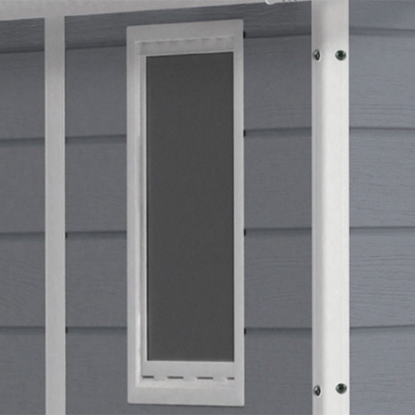 About this item Dimensions (L x W x H): approximately 185,8 x 236,8 x 227 cm Room contents approx. 7.6 m³ One double door, 1 Fixed Window Lockable (lock not included in the box contents.) Made of UV-resistant, all-weather, high-quality polypropylene (plastic)
