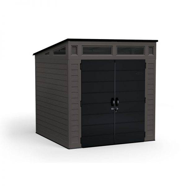 The modernist storage shed is ideal for storing all your outdoor equipment, whether small or large. The reinforced resin floor was built to withstand heavy loads, including tractors, mowers and other lawn or outdoor equipment. Sturdy double doors allow you to access your items easily, and is equipped with pad-lcokable metal handles (resin handle, metal slide latch) for added security (lock not included). The metal reinforced, multi-wall resin panel construction provides additional strength and stability to the unit to withstand the elements all year long.