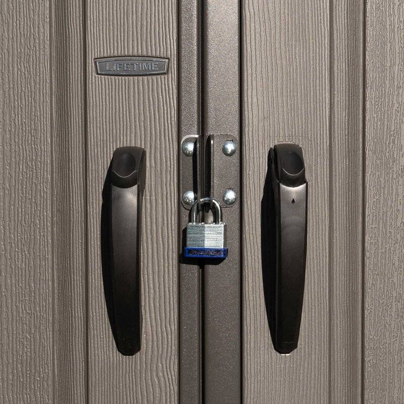 describe This 10' wide x 8' deep steel reinforced polyethylene storage shed will provide the perfect storage space for all your tools. It's the perfect addition to your outdoor space and will keep your tools organized. It is made of steel and double-layer steel reinforced polyethylene to provide years of reliable use. A gabled roof adds a traditional touch to the garden shed. The Tool Shed's desert tan and dark brown finishes give it a classic look that also enhances its overall look. It includes four small skylights, two large skylights and two corner shelves. Shielded vents will provide airflow and keep the shed free of pests. Its rear window can be left open for increased ventilation. Two shatterproof polycarbonate sides will allow light and air into the shed and maintain a fresh ambience. High-density and non-slip plastic floors will provide excellent stability and your tools will be more accessible. What is included? 4 built-in shelves/shelves ventilation door lock 2 windows ground sky light shed double door Base Product Details Shed Type: Storage Shed Primary Materials: Plastic; Metal Storage Capacity: 494.5 cubic feet Wind Level: 65 Other tools needed (not included): screwdriver; adjustable wrench; hammer; pliers; utility knife; adjustable wrench including floors Floor Material: Plastic/Polyethylene