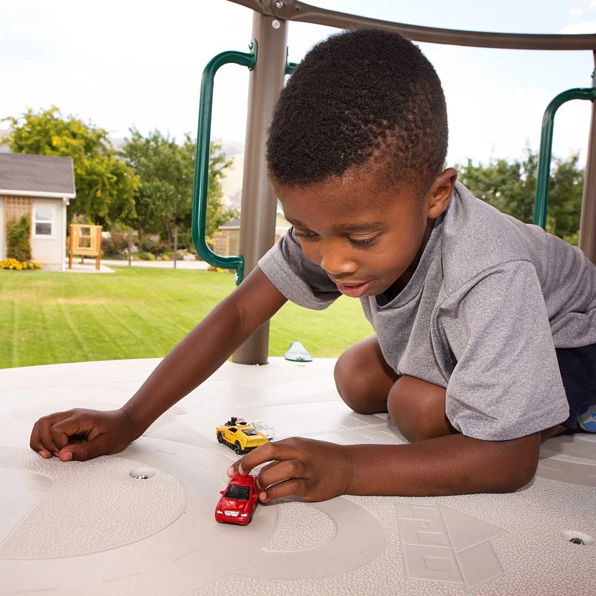 • 1 trapeze bar, 2 swings, 2 sturdy 3-D climbing walls, car map, steering wheel, ladder, and a 9' slide.