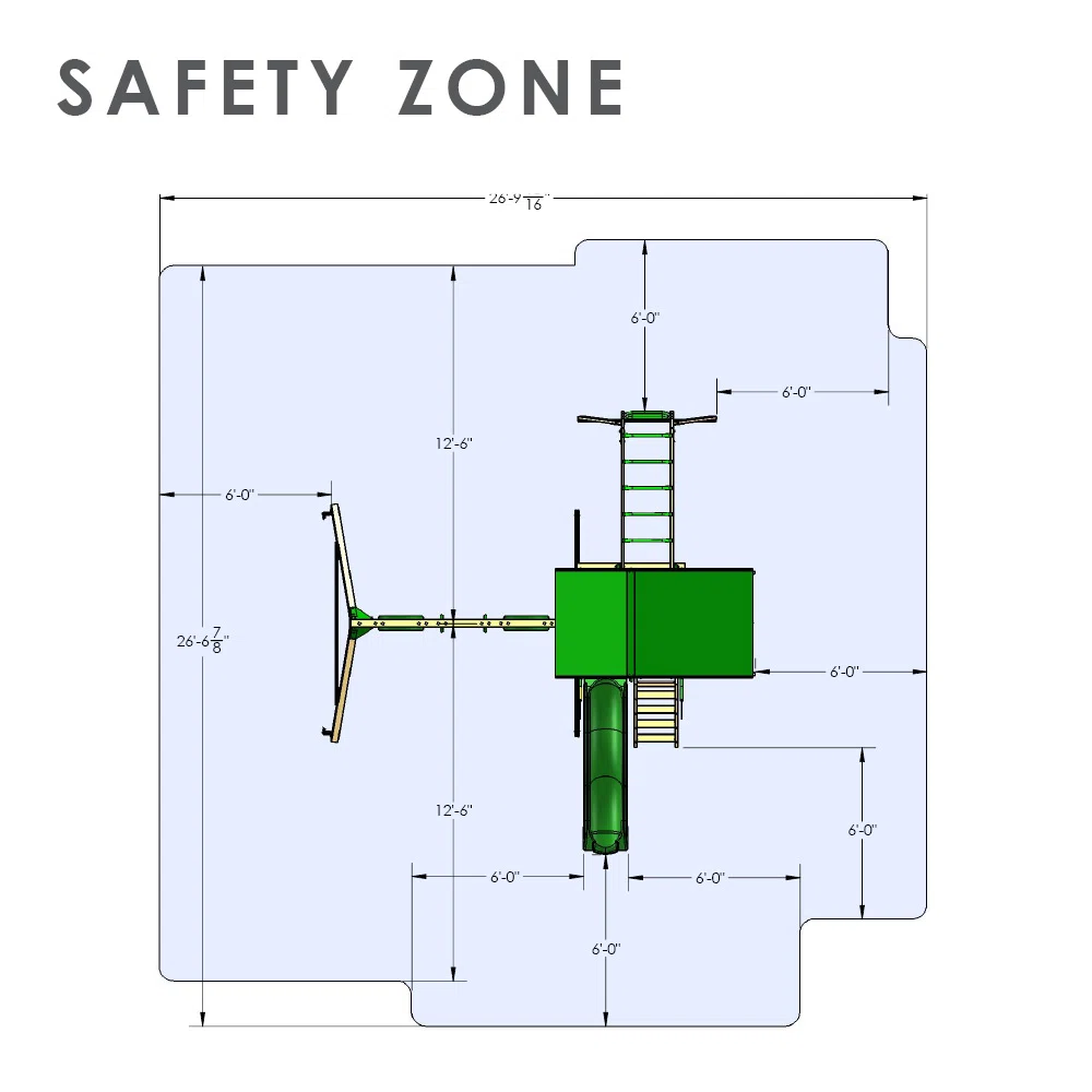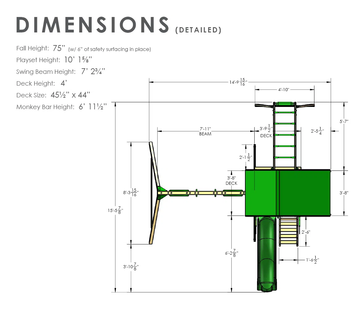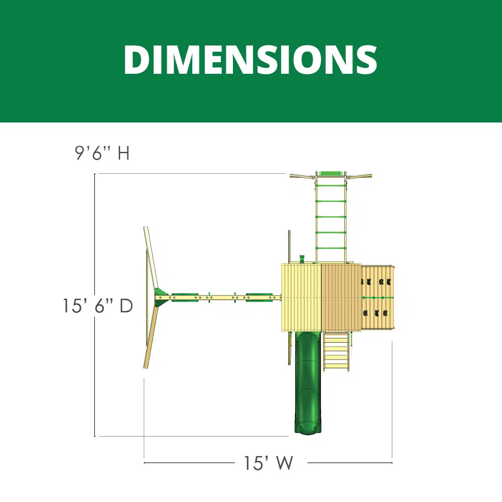 Overall 10' 6'' H X 15' W X 15' 6'' D Chain/Rope Length - End to End 5' L Beam Length - End to End 7' 11'' L Swing Beam Height - Top to Ground 7' H Recommended Safety Zone 689 square feet Overall Product Weight 315 lb.