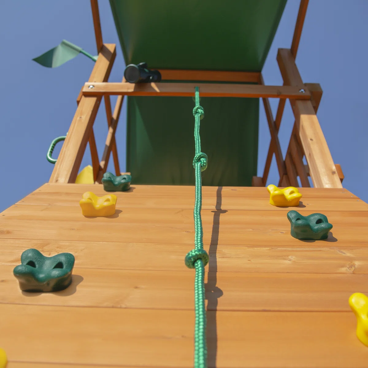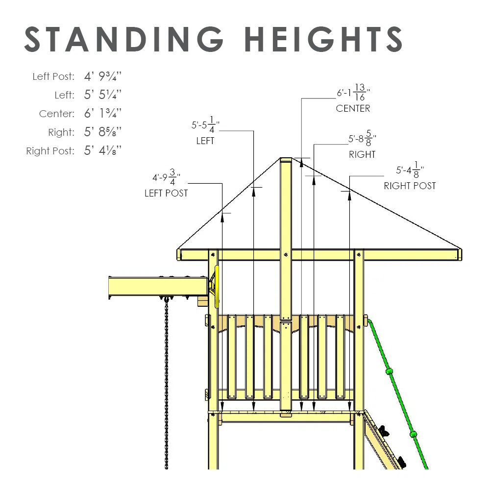 Frame Material Solid Wood Pre-Stained Yes Hardware Material Zinc Swing Included Yes Swing Suspension Type Chain Number of Swings 3 Swing Types Included Belt Swing Coated Chain Yes Total Swing Positions 3 Slide Included Yes Slide Type Wave Slide Material Plastic Ladder Included Yes Ladder Type Step Ladder Number of Ladders 1 Climber Included Yes Monkey Bars Included Yes Play Deck Included Yes Play Deck Material Solid Wood Rooftop Included Yes Sand Box Included Yes Trapeze Bar / Rings Included Yes Trapeze Bar Type Bar Playhouse Included Yes Safety Handles Included Yes Bridge / Tunnel Included No Steering Wheel Included Yes Telescope Included Yes Wood Species Cedar Imported Yes Durability Weather Resistant, Rust Resistant, UV Resistant Weight Capacity 800 lb. Swing Weight Capacity 225 lb. Play Deck Weight Capacity 500 lb. Slide Weight Capacity 250 lb. Frame Color / Finish Brown Chain Coating Material Plastisol Swing Material Plastic Number of Slides 1 Slide Color Brown