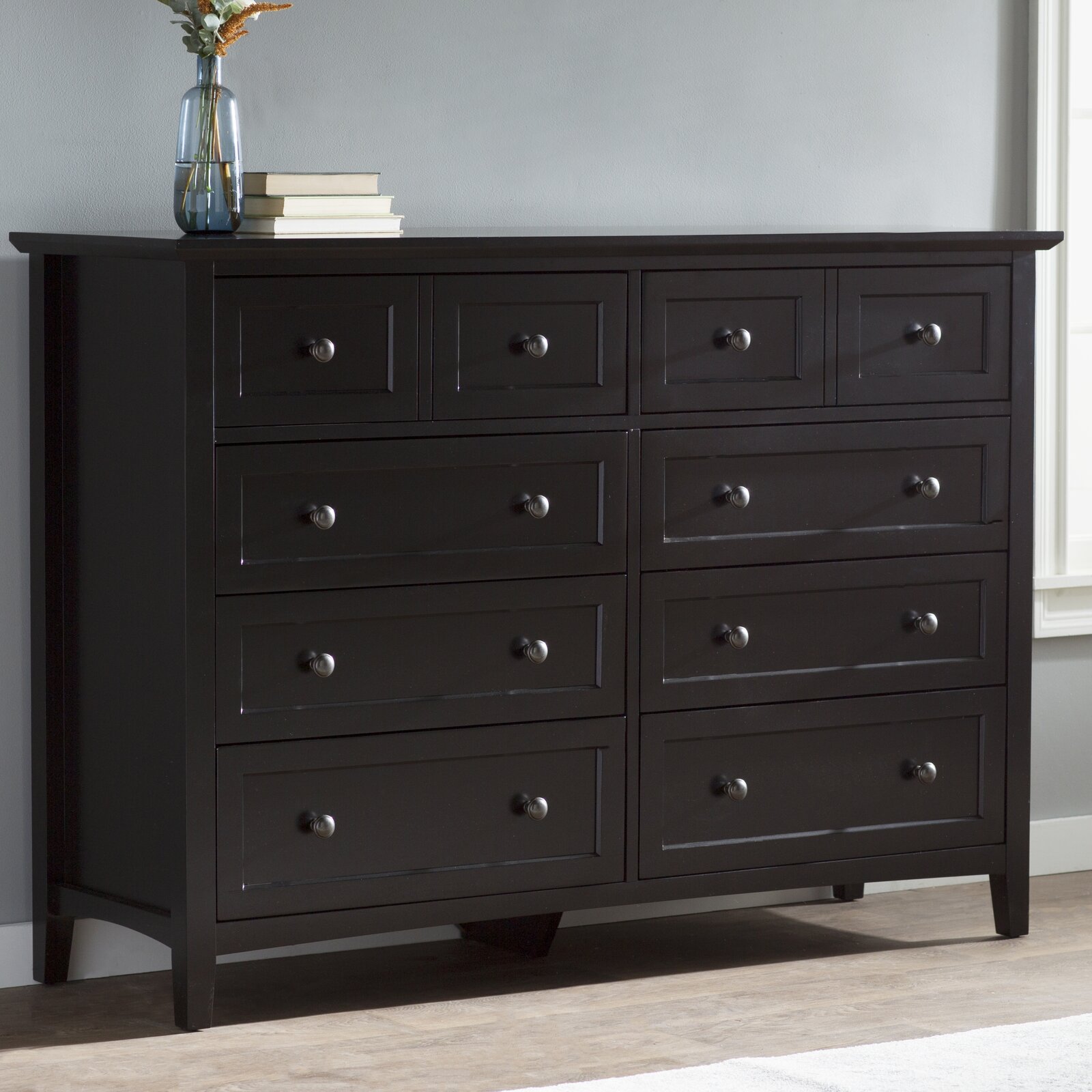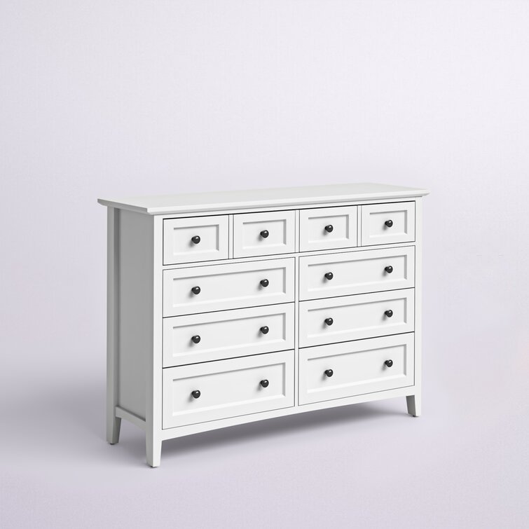 Round out your bedroom in simple style with this traditional 8-drawer double dresser. It's crafted from a mix of solid wood and MDF. and features raised. molded panels that add a dash of dimension to your decor. This dresser is finished in a solid color that blends effortlessly into both monochromatic and vibrant spaces. And since it has eight drawers. there's room for your socks as well as your sheets. Best of all. no assembly is required.