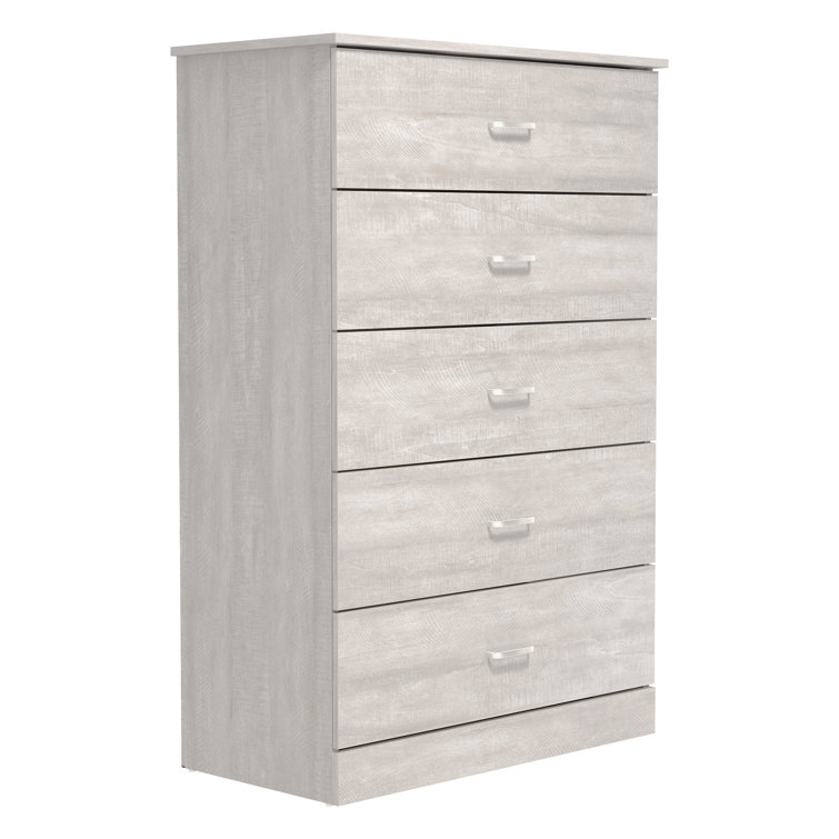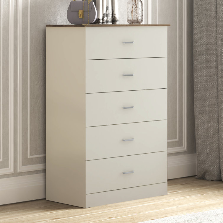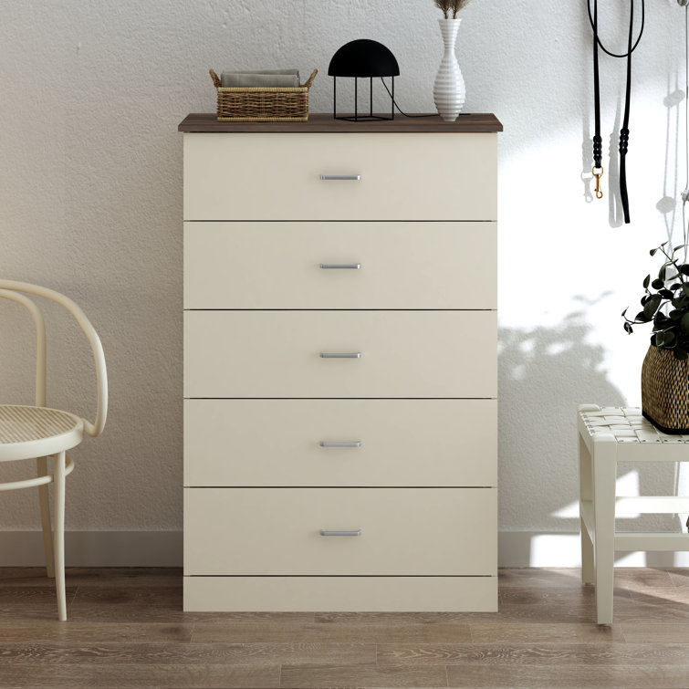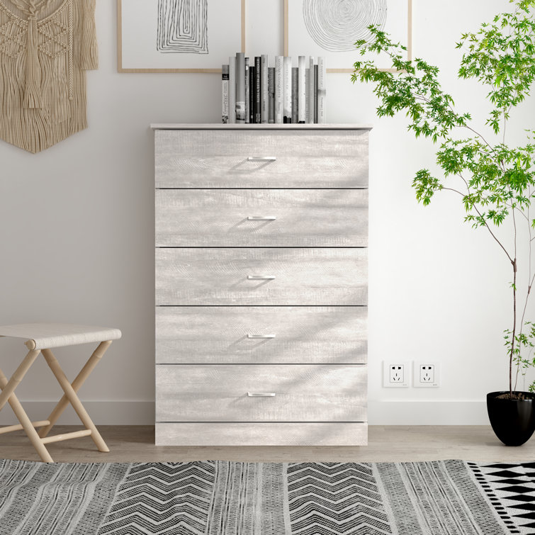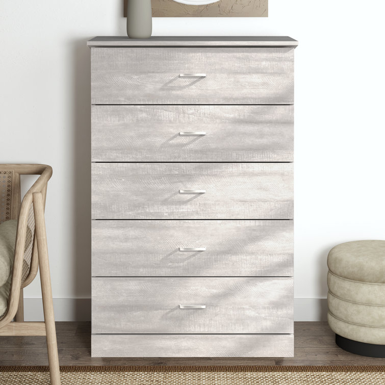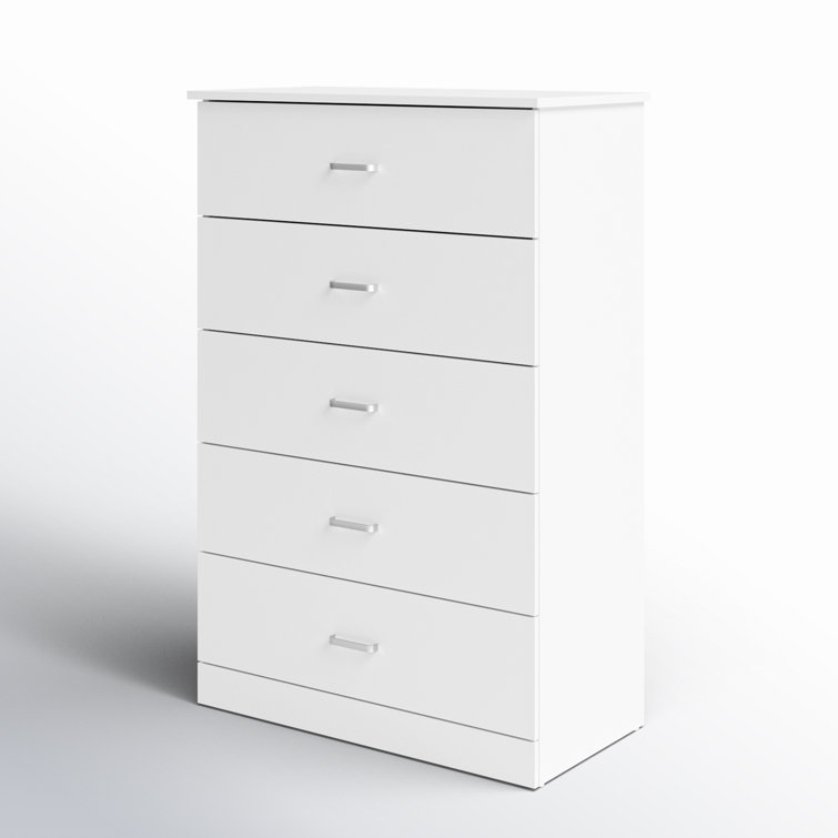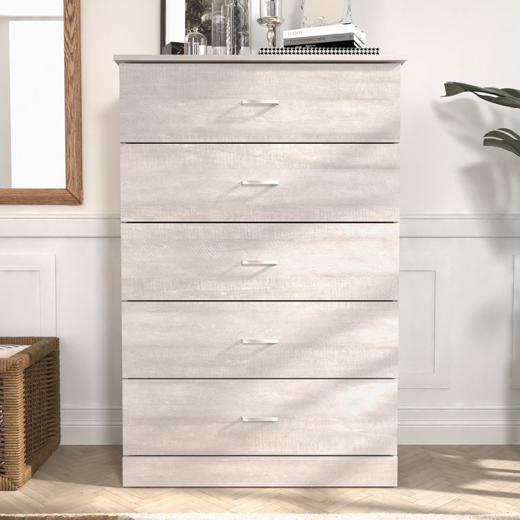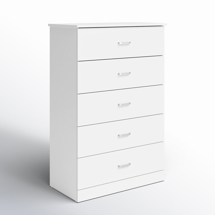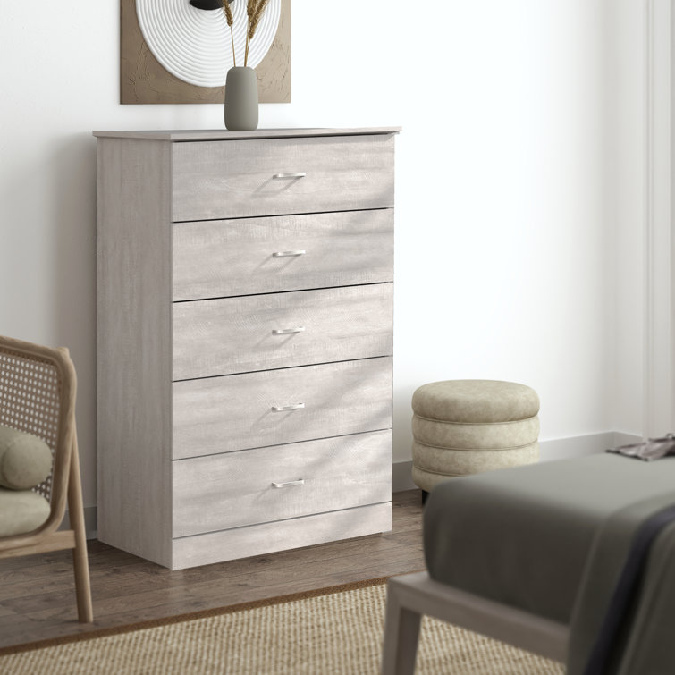 This 5-drawer dresser delivers sleek materials and a clean-lined look. It's built from engineered wood with a neutral finish, and it features a streamlined rectangular design. The five stacked drawers provide a place for everything from sweaters to denim, and its top surface easily holds a couple of decor items. Plastic drawer pulls and a barely-there plinth base round out the modern look. Plus, a wall anchor is included for added safety.
