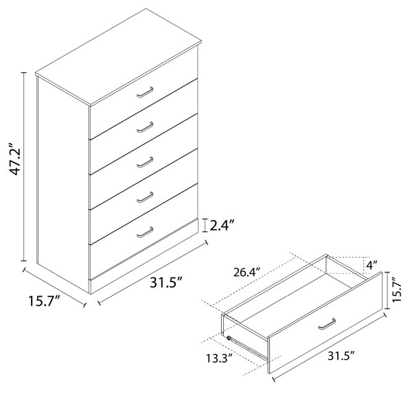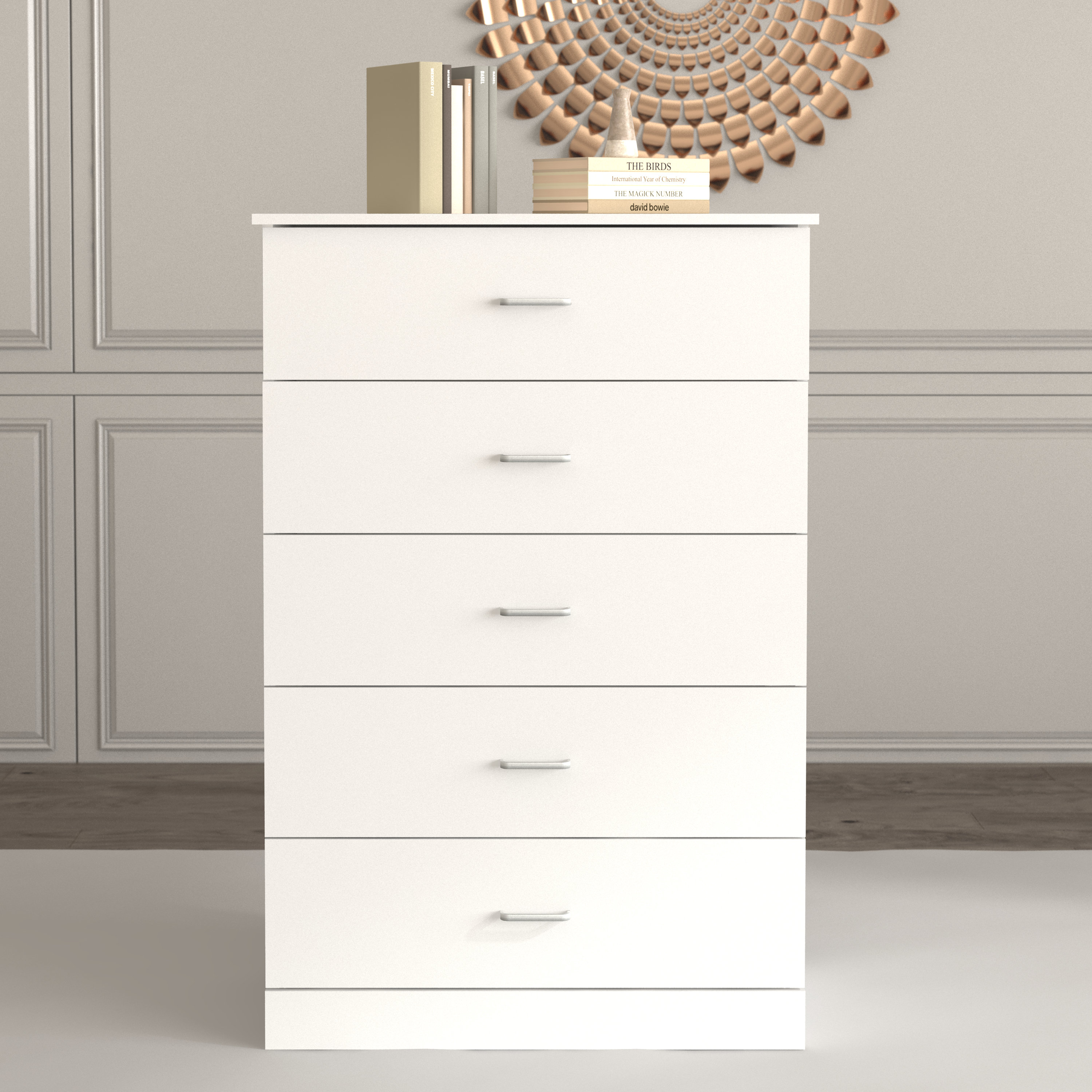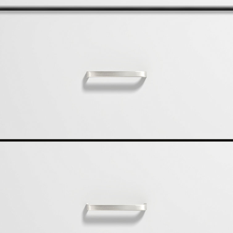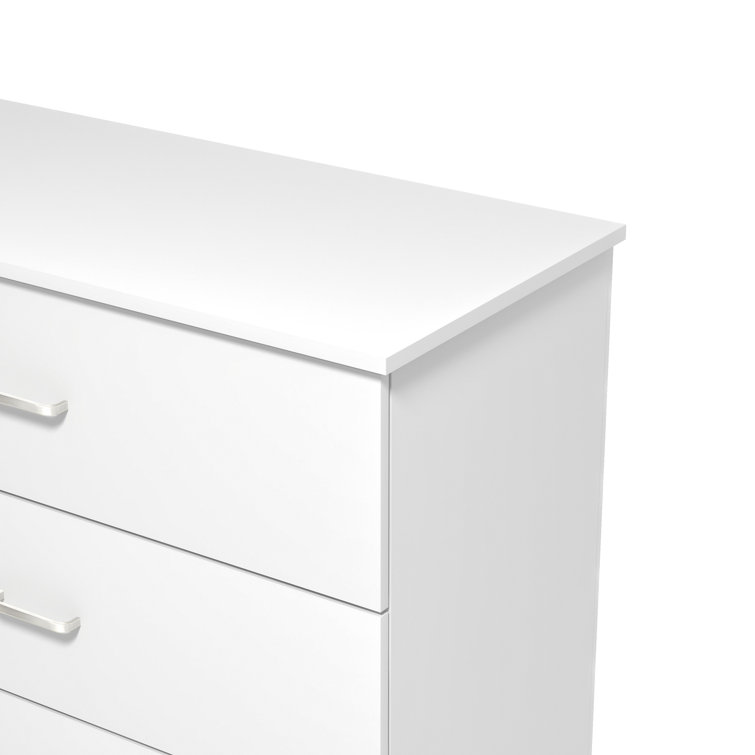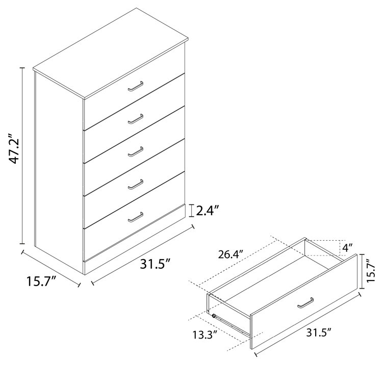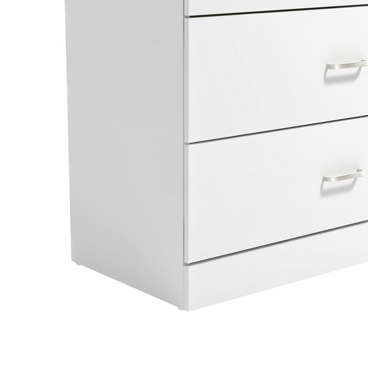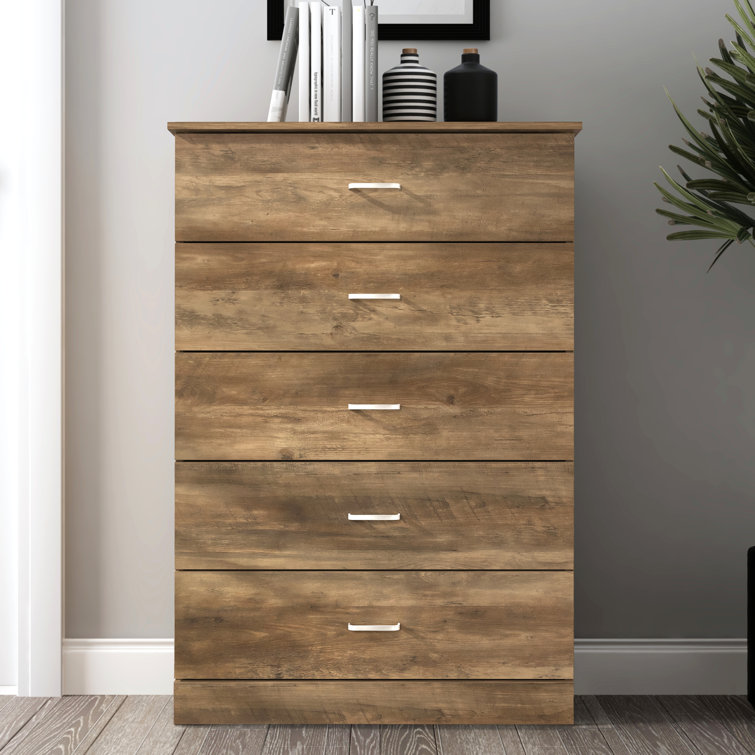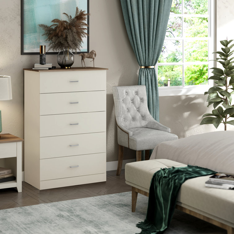 This 5-drawer dresser delivers sleek materials and a clean-lined look. It's built from engineered wood with a neutral finish, and it features a streamlined rectangular design. The five stacked drawers provide a place for everything from sweaters to denim, and its top surface easily holds a couple of decor items. Plastic drawer pulls and a barely-there plinth base round out the modern look. Plus, a wall anchor is included for added safety.