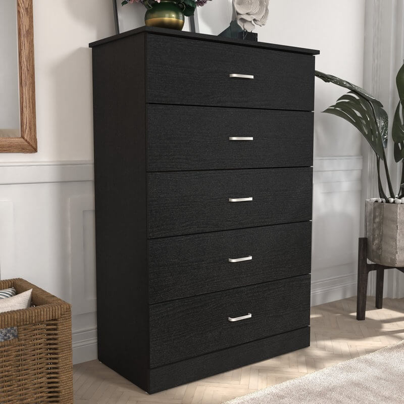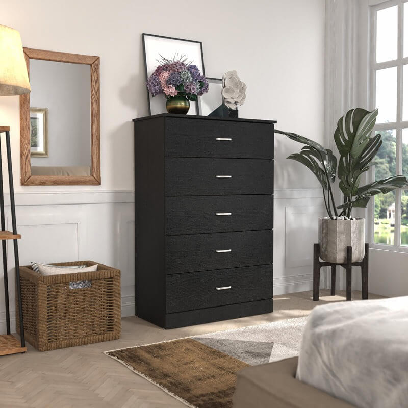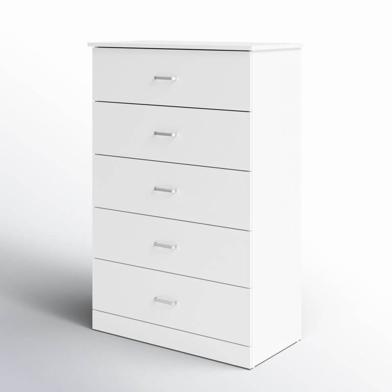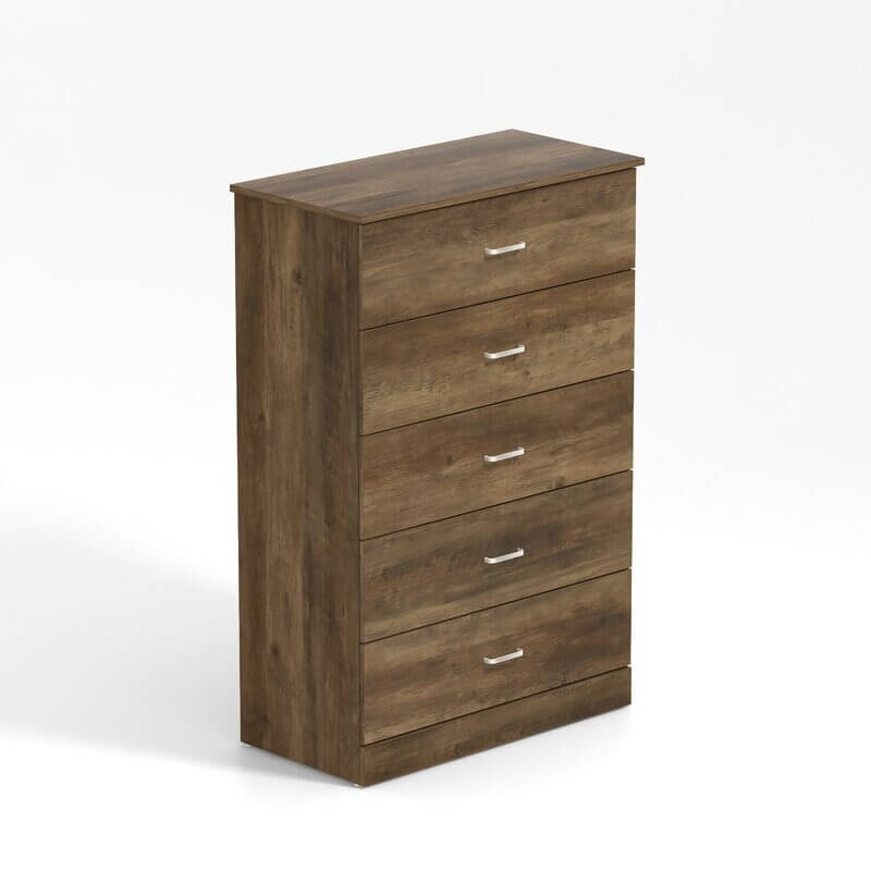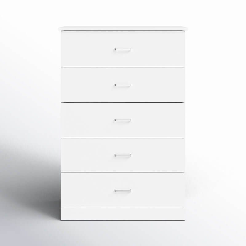 This 5-drawer dresser delivers sleek materials and a clean-lined look. Ultra-fast assembly method eases your assembly time. It's built from engineered wood with a neutral finish, and it features a streamlined rectangular design. The five stacked drawers provide a place for everything from sweaters to denim, and its top surface easily holds a couple of decoration items. Plastic drawer pulls and a barely-there plinth base round out the modern look. Plus, a wall anchor is included for added safety.