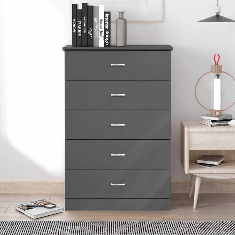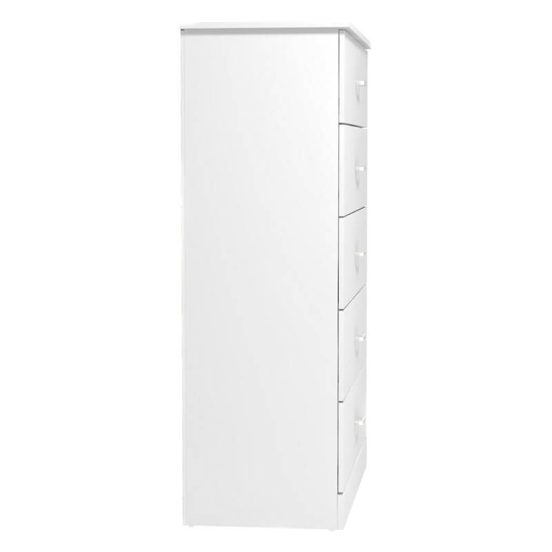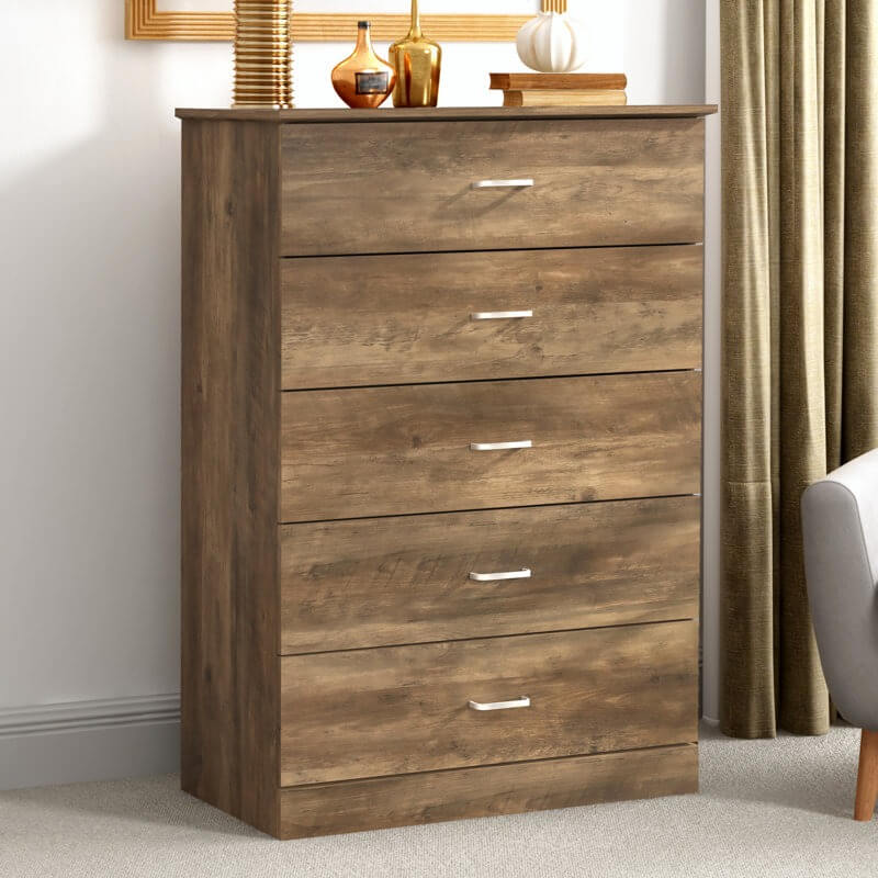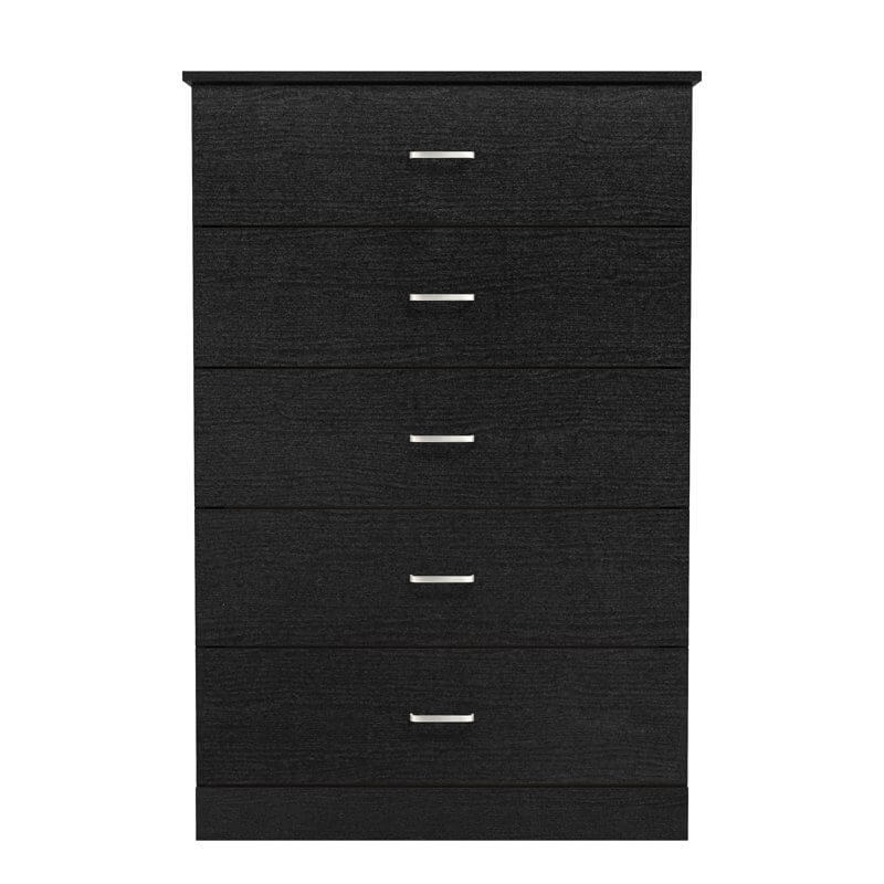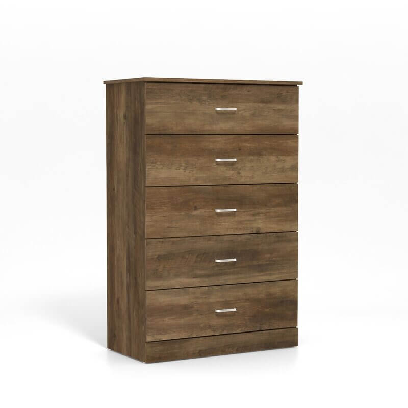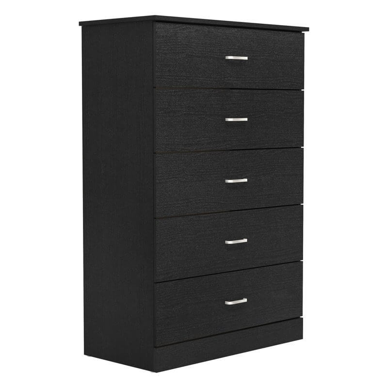 This 5-drawer dresser delivers sleek materials and a clean-lined look. Ultra-fast assembly method eases your assembly time. It's built from engineered wood with a neutral finish, and it features a streamlined rectangular design. The five stacked drawers provide a place for everything from sweaters to denim, and its top surface easily holds a couple of decoration items. Plastic drawer pulls and a barely-there plinth base round out the modern look. Plus, a wall anchor is included for added safety.