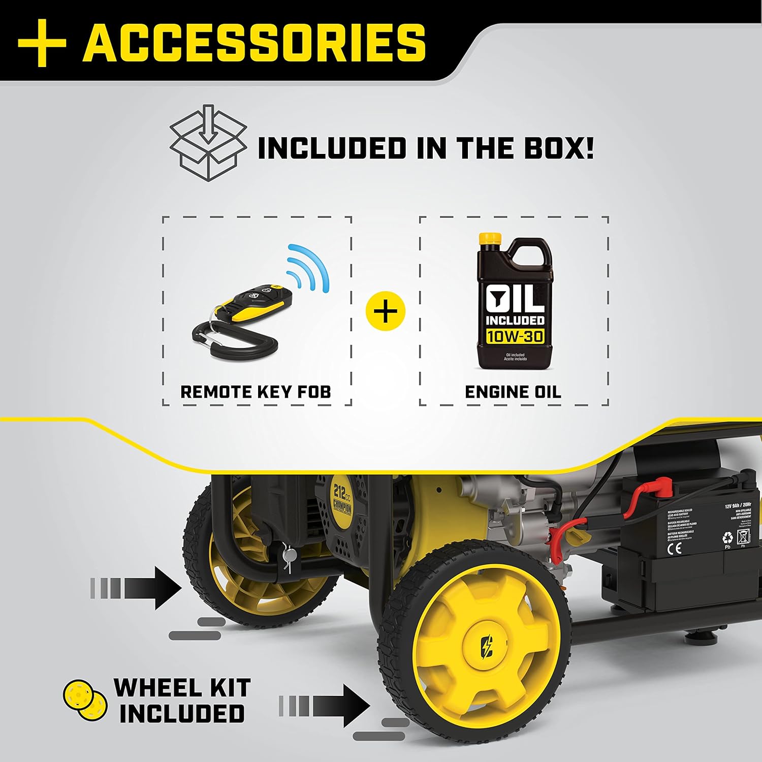 | Included Components | Wheel Kit, Handle, Remote Key Fob, Engine Oil, Oil Funnel |