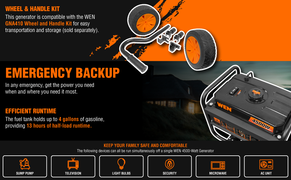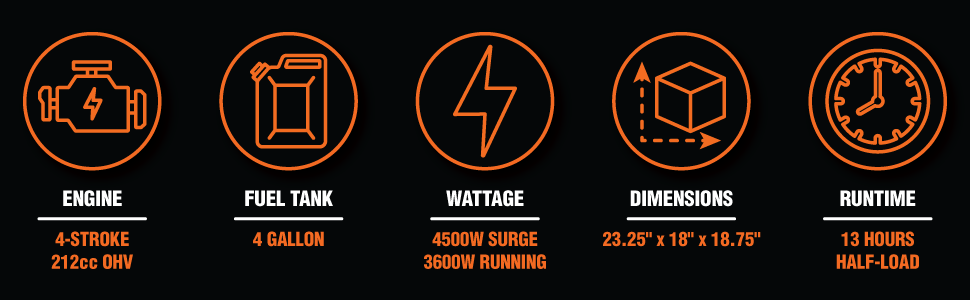 - 4-gallon fuel tank provides a half-load runtime of up to 13 hours