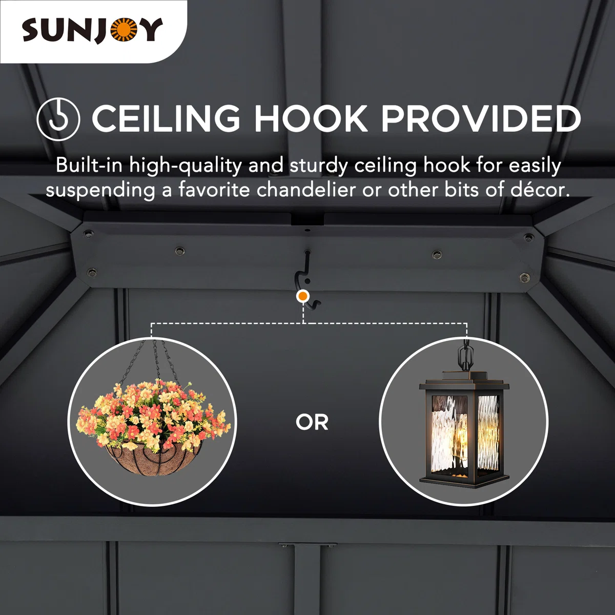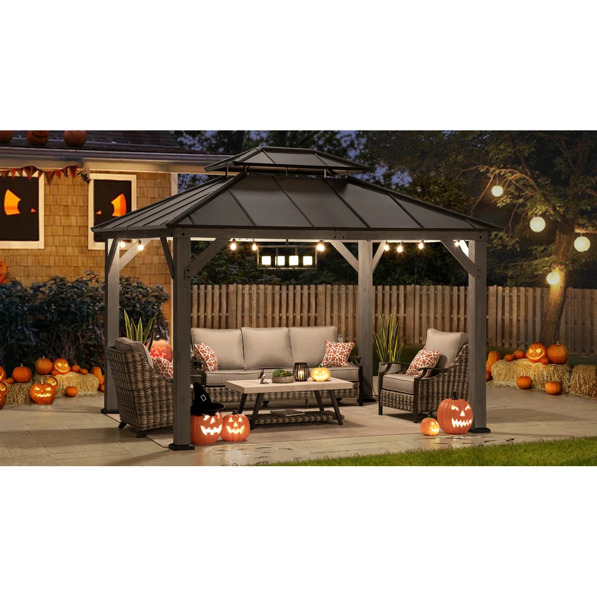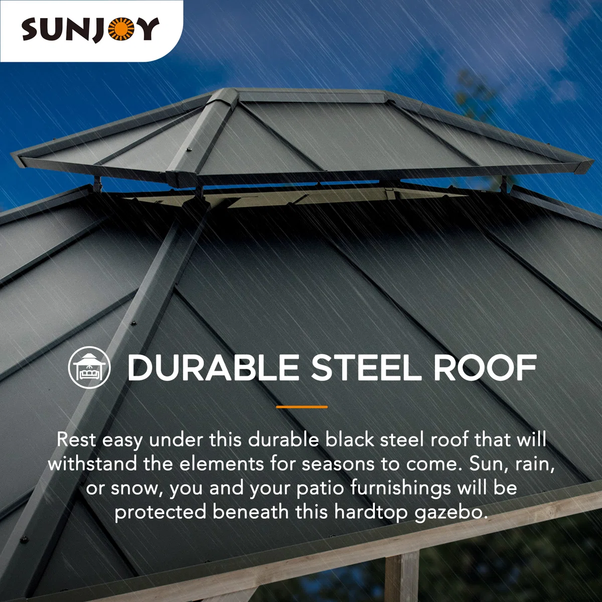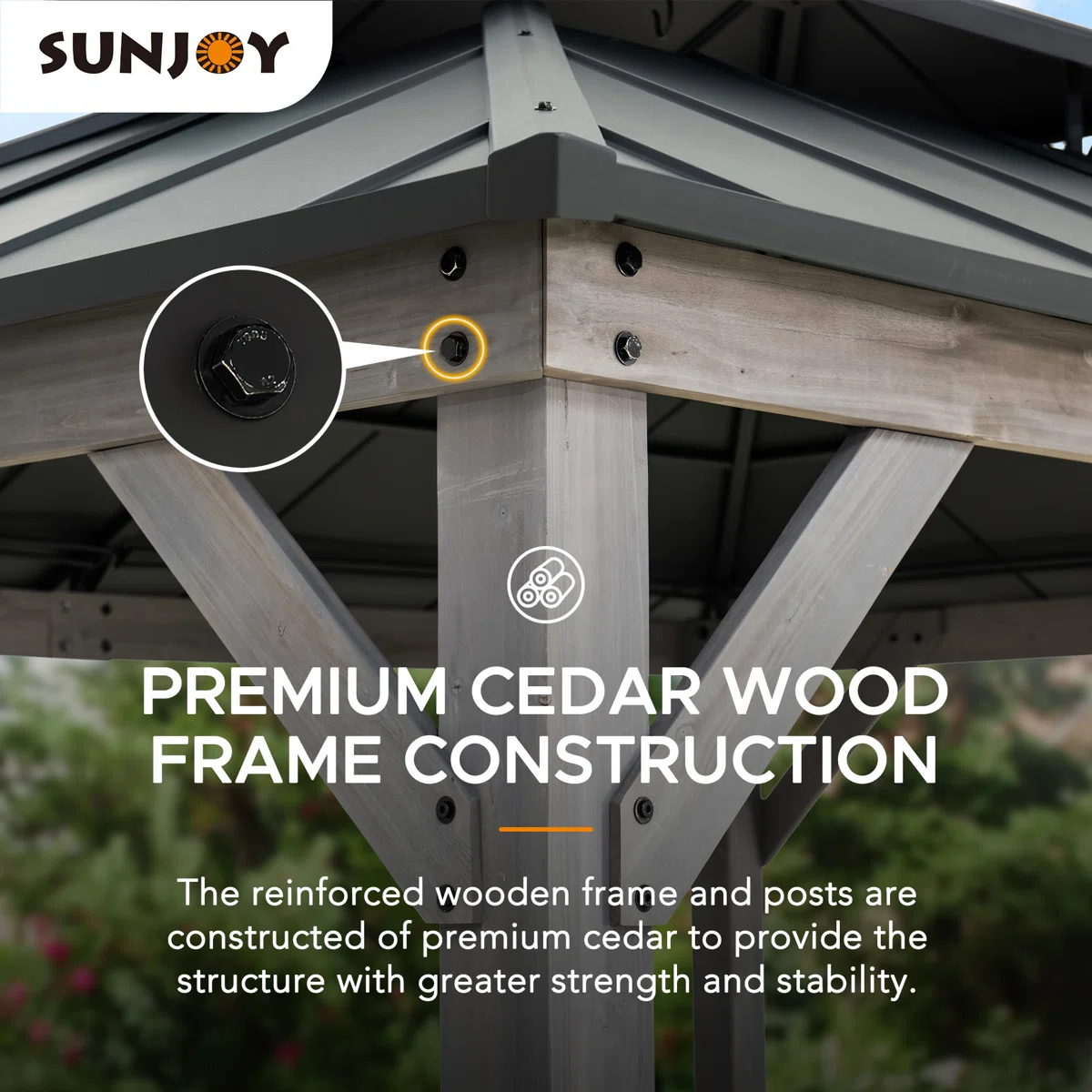 Expand your living space by bringing the indoors outside and creating your end-of-the-day oasis that’s the perfect spot for entertaining family and friends. This 10 ft. x 12 ft. gazebo by the world’s leading ready-to-assemble outdoor structure maker, Sunjoy, creates the perfect outdoor setting for any time of the year. Spend all four seasons enjoying a covered spot outdoors under the Cedar wood frame with a sturdy powder-coated steel rooftop that will stand the test of time. Set the mood by suspending a chandelier from the incorporated ceiling hook for additional functional light and high design. With straightforward, easy-to-follow assembly instructions you’ll be relaxing with your beverage of choice in your favorite new outdoor living space for years to come.