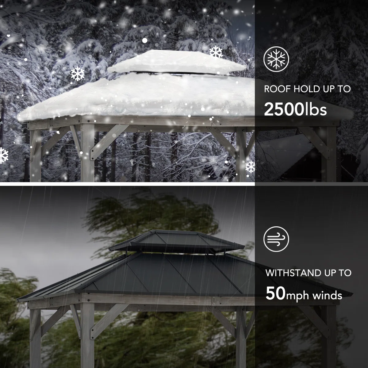 Product Type Patio Gazebo Design Patio Gazebo Portable No Footprint Shape Rectangular Frame Material Solid Wood Roof Type Hardtop Roof Material Steel Roof Included Yes Tiered Roof Yes Snow Load Capacity 2,500 lb. Anchor / Mounting Kit Included Yes Wood Species Wood Year-Round Use Yes Weather Resistant Yes UV Resistant Yes Water Resistant Yes Fire Resistant Yes Rot Resistant Yes Rust Resistant Yes Imported Yes Paintable Yes Durability Water Resistant, UV Resistant, Rot Resistant, Fire Resistant, Weather Resistant, Rust Resistant Roof Color Black/Brown