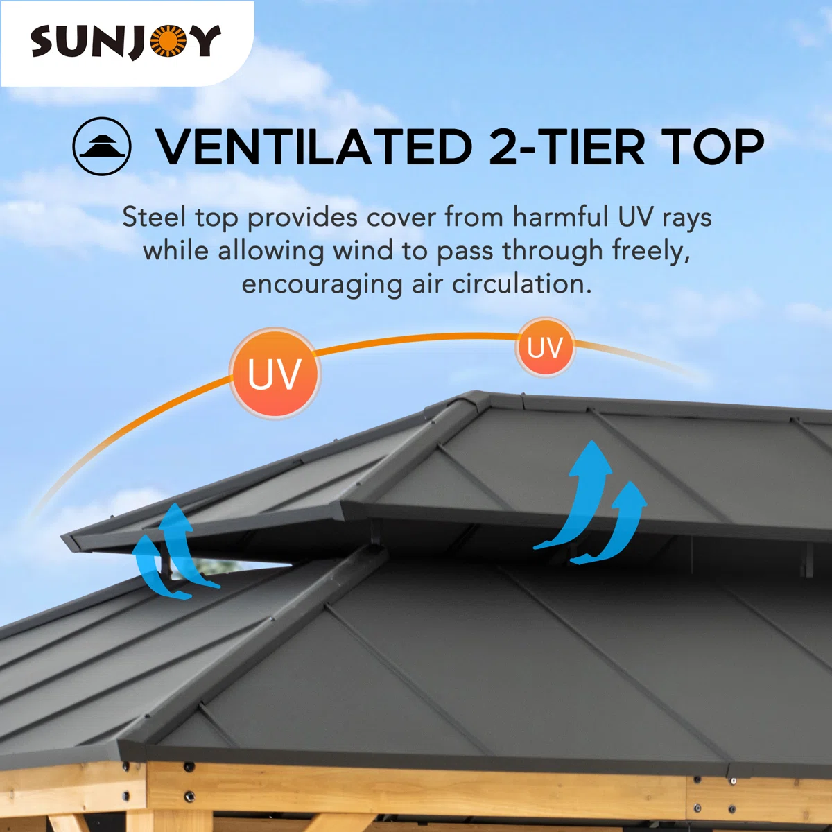 Expand your living space by bringing the indoors outside and create an end-of-the-day oasis that’s an ideal spot for entertaining family and friends. This 12 ft. x 16 ft. wood gazebo from the world’s leading ready-to-assemble outdoor structure maker, Sunjoy, creates the perfect outdoor setting for a gathering any time of the year. Spend all four seasons enjoying your covered area outdoors under a cedar wood frame gazebo with a sturdy powder-coated steel rooftop that will stand the test of time. The 2-tier roof provides just the right amount of airflow while simultaneously keeping occasional inclement weather at bay. Set the mood by suspending a chandelier from the incorporated ceiling hook for functional light and a touch of elegant design. With straightforward, easy-to-follow assembly instructions you’ll soon be relaxing in your favorite new outdoor living space, and for years to come.