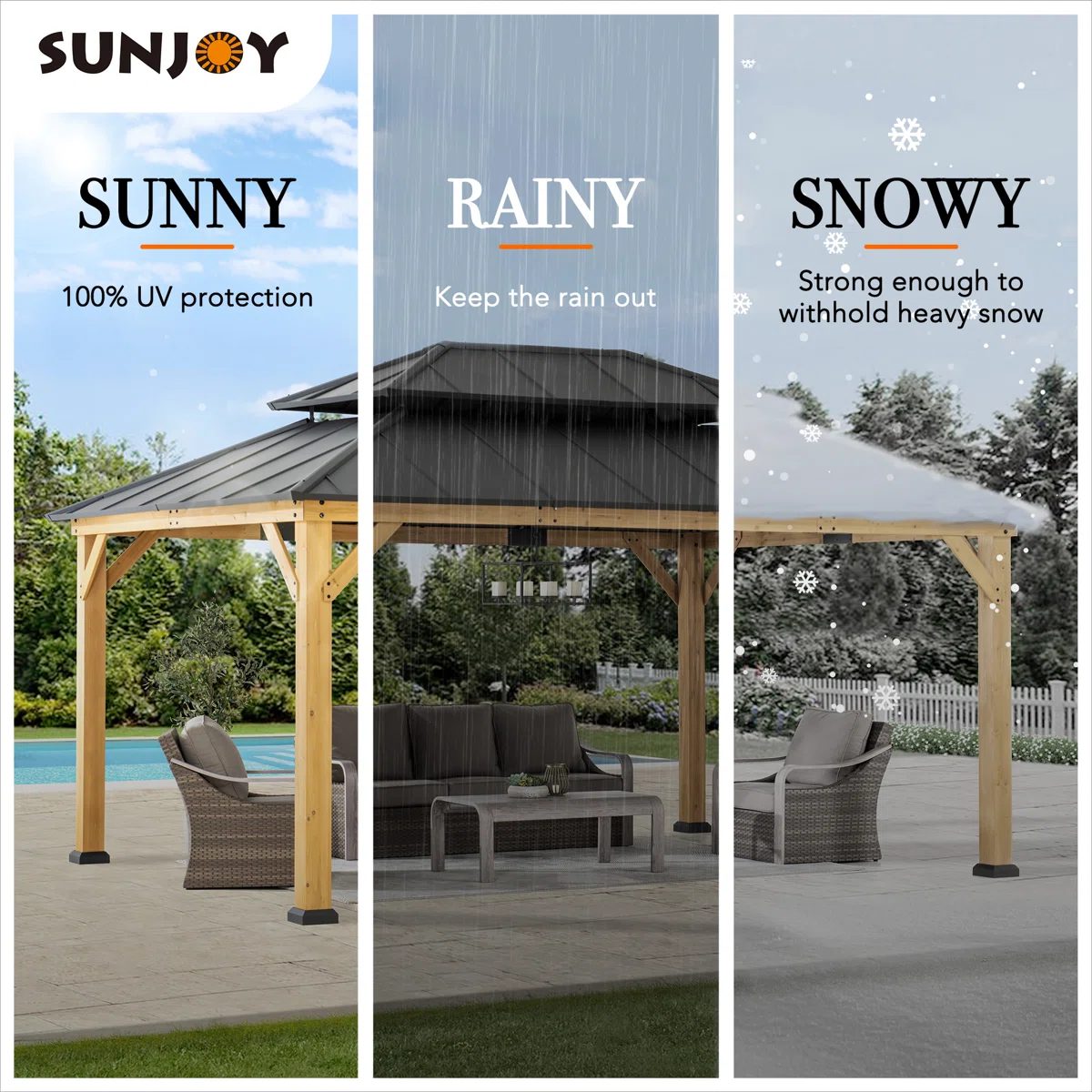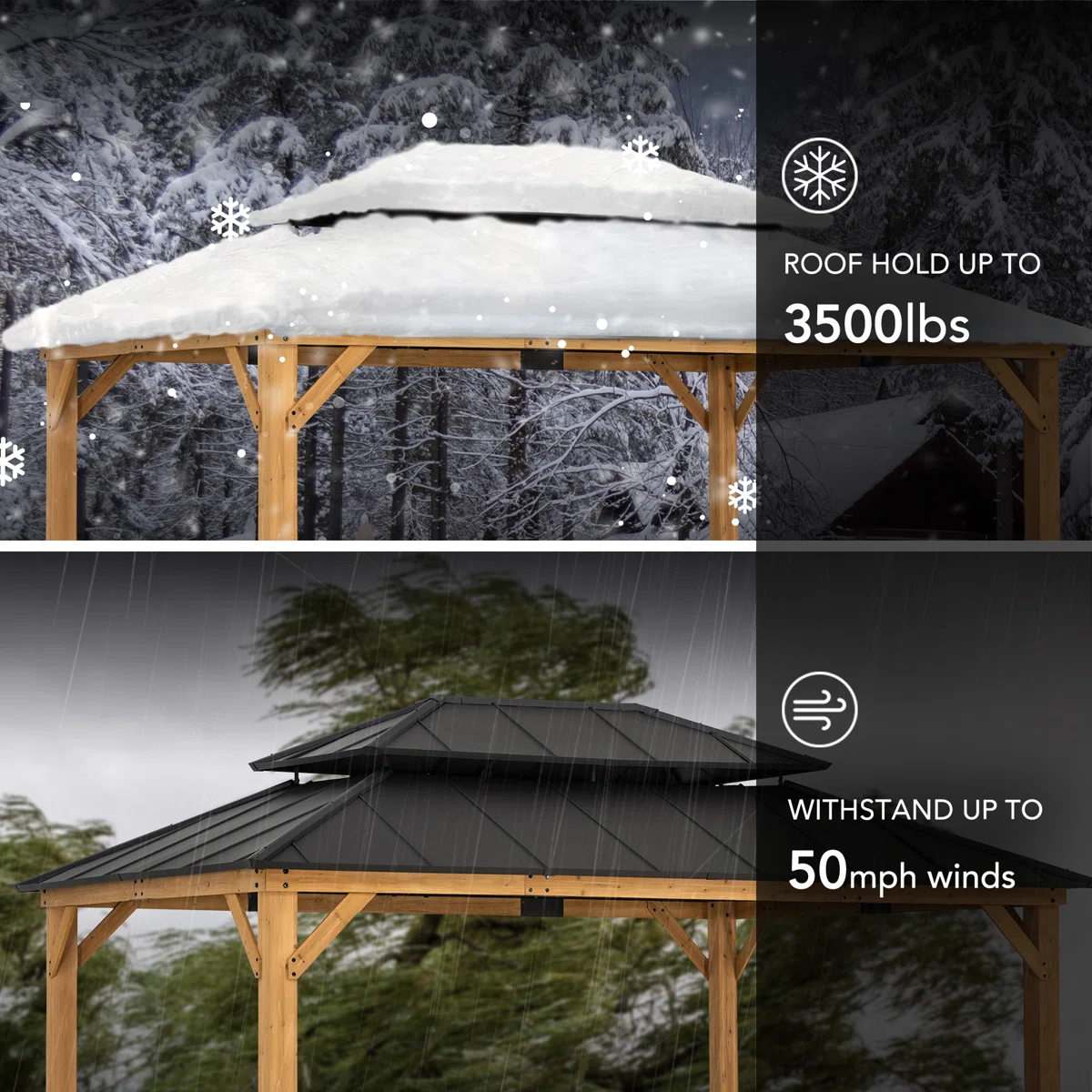 Product Type Patio Gazebo Design Patio Gazebo Portable No Footprint Shape Rectangular Frame Material Solid Wood Roof Type Hardtop Roof Material Steel Roof Included Yes Tiered Roof Yes Snow Load Capacity 3,500 lb. Wood Species Cedar Year-Round Use Yes Weather Resistant Yes UV Resistant Yes Water Resistant Yes Door or Opening Yes Imported Yes Paintable Yes Durability Water Resistant, UV Resistant, Weather Resistant