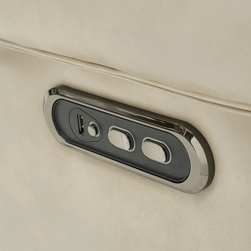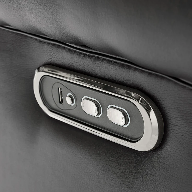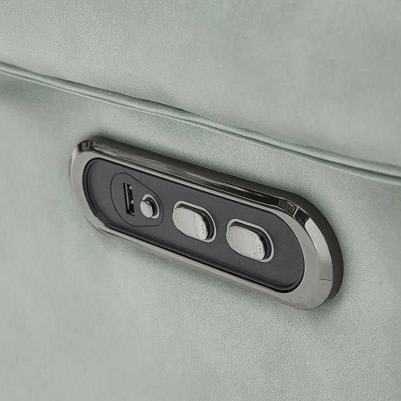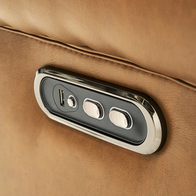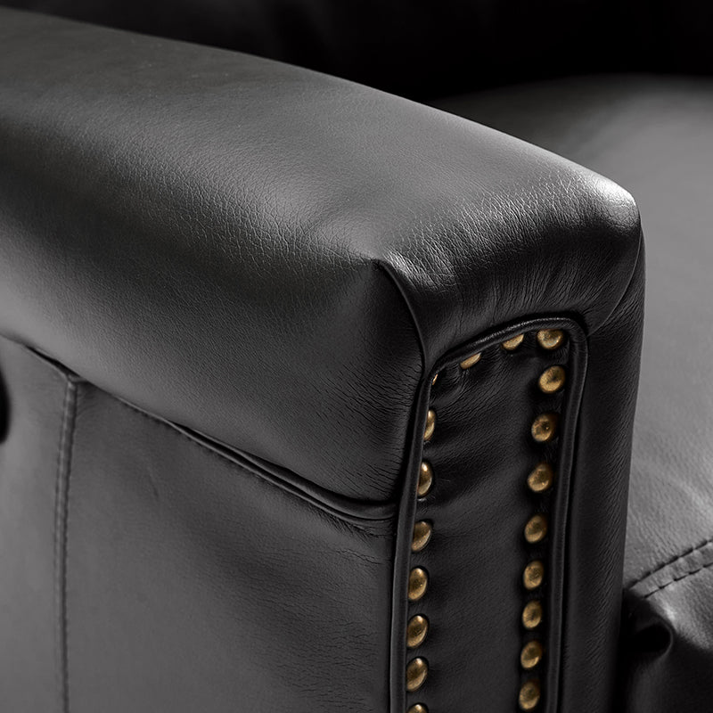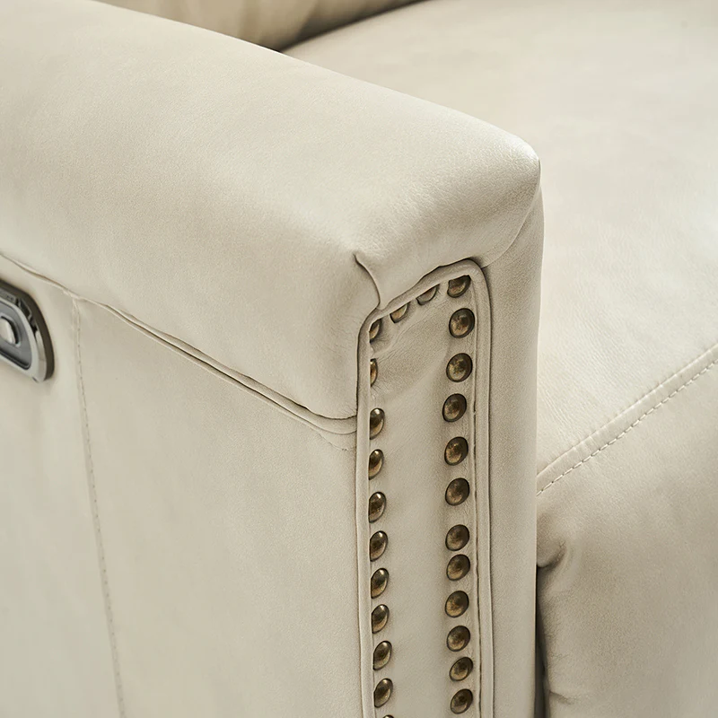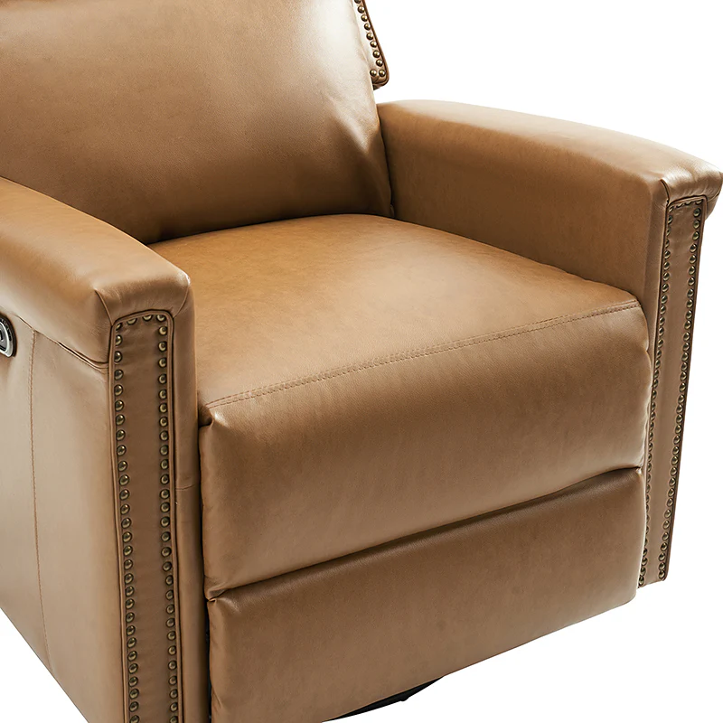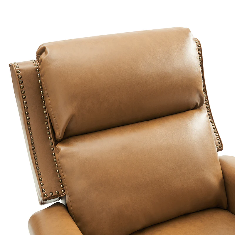 This recliner is designed for both the living room and bedroom, blending traditional and classical aesthetics. It features a vegan leather upholstery that enhances its sophisticated look. The recliner is equipped with an electric reclining system, including a motorized headrest for personalized comfort. The design of the recliner is accentuated with copper nailhead trim, adding a touch of elegance. The wingback style offers additional support and a classic appearance. This piece is suitable for those who appreciate the fusion of modern functionality with traditional charm in their home decor.