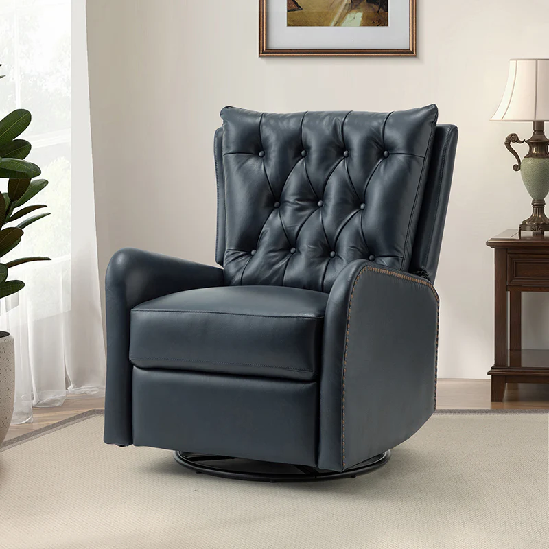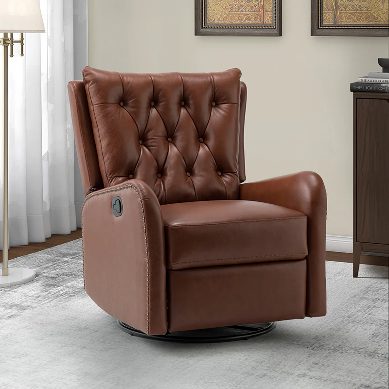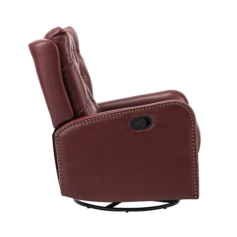 This eclectic glider recliner will match the decor of any room you have. Featuring a solid metal and wood frame construction, the black metal base of this nursery chair adds to the safety and stability and is strong enough to hold up to 250 pounds. The modest backrest provides support for your spine, the high-density soft foam padding and sinuous spring package provide great comfort, and the button-tufted design of the backrest makes your home more attractive and stylish. The armrest with nailhead trim adds a sense of sophistication and artistry. After a tiring day at work, you can simply pull the pull handle, push your body back and lie down easily while the footrest will pop up to provide a comfortable position for your feet. The excellent and sophisticated design of this recliner gives your house an immediate facelift and brings you plenty of compliments from guests and neighbors.