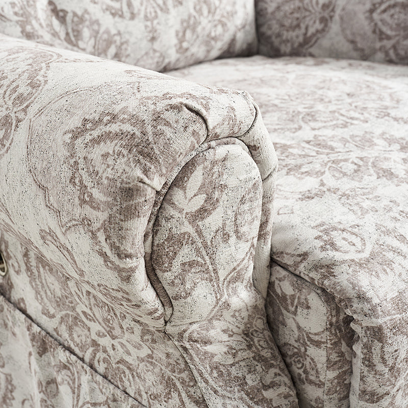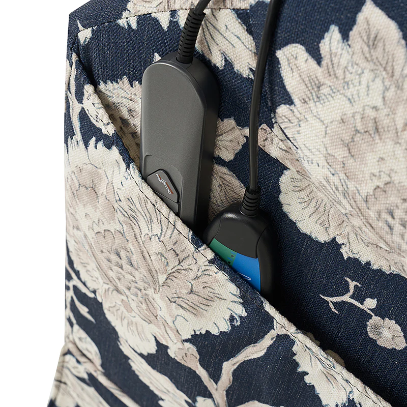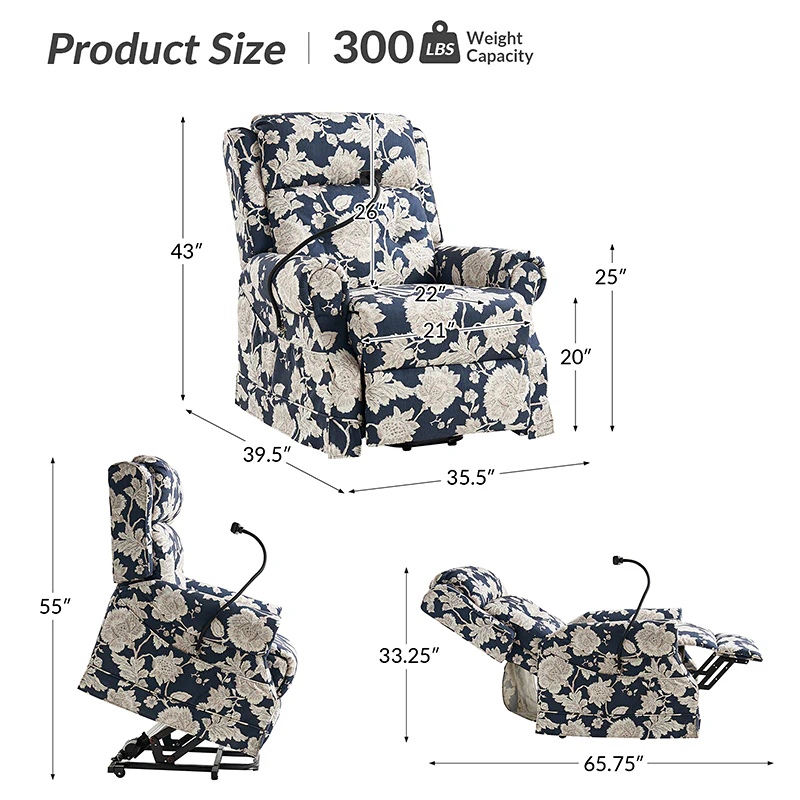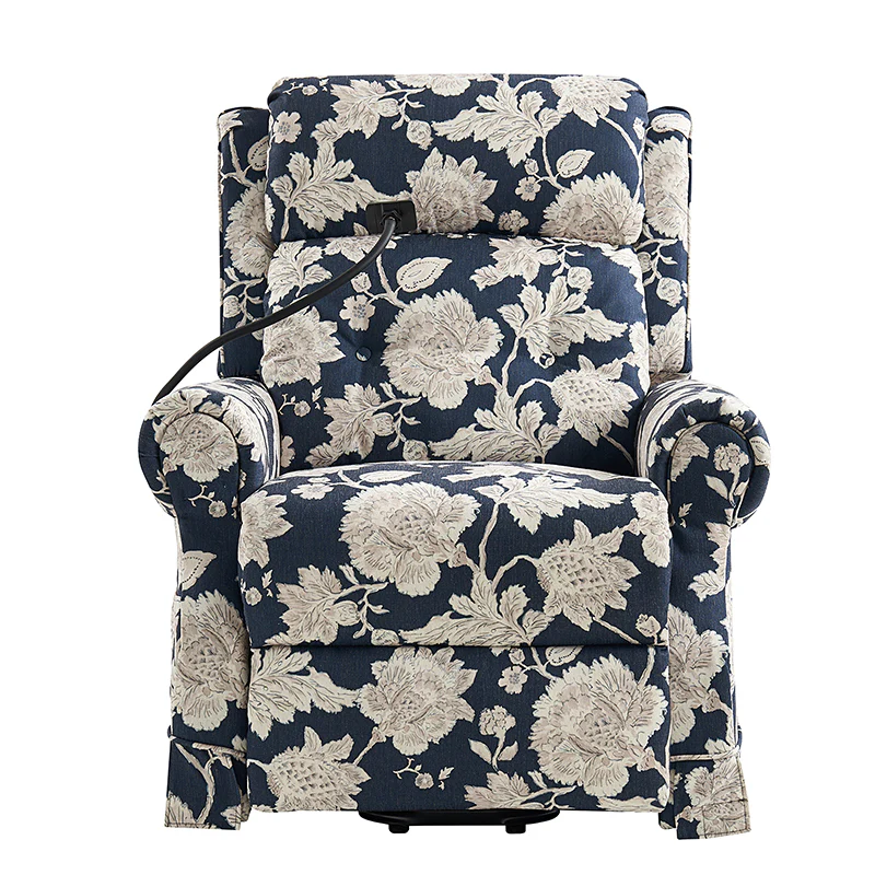 Presenting the relaxation hub for your living room, bedroom, or office, the farmhouse-style power recliner. This classic yet contemporary piece seamlessly blends rustic charm with modern convenience. Effortlessly adjust your seating position for comfort with its electric reclining mechanism. When assistance is needed to stand, rely on the lift assist feature for added support. Indulge in leisurely moments with built-in massage settings and comforting heat options. The universal wheel ensures smooth mobility while providing stability when locked in place. Stay connected with the adjustable mobile phone holder, allowing you to find a suitable viewing angle. Tailor your comfort with the manually adjustable headrest. Embrace the rustic appeal with its faux linen print and handy storage bag for your essentials. Plus, stay powered up with the integrated USB port, never worrying about a drained battery. Whether unwinding after a long day or catching up on tasks, this power recliner offers both relaxation and functionality in one stylish package.
