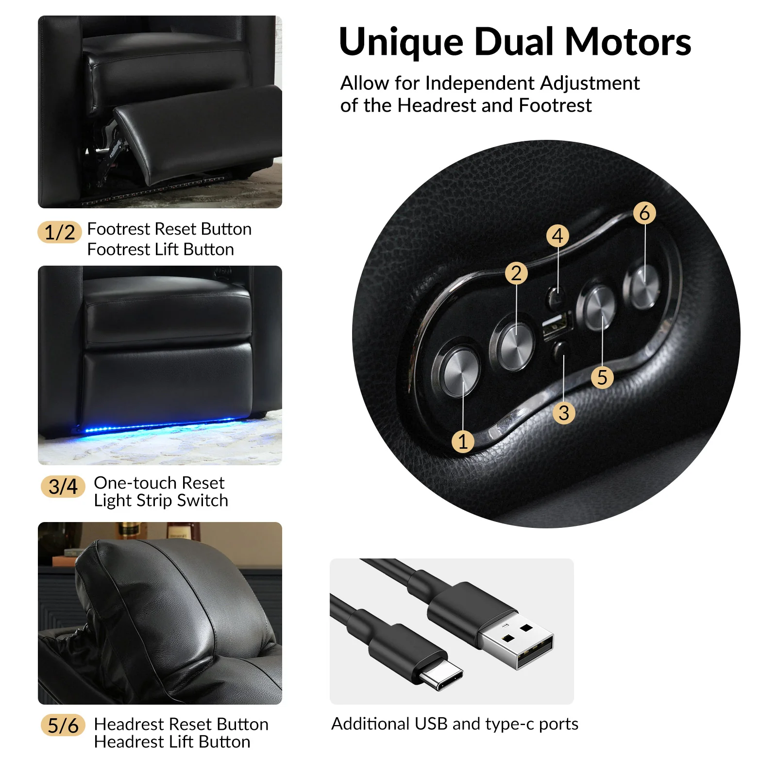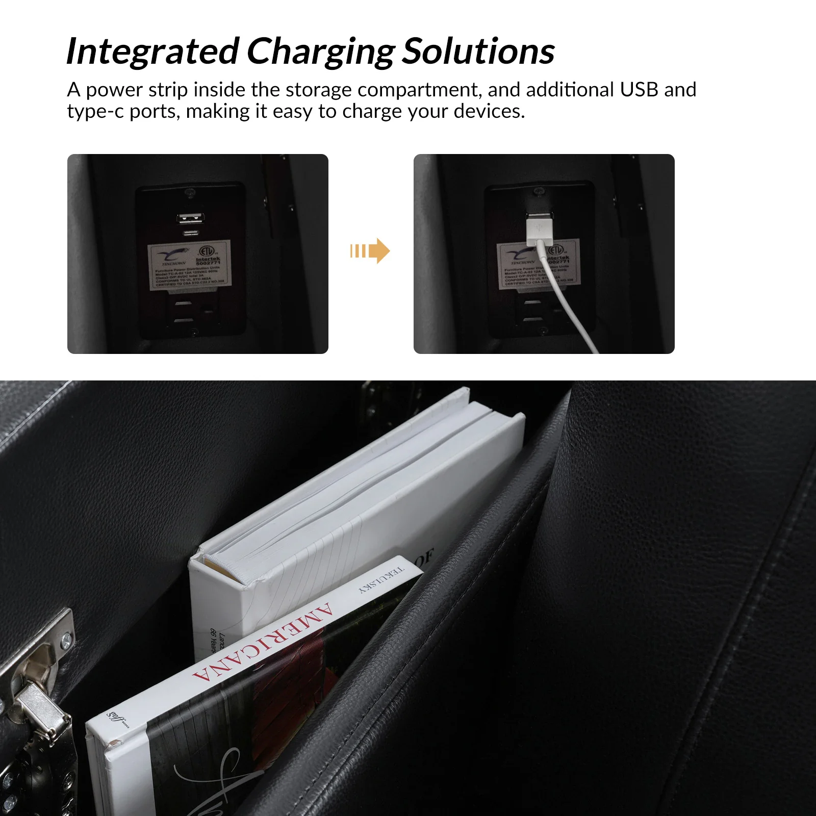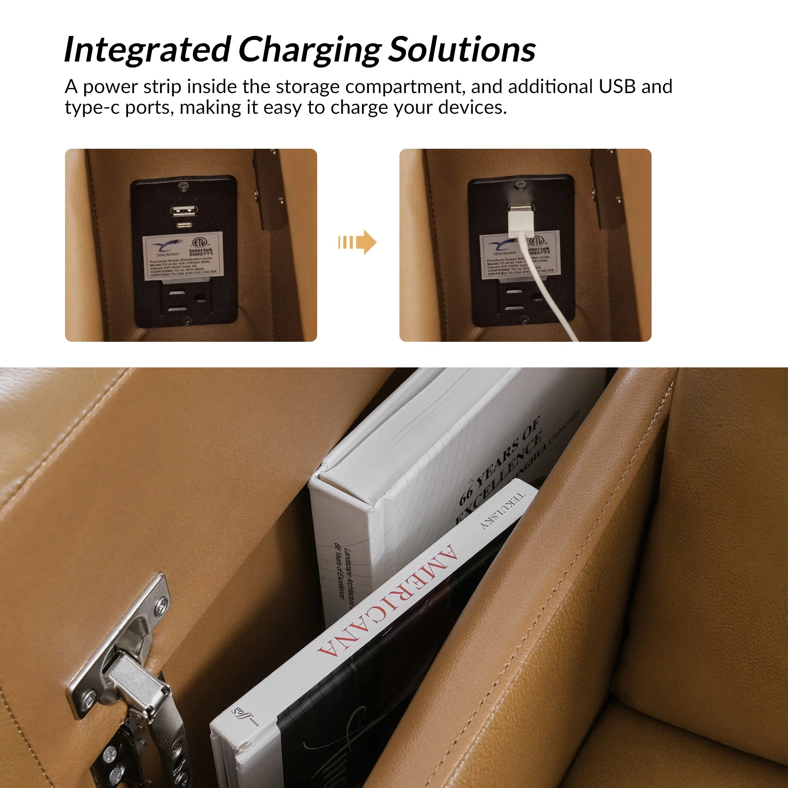 This transitional-style electric recliner features adjustable angles and locking mechanisms, allowing you to easily find and secure your preferred seating position. With a single button, you can return to the default position effortlessly. Designed for relaxation, the recliner includes an electric headrest to support your head and neck while watching movies. The armrest provides convenient storage for a small table, phone holder, and tablet, keeping all your entertainment essentials within reach. Integrated charging options include button-activated USB charging, a power socket in the storage compartment, and USB and type-c ports for your electronic devices. Enjoy your beverages with the cup holder, which can be flipped to hold coffee cups. Enhance your viewing experience further with the one-touch illuminated cup holder and base frame ambient lighting, creating the atmosphere for movie nights.