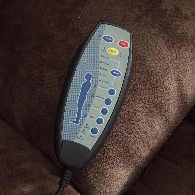 - The chair's lifting function is controlled by a button next to the armrest, and the remote control is used to control the massage heating function.