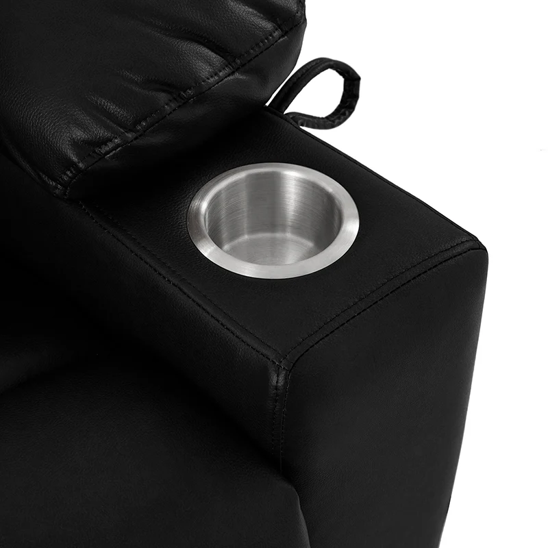 Practical features include two cup holders for convenient access to beverages, armrest storage with built-in USB and type-C ports for charging electronic devices, and ample space for storing a small blanket. Side pockets provide additional storage options. The extended footrest is designed to reduce heel pressure, accommodating even users taller than 6 feet. The hand controller, featuring a hanging strap, ensures easy access.