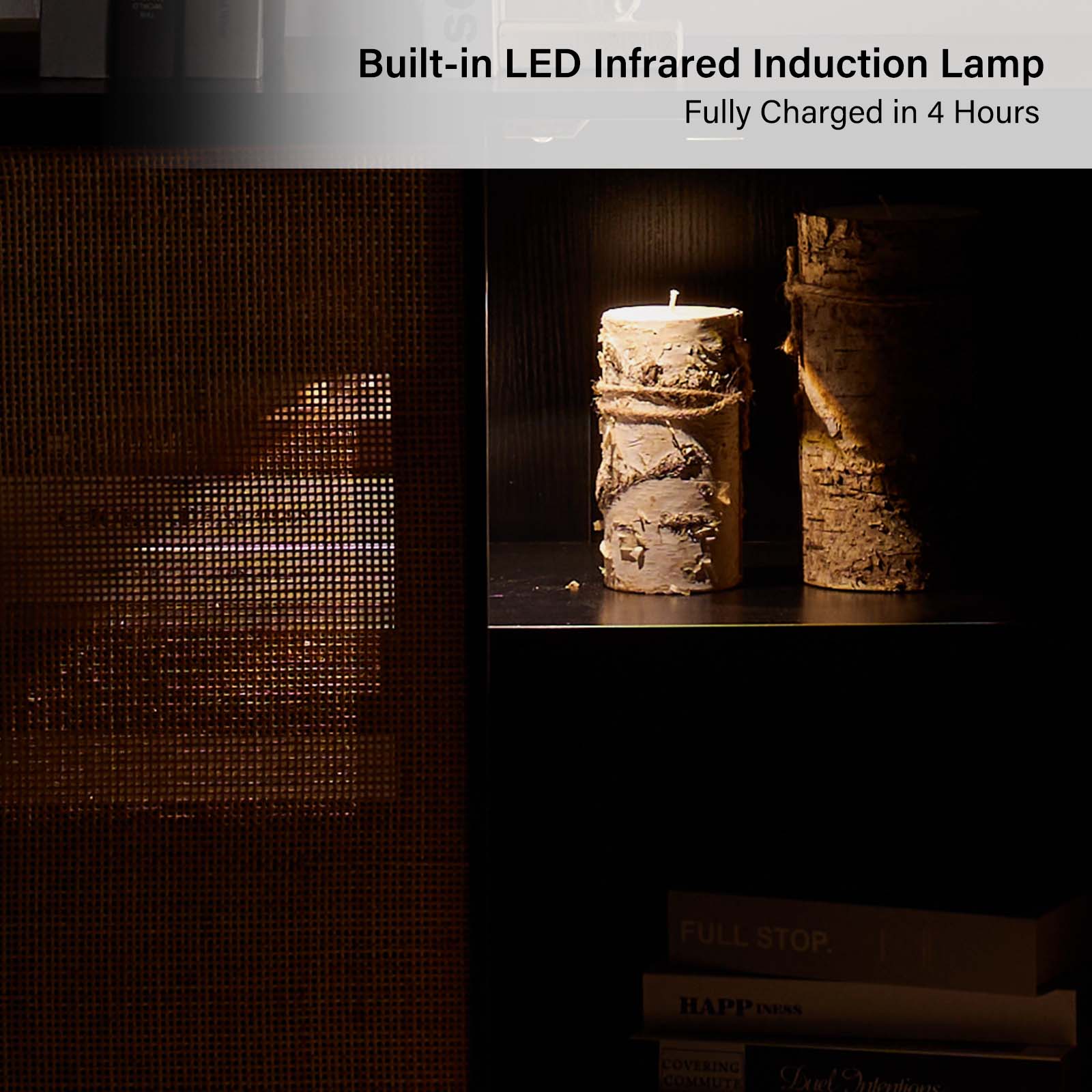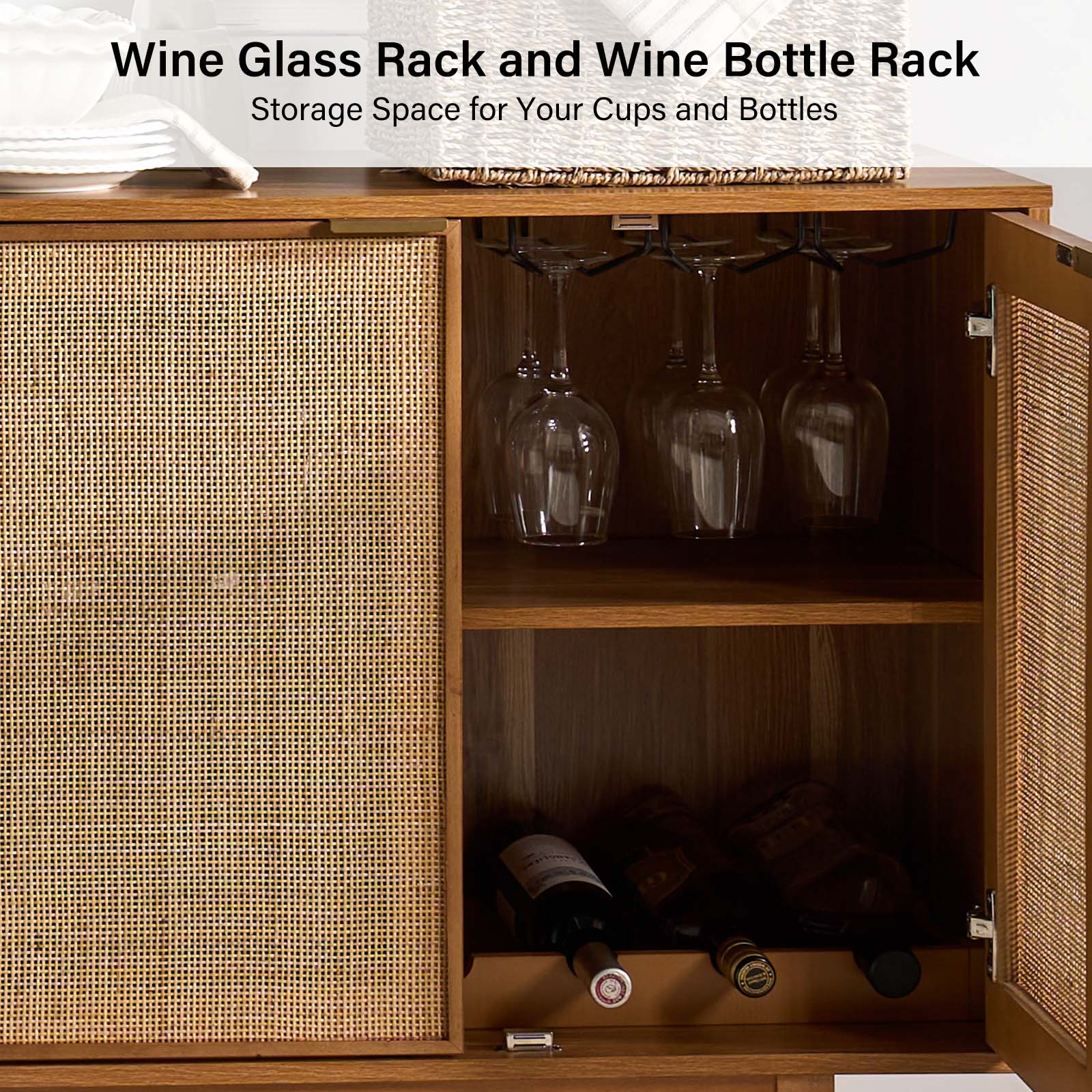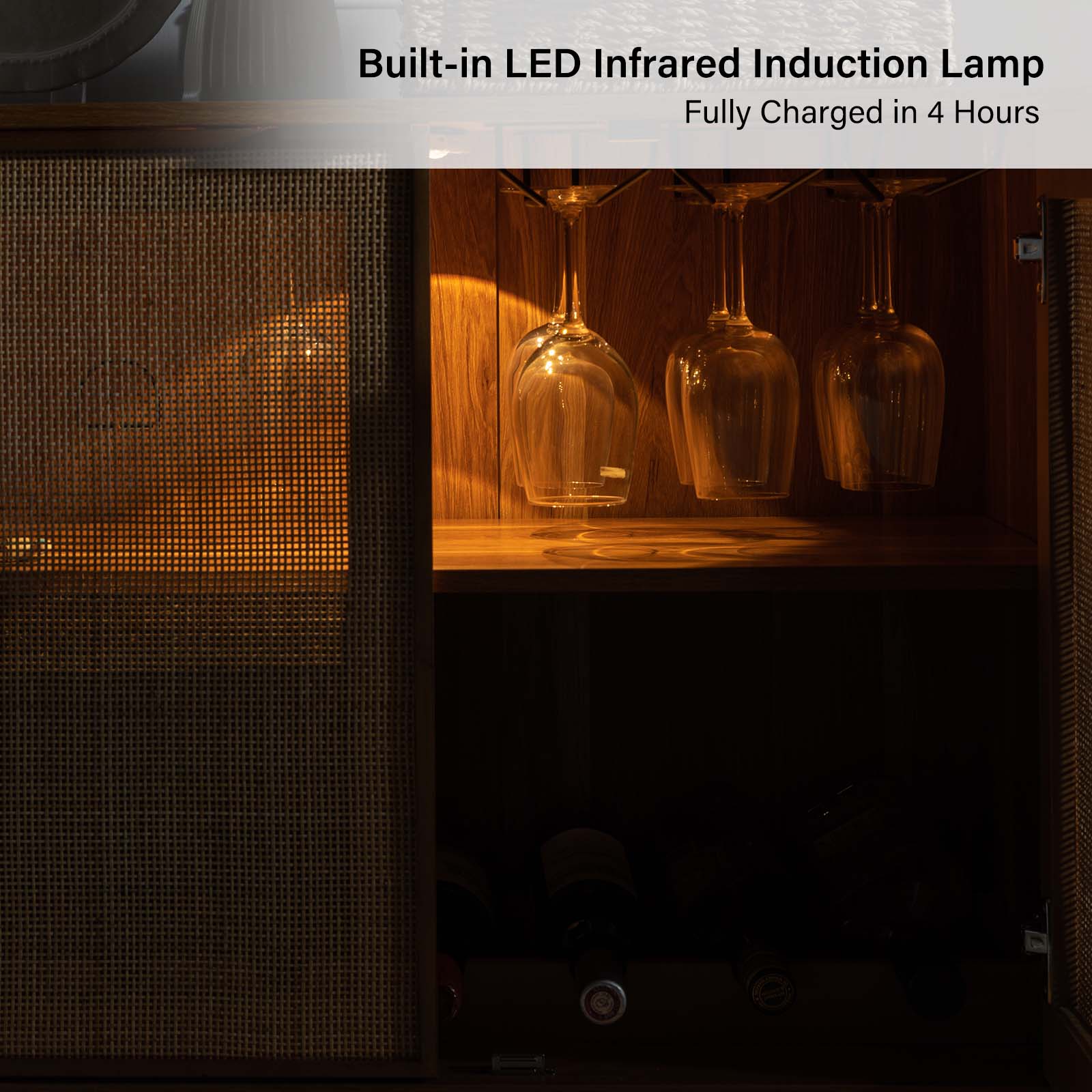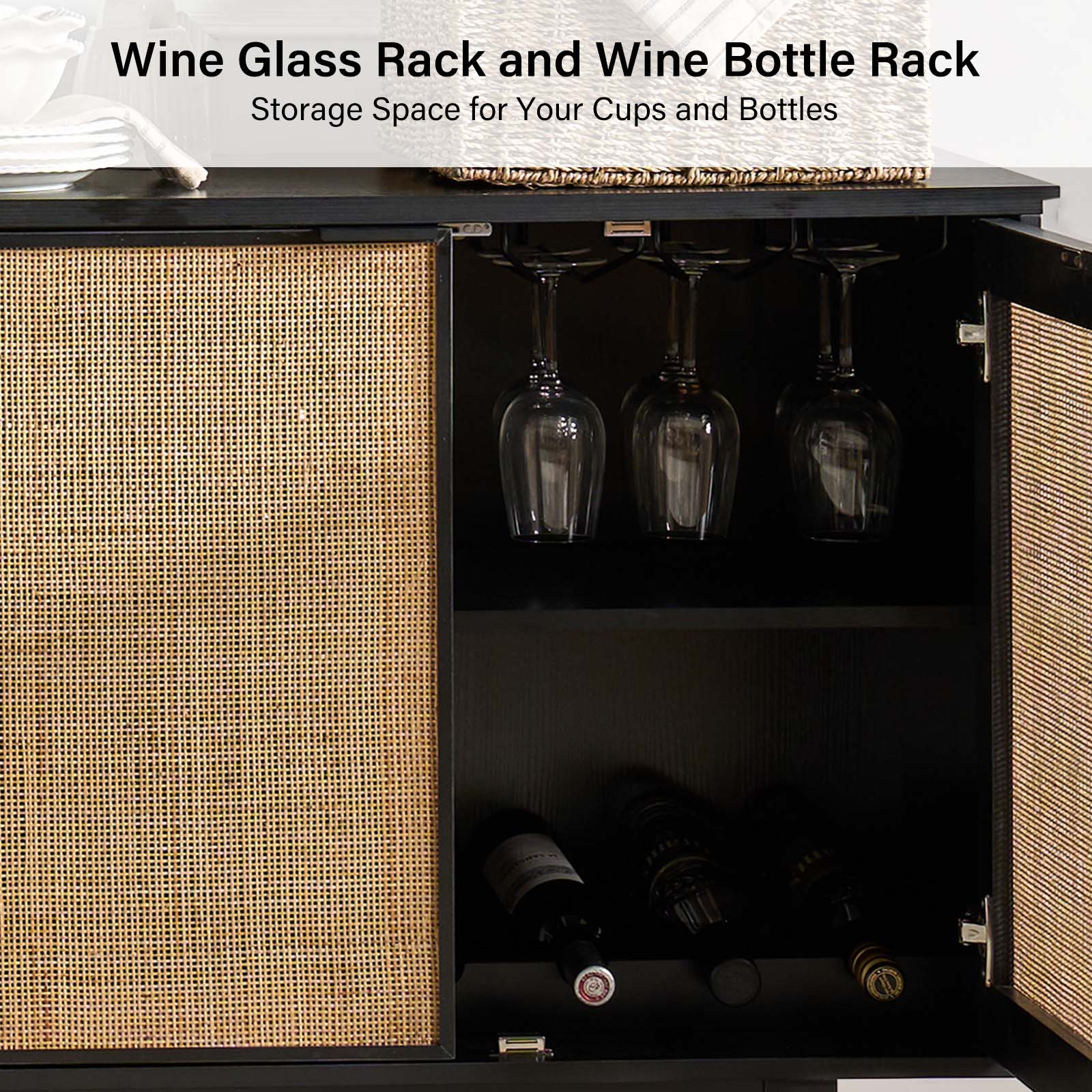 Elevate your living space with this 4-door contemporary sideboard, a harmonious blend of modern flair and farmhouse charm. This versatile gem transforms seamlessly from a modern storage credenza to a 4-door TV console, meeting your evolving needs with grace. Crafted with exquisite attention, it boasts natural rattan netting that dances amidst its clean lines, while solid wood legs ensure stability and finesse. Indulge in its multi-scenario use, from showcasing your prized wine bottles and cups to organizing your entertainment essentials. Adjust the shelf to perfection, basking in the ambiance of the built-in LED infrared induction lamp, fully charged in 4 hours with a detachable 1000 mAh lithium battery. Plus, revel in seamless cable management, a nod to modern convenience. This sideboard epitomizes function and artistry, enhancing every facet of your contemporary lifestyle.